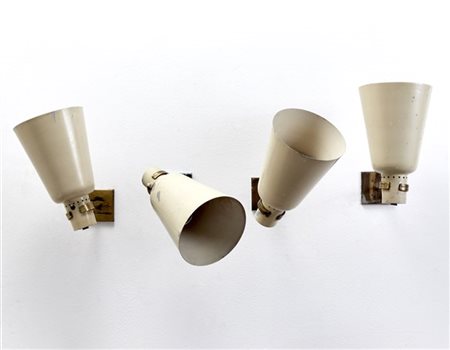Lotto composto da quattro lampade da parete in metallo verniciato creme e ottone. Italia, anni '50. (cm 16x26,5x27) (lievi difetti e mancanze)