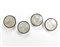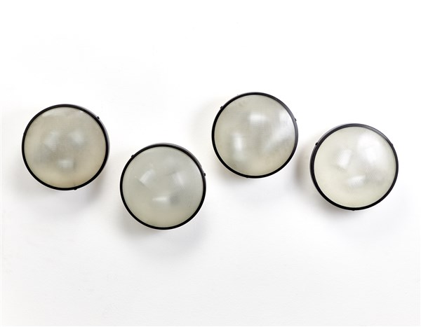 Quattro plafoniere modello "3005-50/PX". Produzione Arteluce, Milano, 1953. Struttura in alluminio verniciato bianco e nero, paralume in metacrilato. Recante etichetta adesiva del produttore. (d cm 50) (lievi difetti)