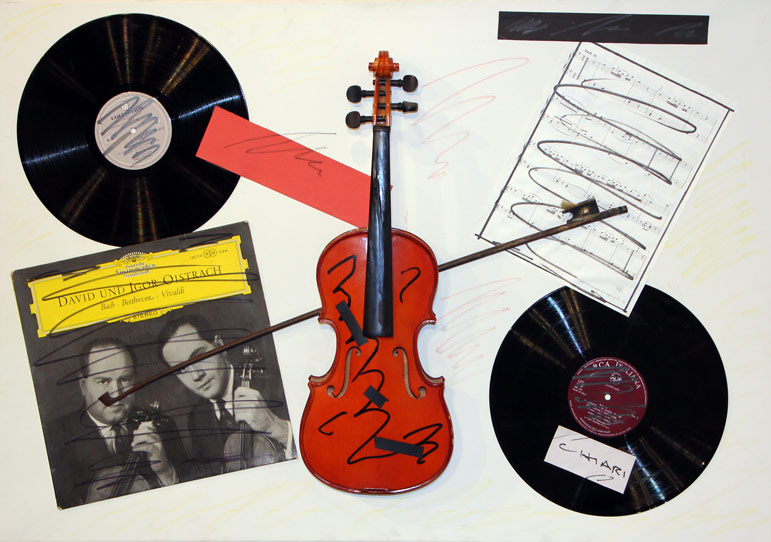 CHIARI Giuseppe (Firenze 26/09/1926 - Firenze 10/05/2007) Senza titolo violino, dischi e tecnica mista su tela cm. 70 X 100 Firma 'Chiari' (in basso a destra) Autentica dell'Archivio Giuseppe Chiari, con n° 429, in data Firenze, 03/03/2009