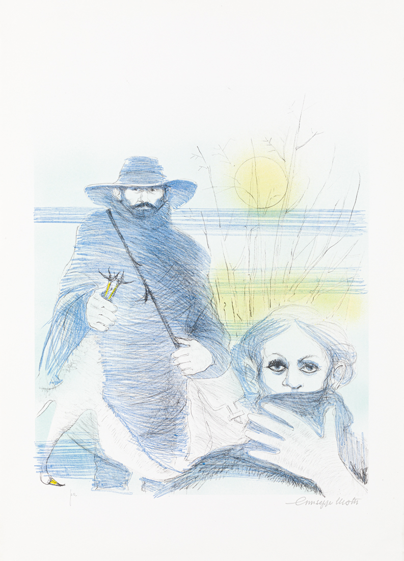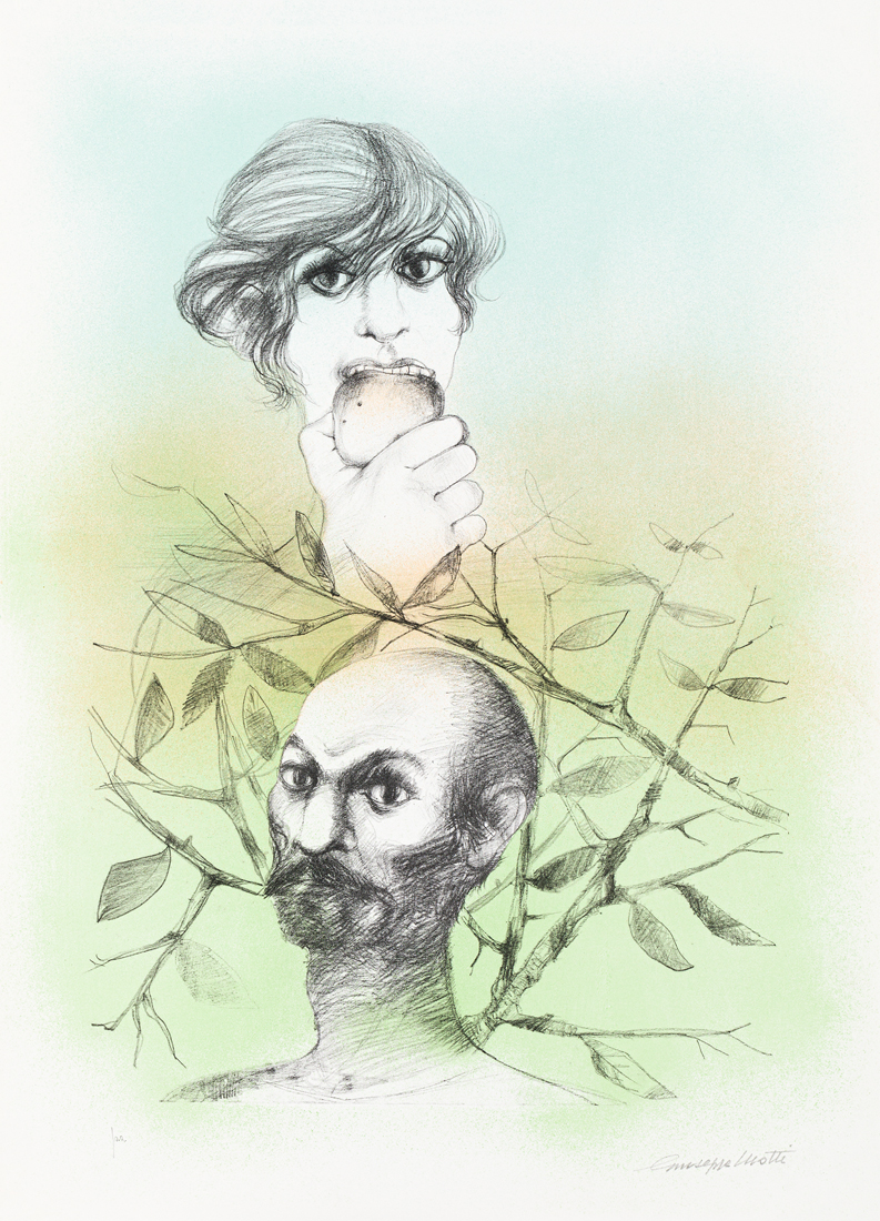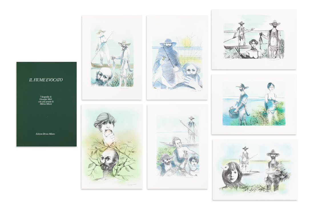 Cartella contenente testo di presentazione di Giuseppe Motti, una poesia di Milena Milani e 7 litografie di Giuseppe Motti, ciascuna recante firma e numerazione (Esemplare P.A.) a matita al fronte
