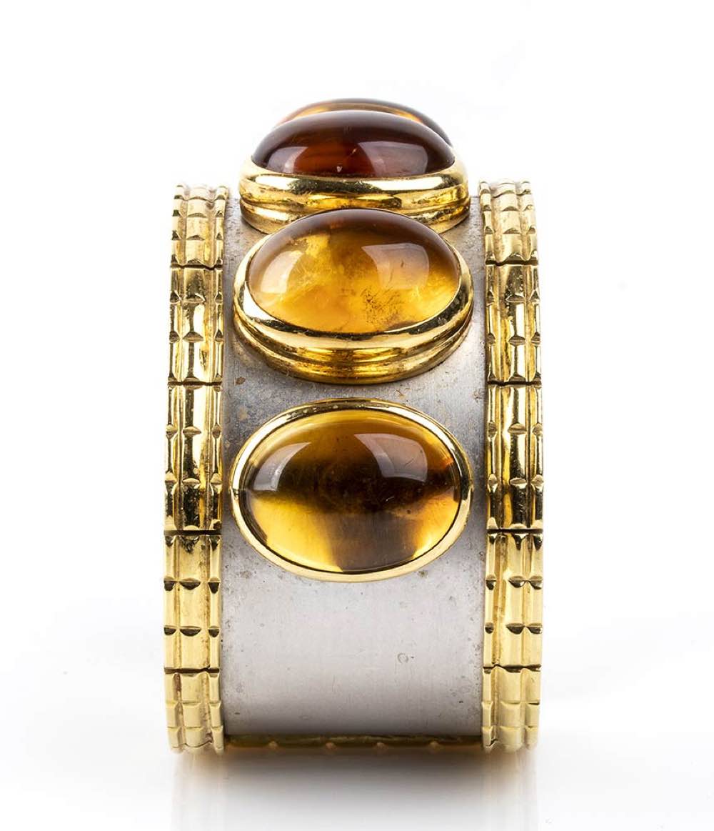 oro giallo 18k ed acciaio, incastonato con linea di 5 cabochon di quarzo citrino. Dimensioni fronte 75 x 35 mm, diametro interno 55 mm. Peso 183 gr. Stato di conservazione: ***** eccellente.