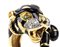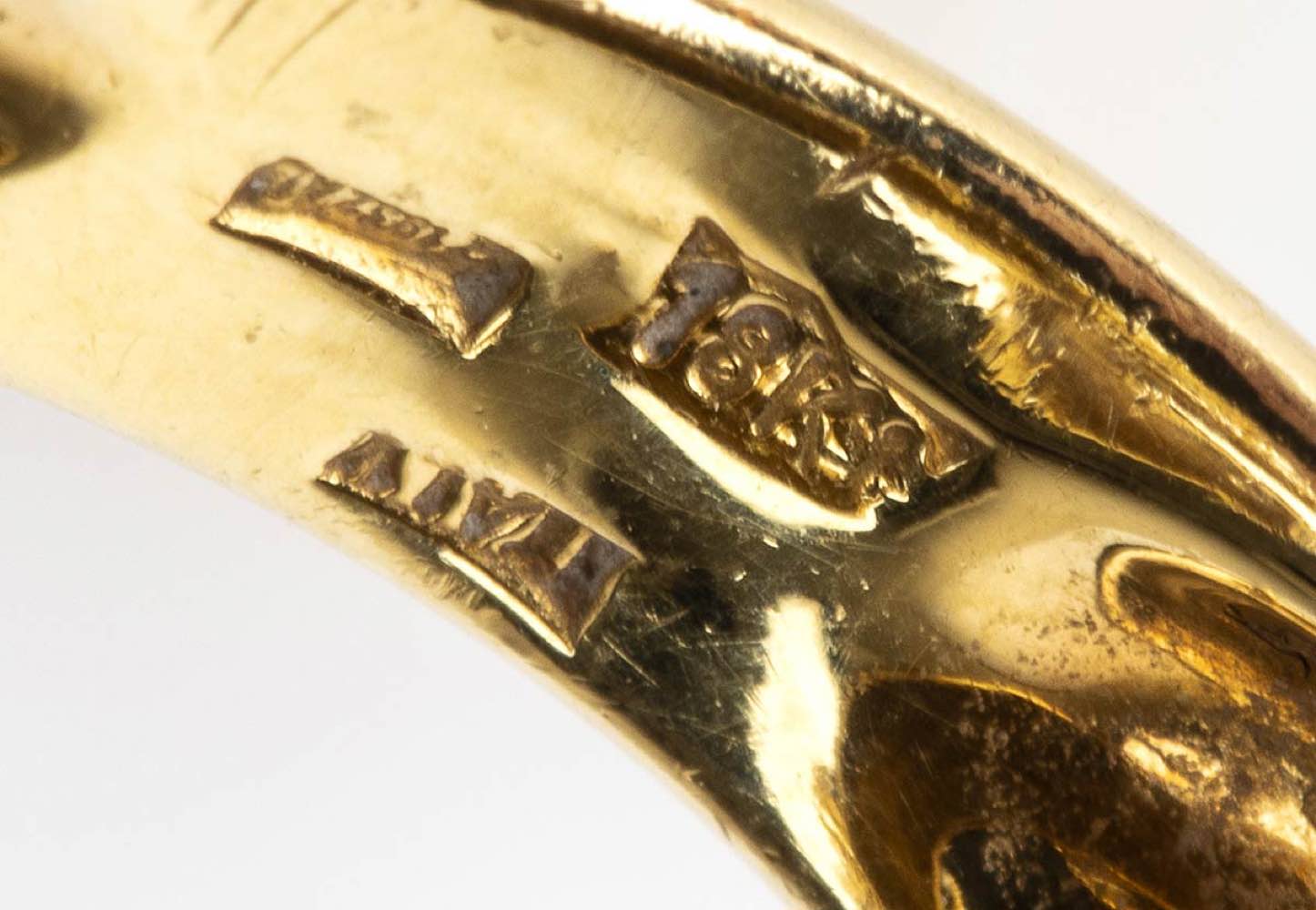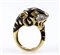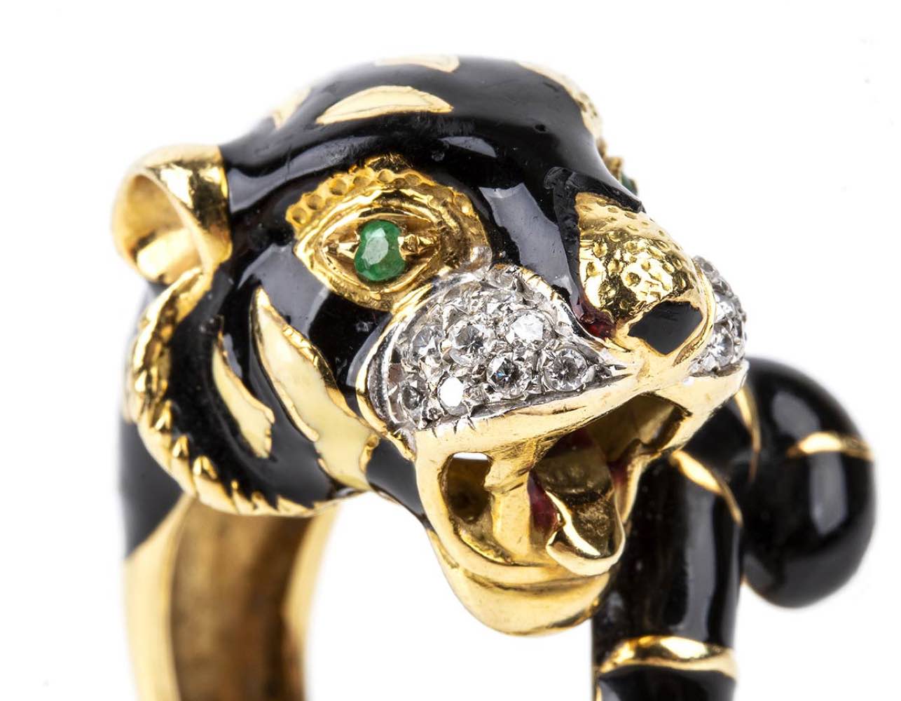 oro giallo 18k, sulla sommità una testa di pantera impreziosita sul muso da diamanti taglio brillante 0,22 ct circa, H, VVS-VS, occhi in piccoli smeraldi, corpo decorato con applicazione di smalto. Punzonato "18K", "ITALY" e "1932 AL". Dimensioni fronte 27 x 25 mm. Peso 21 gr. Misura IT 16,5 - Misura US 8. Stato di conservazione: ***** eccellente.