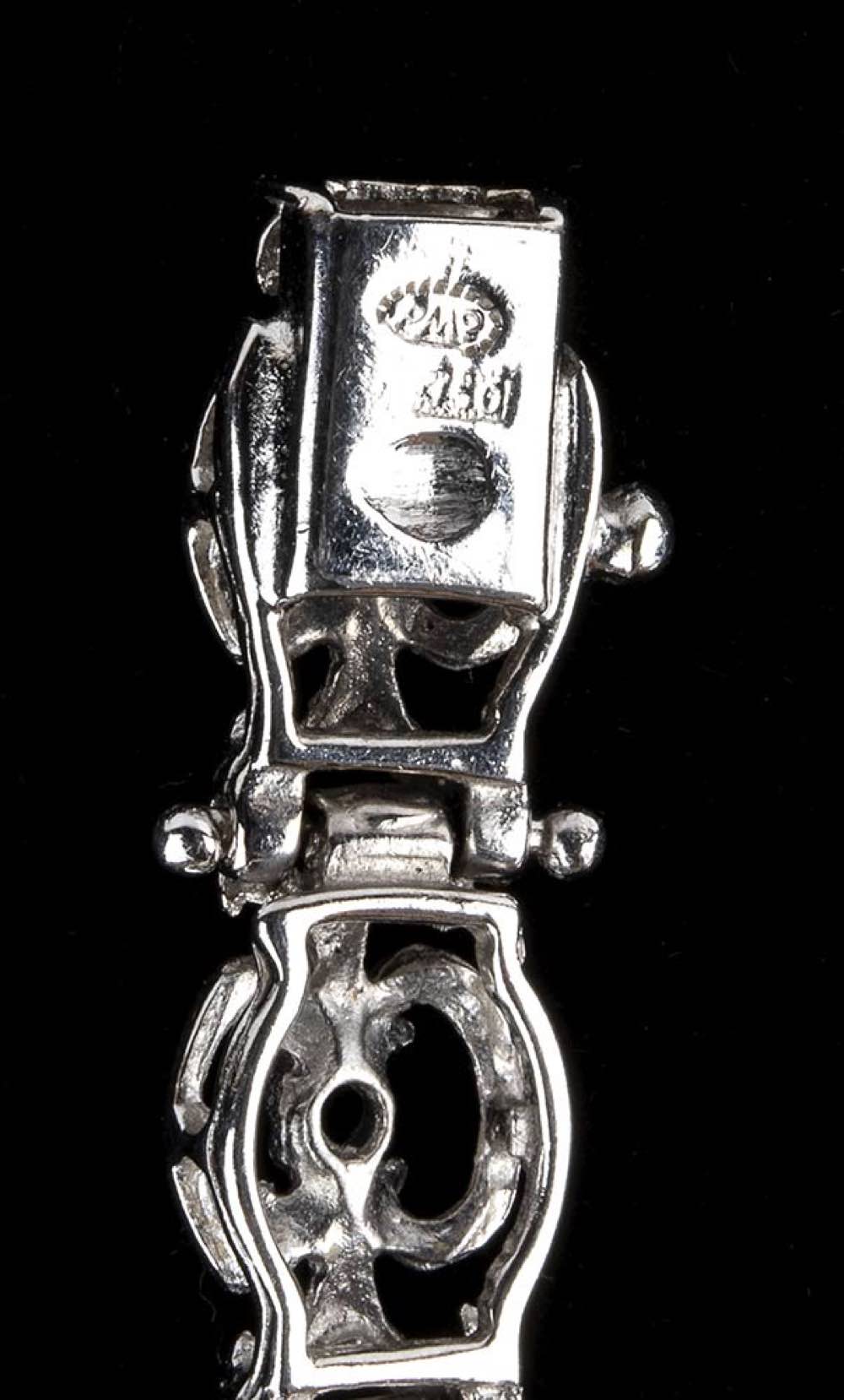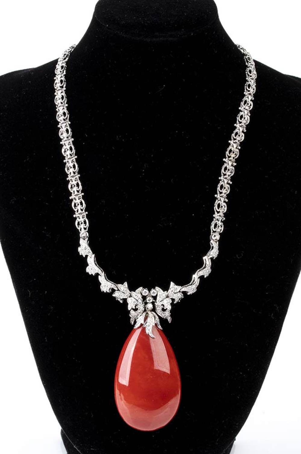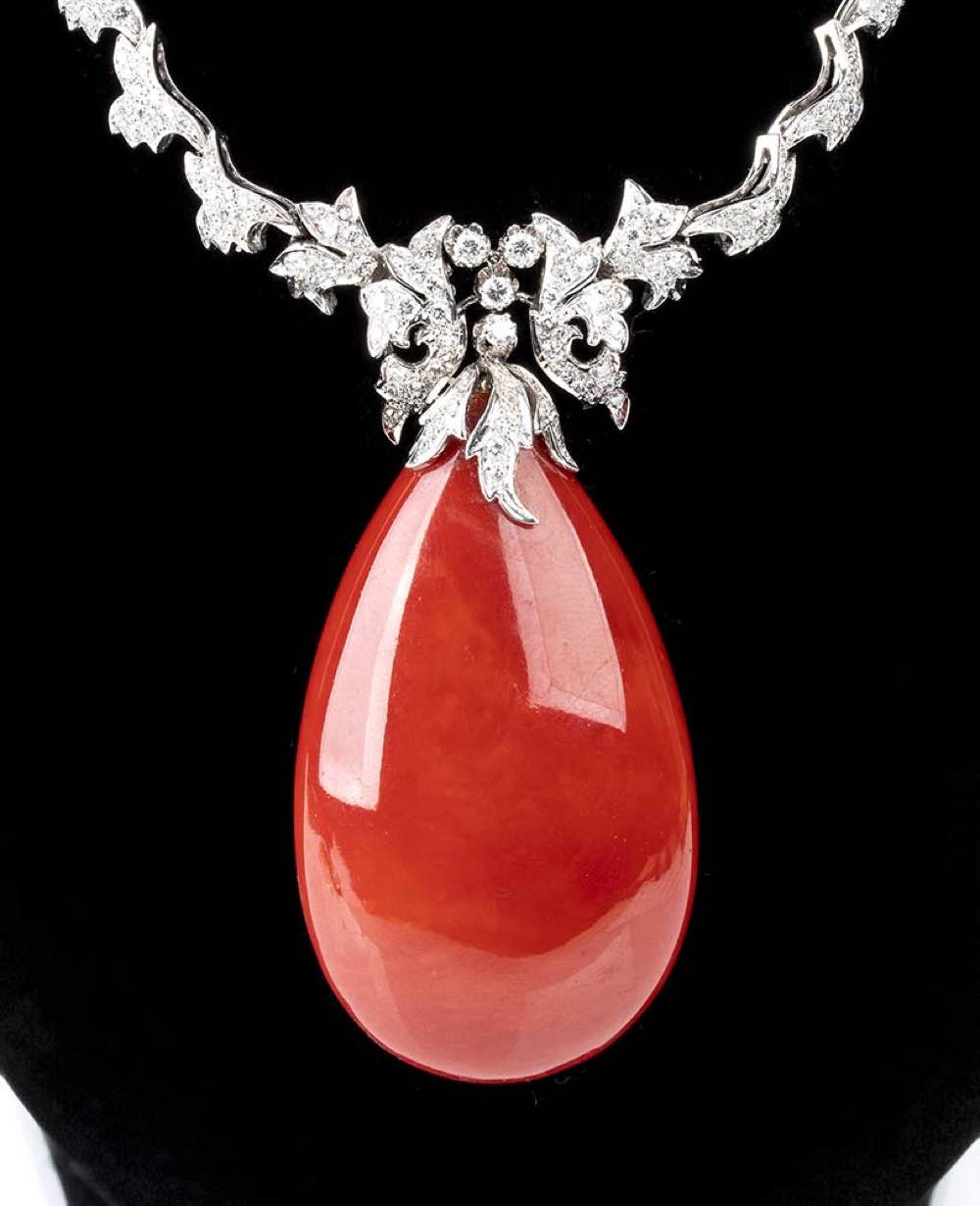 oro bianco 18k, sezione centrale a motivi vegetali in diamanti e goccia di corallo Aka (corallium japonicum). Diamanti taglio brillante 3,10 ct circa, G-H, VS-SI. Punzonato "837 NA". Lunghezza 42 cm, dimensioni corallo 60 x 35 mm. Peso 84 gr. Stato di conservazione: ***** eccellente.