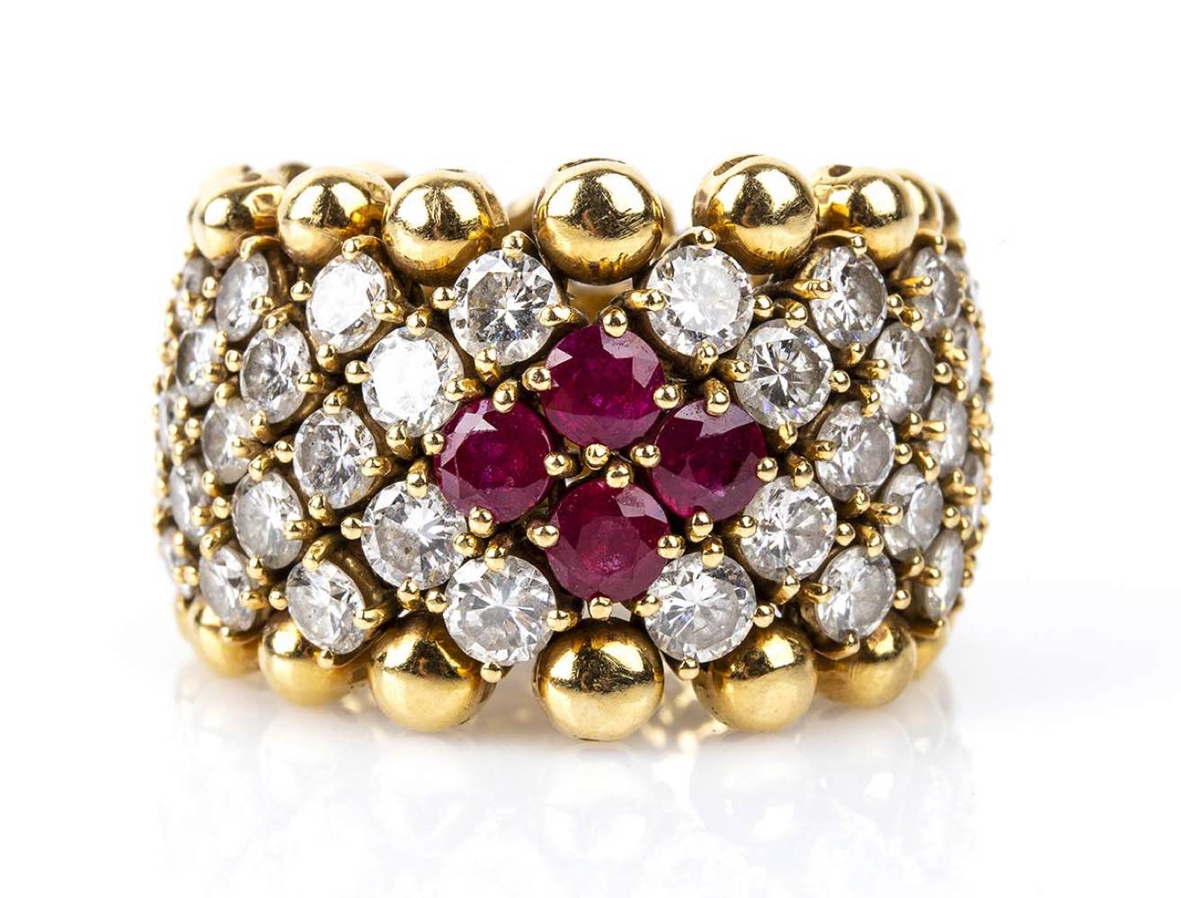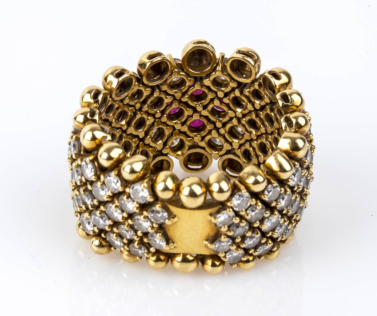 oro giallo 18k, a fascia morbida, incastonato con rubini 1,00 ct circa e diamanti taglio brillante 6,60 ct circa totali, F-G, VVS. Punzonato "750". Dimensione fronte 33 x 18 mm. Peso 19,7 gr. Misura IT 20 - Misura US 9. Stato di conservazione: ***** eccellente.