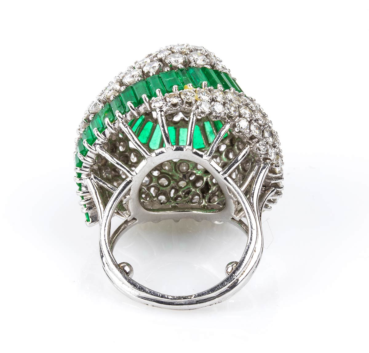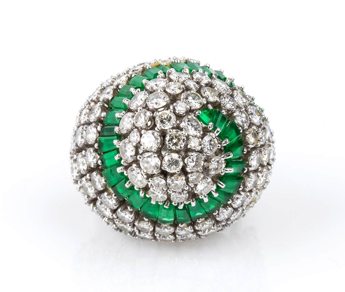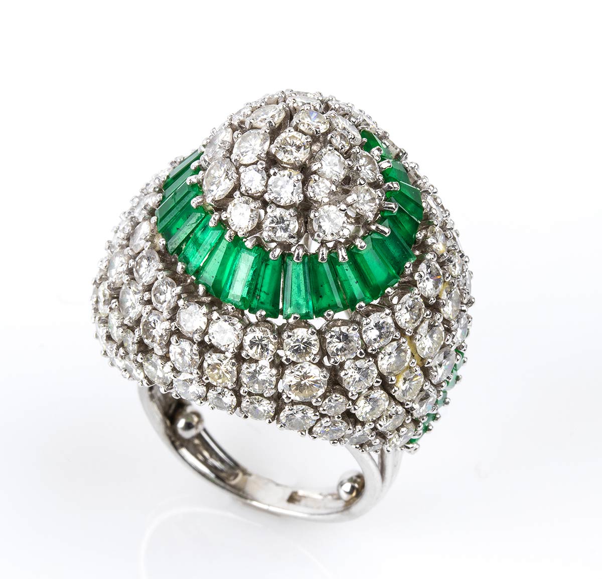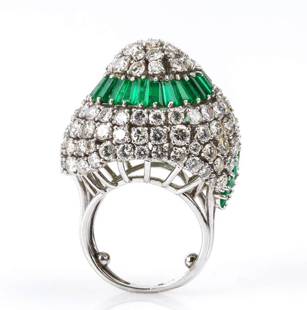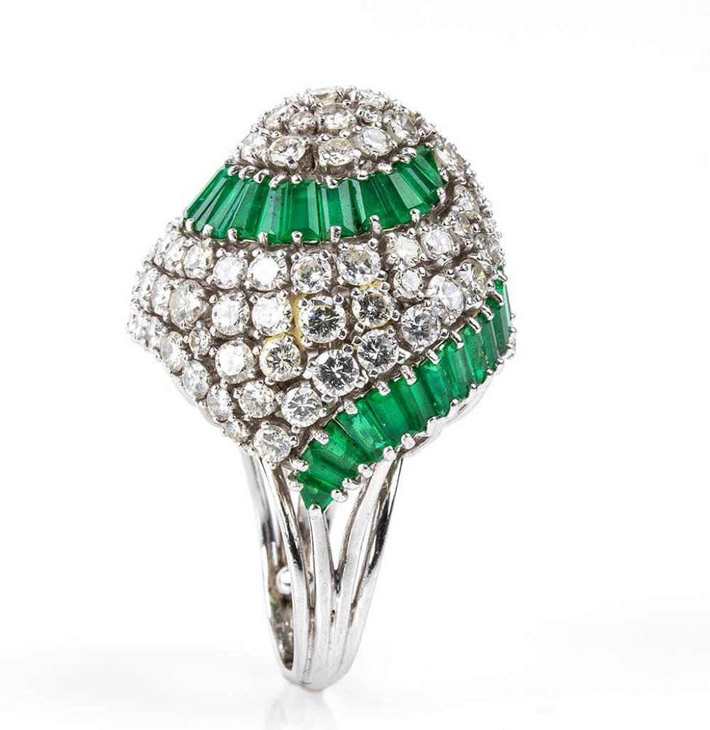 platino 950, modellato come una cupola, incastonato con motivo a spirale in smeraldi taglio tapered 6,50 ct circa e diamanti taglio brillante 8,20 ct circa, E-F, VVS. Punzonato "PLAT". Dimensioni 30 x 26 mm. Peso 28,2 gr. Misura IT 9, Misura US 5. Stato di conservazione: ***** eccellente.