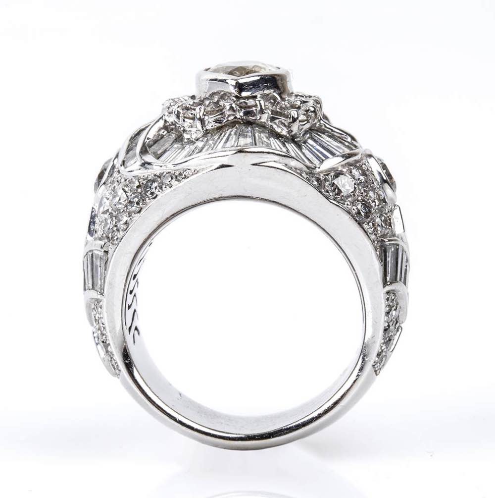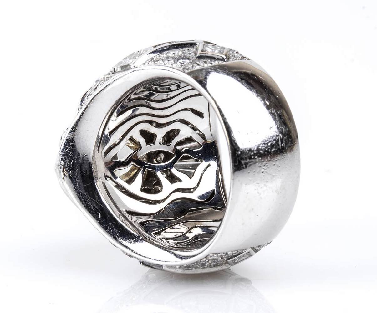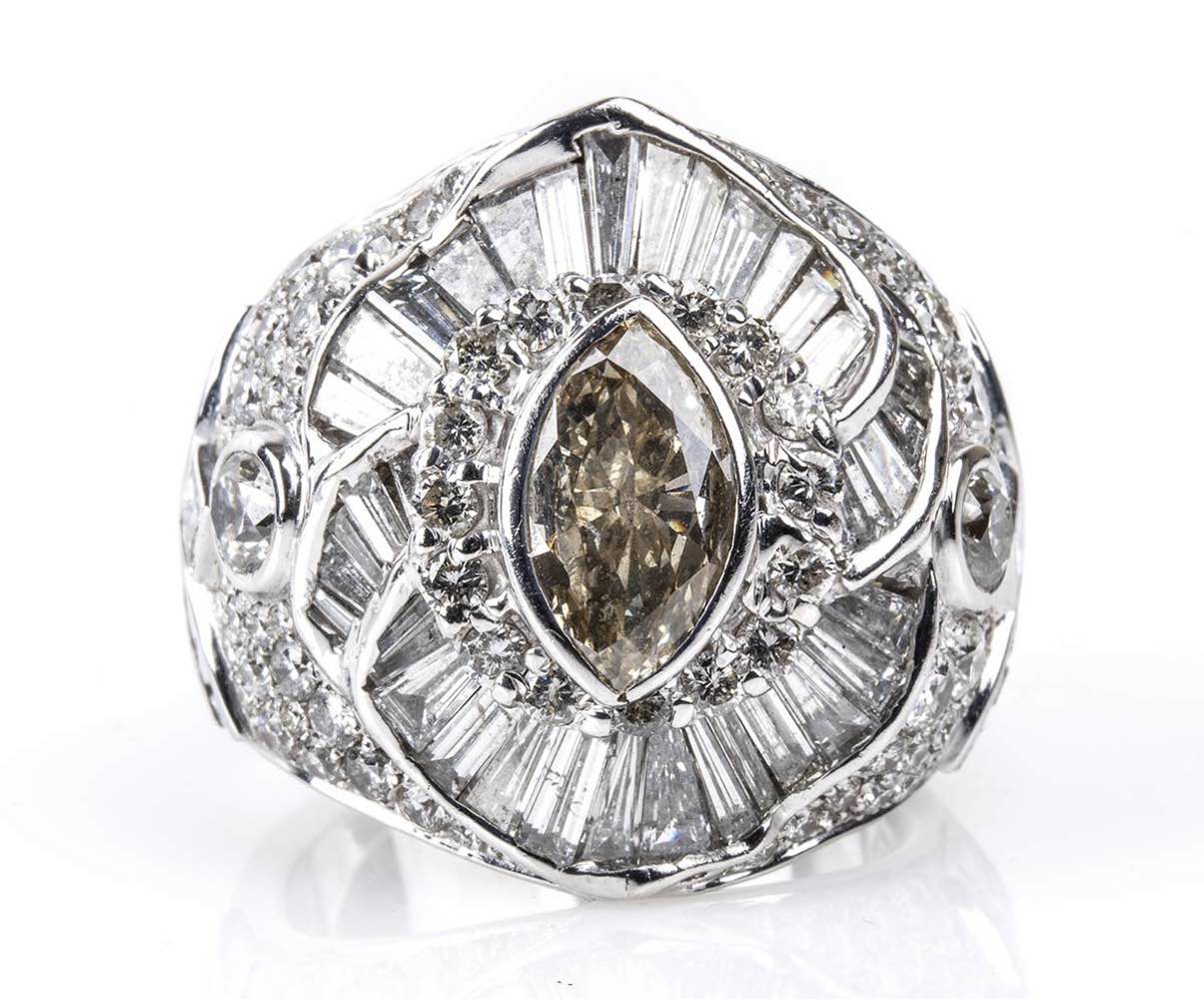 oro bianco 18k, incastonato con diamante a navetta 1,80 ct circa, colore fancy giallo bruno, purezza I1, contornato da altri diamanti taglio brillante e taglio tapered 7,20 ct circa, F-G, SI. Dimensione fronte 30 x 28 mm. Peso 26 gr. Misura IT 20 - misura US 9. Stato di conservazione: ***** eccellente.