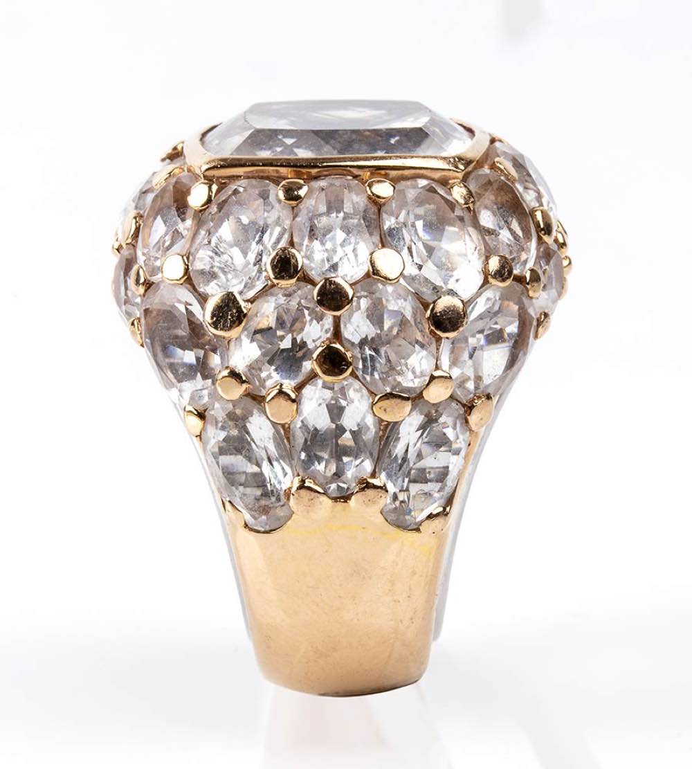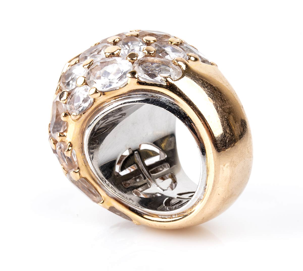 oro bianco e giallo 18k, modellato come una larga fascia, incastonato con grande cristallo di rocca centrale affiancato da pave' di altri cristalli di rocca disposti sui lati della montatura. Dimensioni fronte 33 x 25 mm. Peso 39,20 gr. Misura IT 17,5 - Misura US 8,5. Stato di conservazione: ***** eccellente.