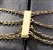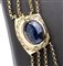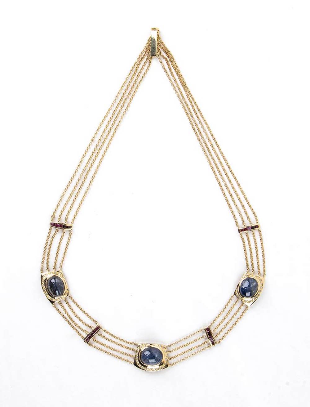 oro giallo 18k, con zaffiri taglio cabochon per complessivi 27,00 ct circa, rubini taglio carré 0,65 ct circa e diamanti taglio huit-huit 0,65 ct circa. Lunghezza 52 cm, larghezza 20 mm. Peso 50 gr. Stato di conservazione: ***** eccellente.