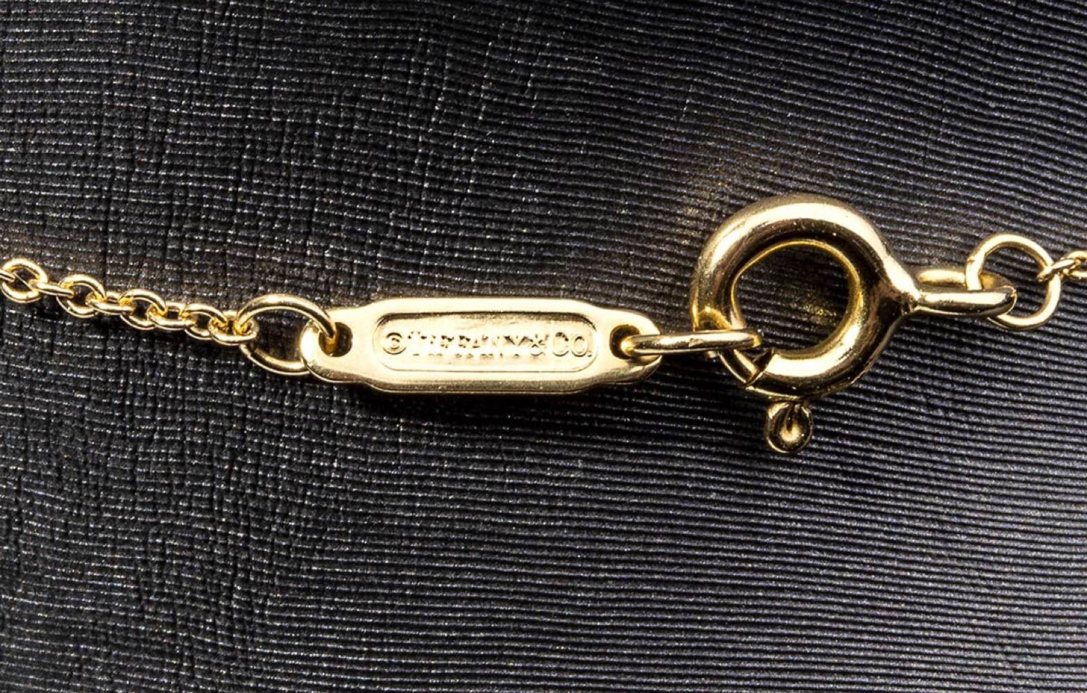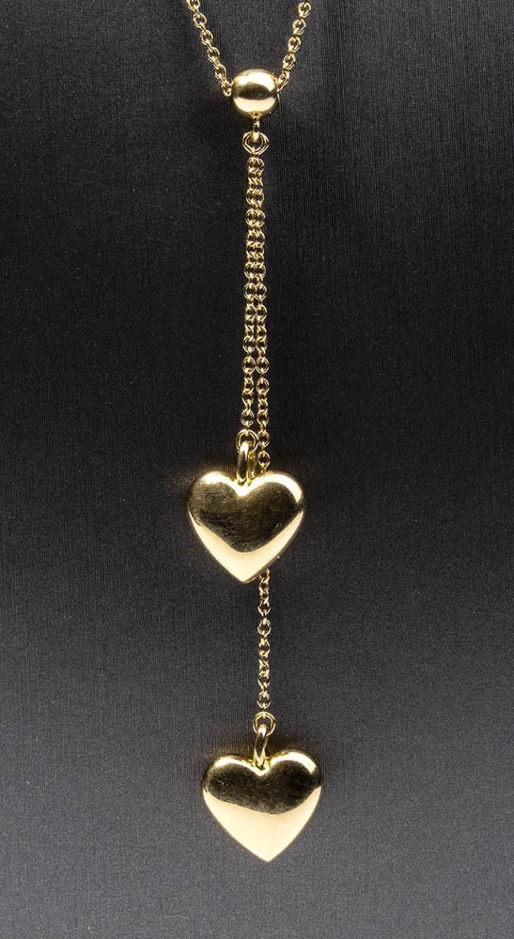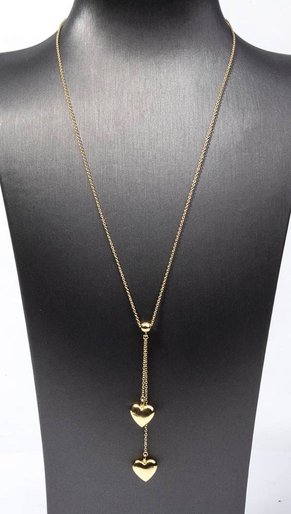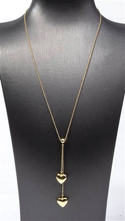 oro giallo 18k con due pendenti a forma di cuore. Punzonata "Tiffany & Co." e "750 ". Lunghezza 40 cm. Peso 8,1 gr. Stato di conservazione: ***** eccellente.