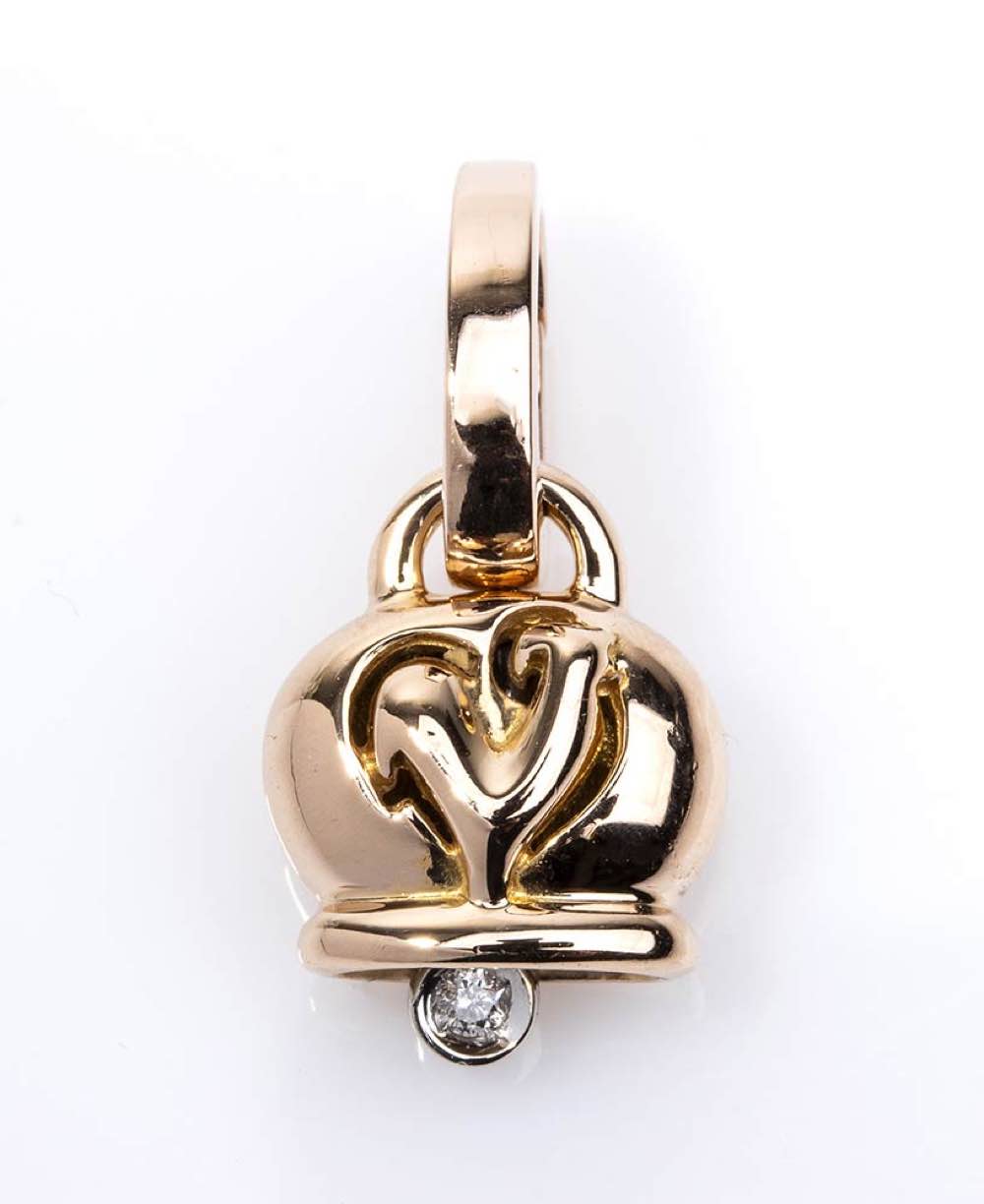 oro rosa 18k, collezione "Campanelle" con diamante taglio brilliante 0,02 ct circa. Punzonato "Chantecler", "18 KT", "750" e "1059 NA". Dimensioni 20 x 11 mm. Peso 4,2 gr. Stato di conservazione: ***** eccellente.