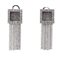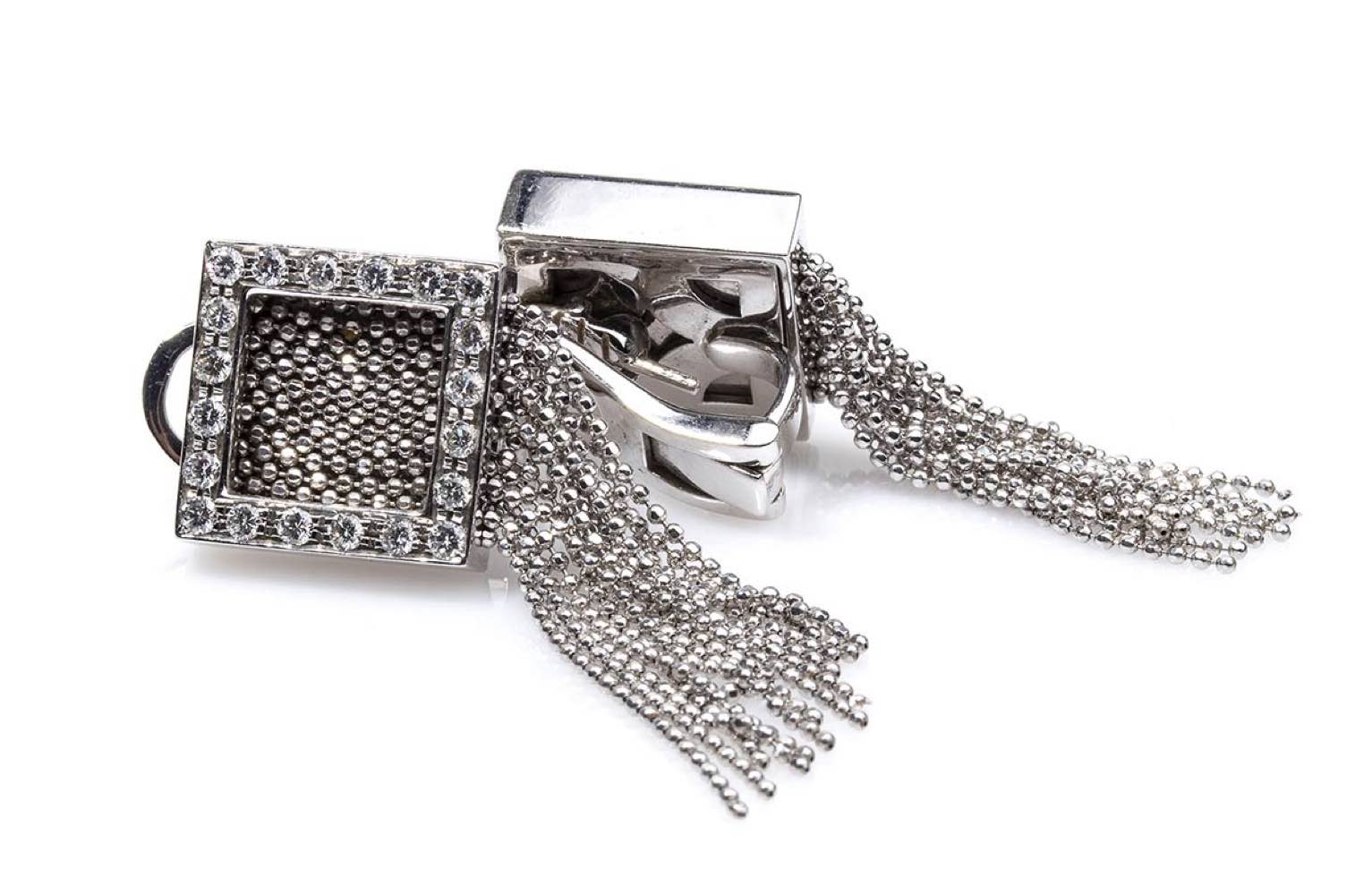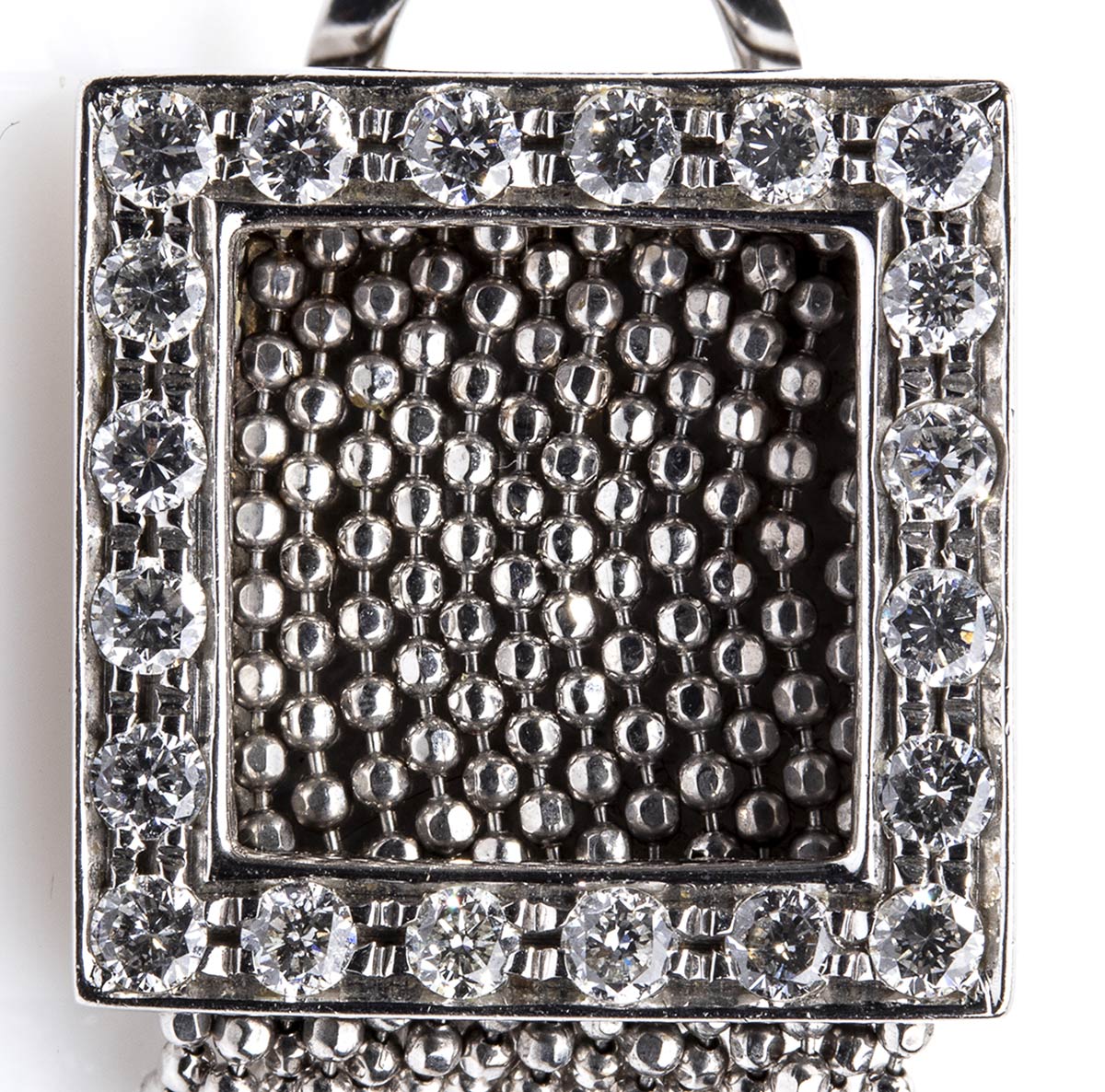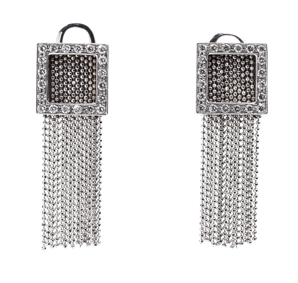 con fili sfaccettati pendenti realizzati in oro bianco 18k, incastonati con diamanti taglio brilliante 0,80 ct circa, F-G, VVS. Punzonati "18k", "Italy", "1932 AL". Dimensioni fronte 43 x 15 mm. Peso 24,8 gr. Stato di conservazione: ***** eccellente.