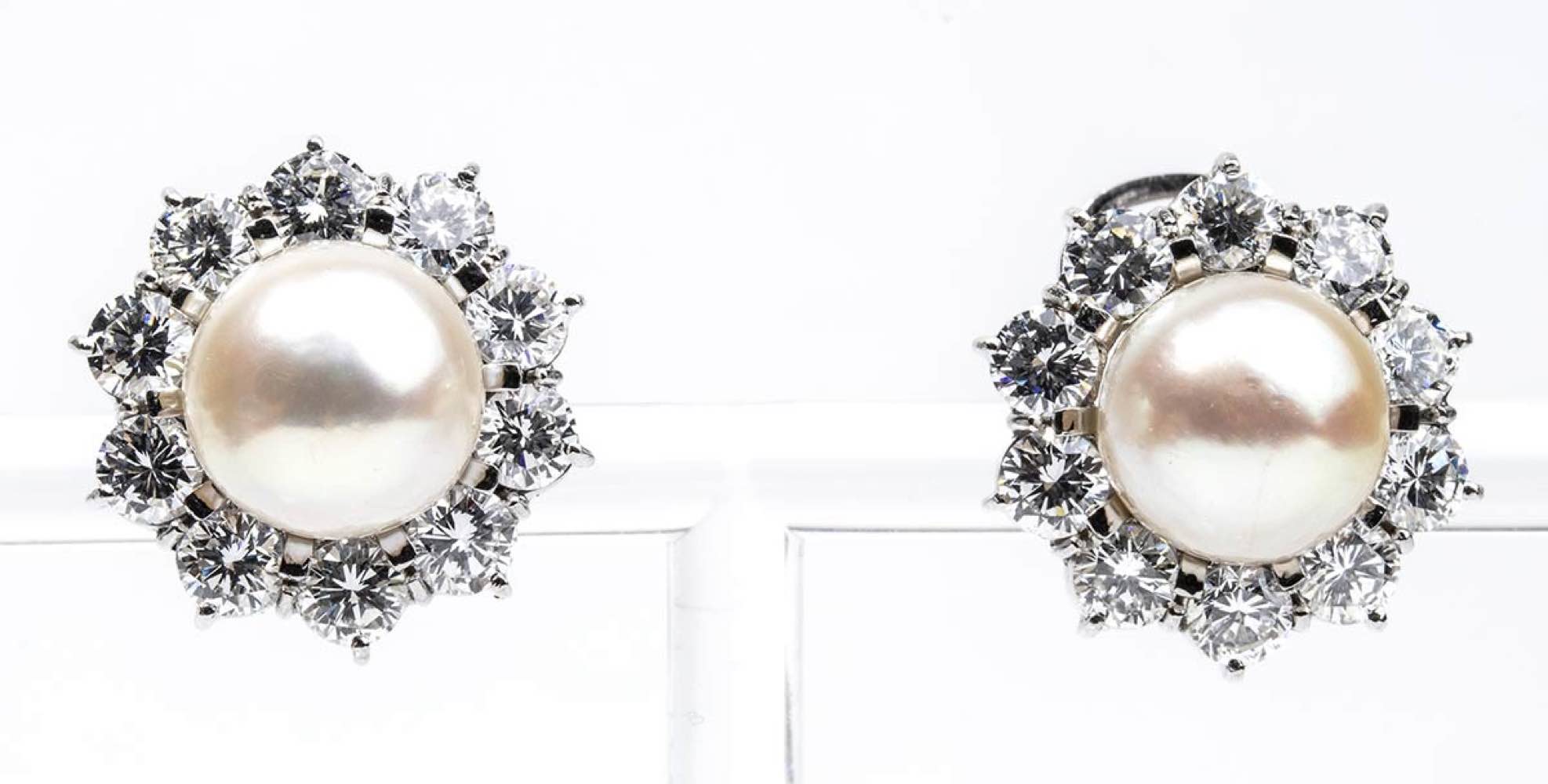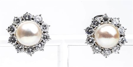 oro bianco 18k, motivo a margherita con perla centrale contornata da diamanti taglio brilliante 4,40 ct virca, F-G, VVS-VS. Diametro perle 10 mm. Diametro 18 mm. Peso 14,7 gr. Stato di conservazione: ***** eccellente.