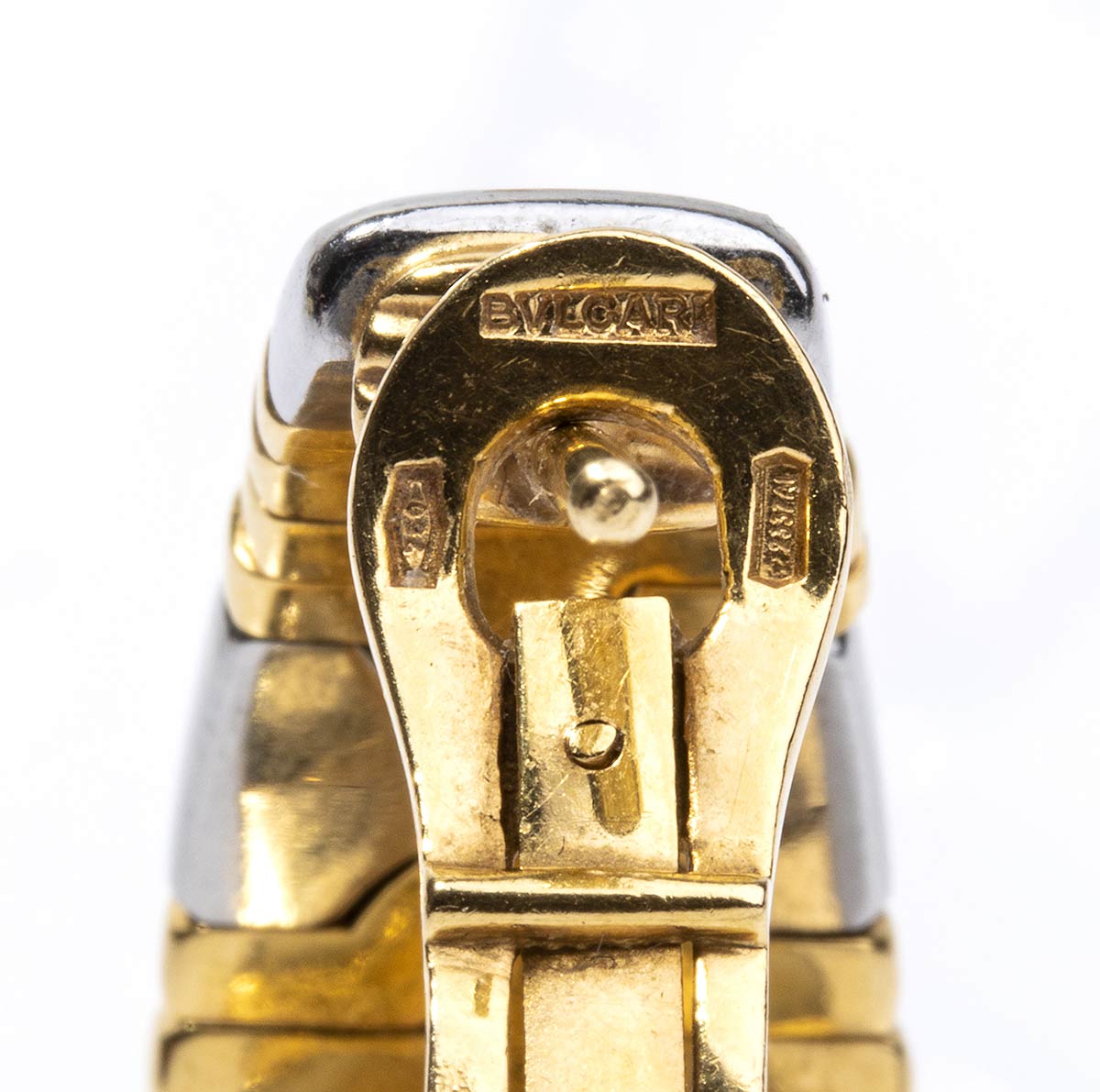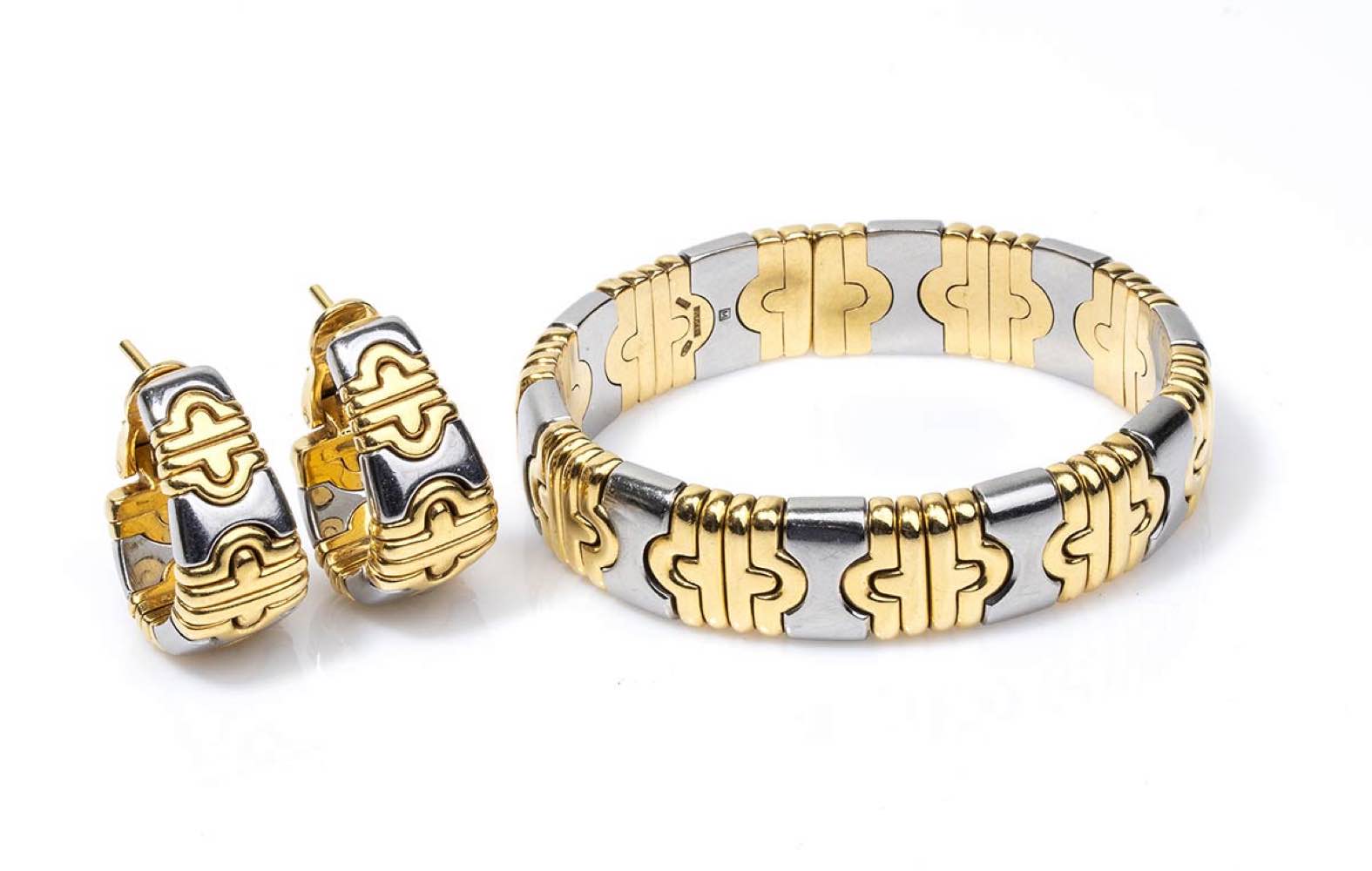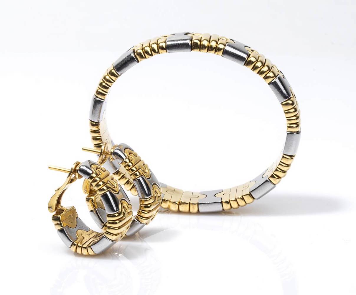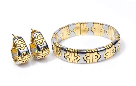 oro giallo 18k e acciaio, collezione "Parentesi". Punzonati "Bvlgari", "2337 AL", "750", "M". Diametro interno bracciale 5,8 cm, larghezza 1,5 cm, peso 92 gr. Dimensioni orecchini 3 x 1,2 cm, peso 35 gr. Stato di conservazione: ***** eccallaente.