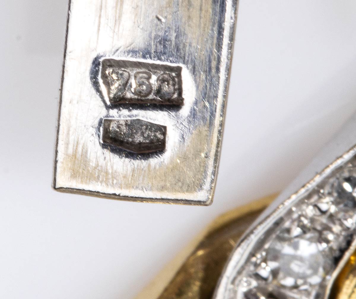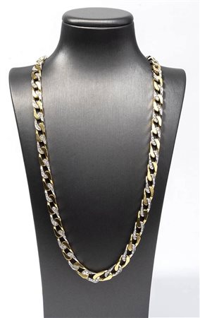 oro giallo e bianco 18k, a maglia groumette incastonata con diamanti taglio huit-huit 7,90 ct circa, F-G, VVS. Punzonato "750", "33 VR". Lunghezza 93 cm, larghezza 0,7 cm. Peso 170 gr. Stato di conservazione: ***** eccellente.