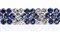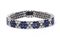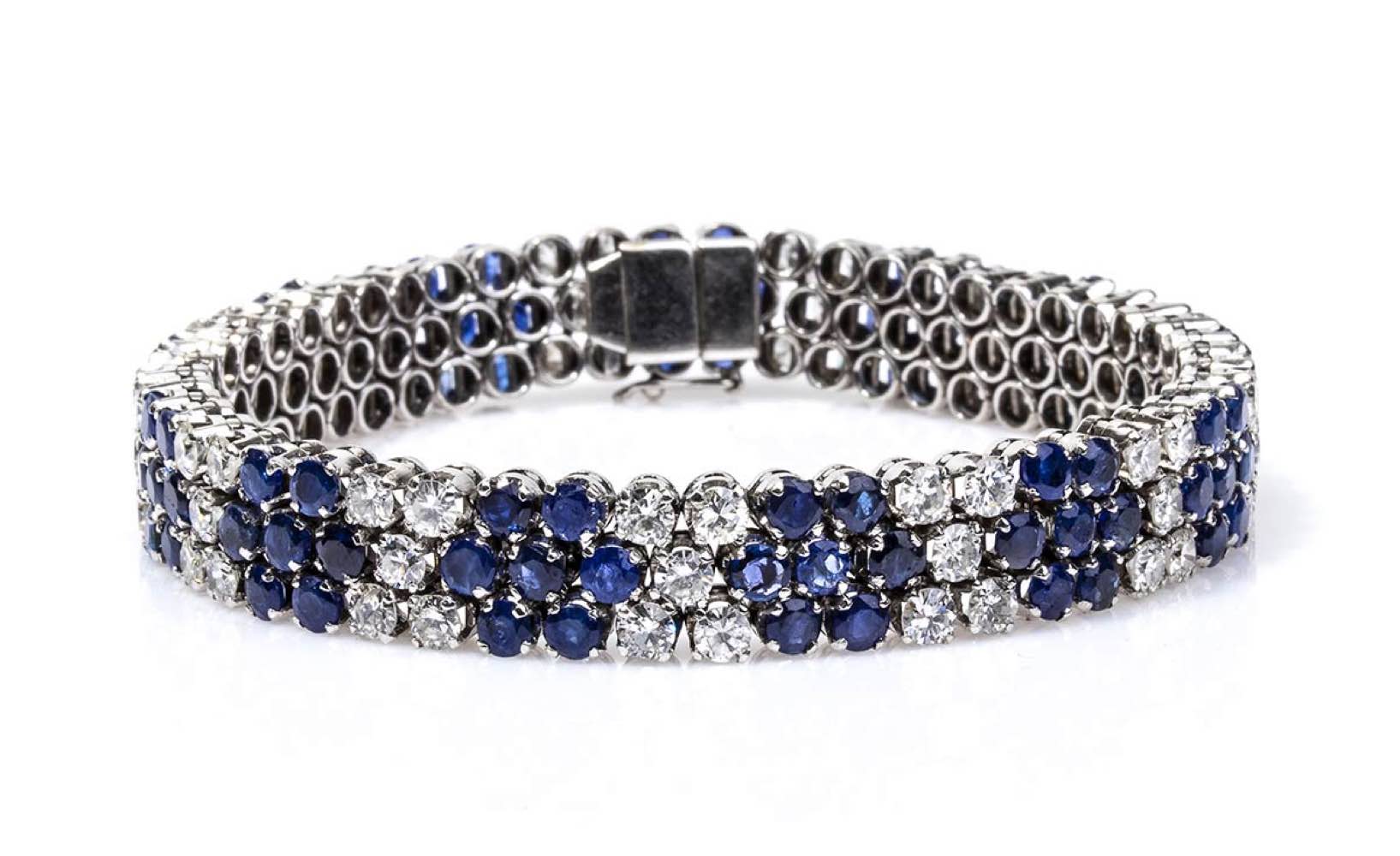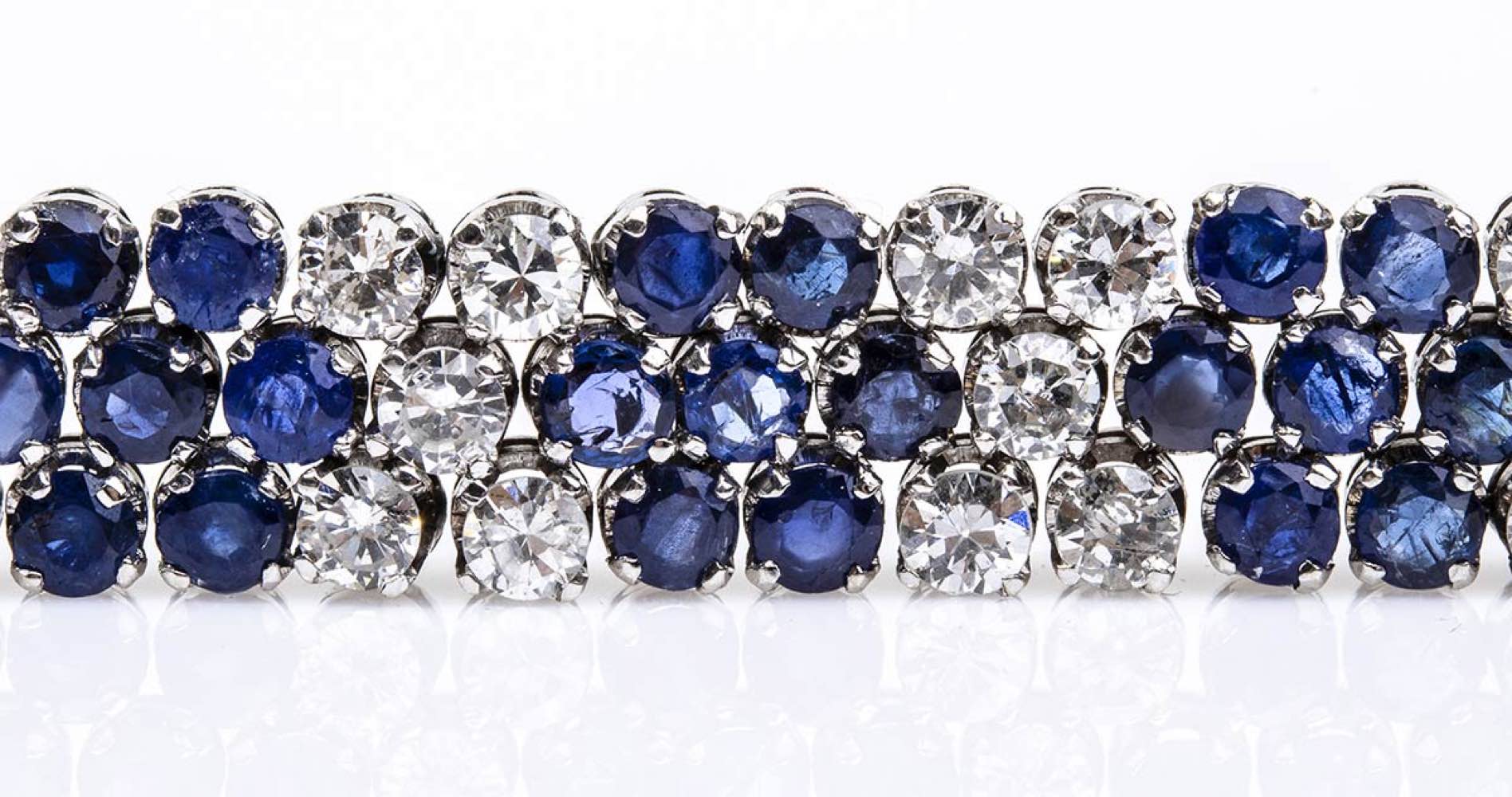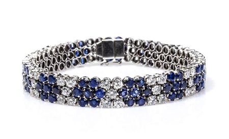 modello tennis a tre file di pietre in oro bianco 18k, incastonato con diamanti taglio brilliante 6,80 ct circa, G-H, VVS. Zaffiri 10,30 ct circa. Lunghezza 18,5 cm, larghezza 1 cm. Peso 34 gr. Stato di conservazione: ***** eccellente.