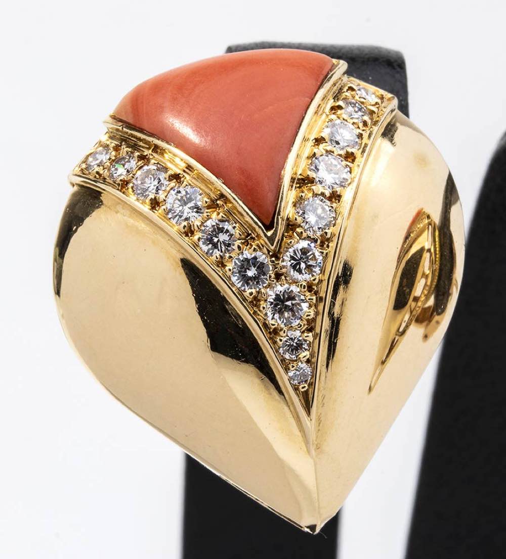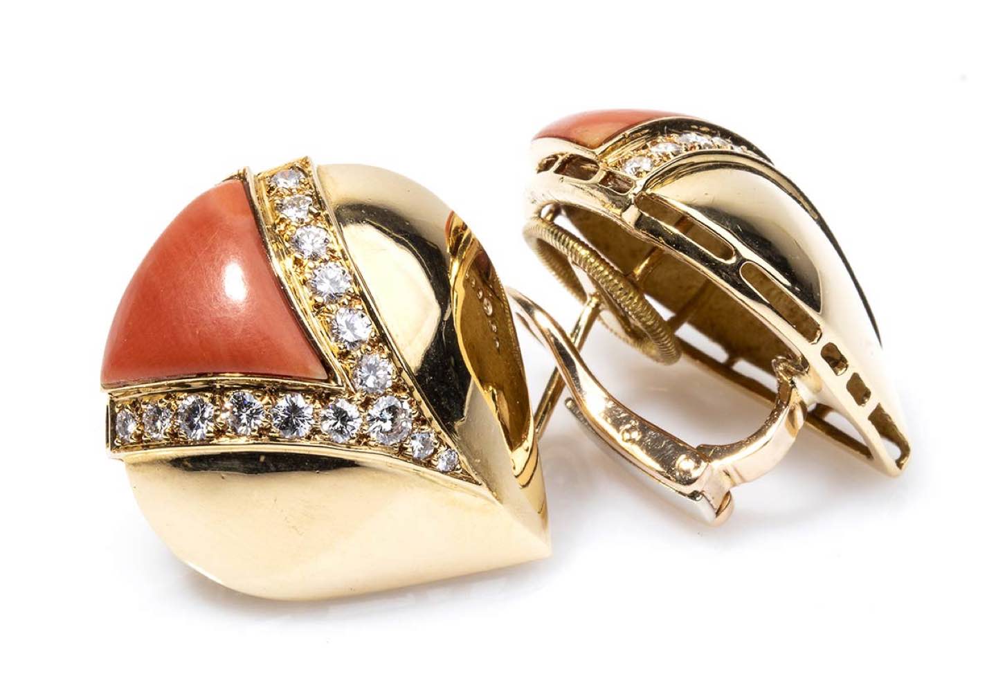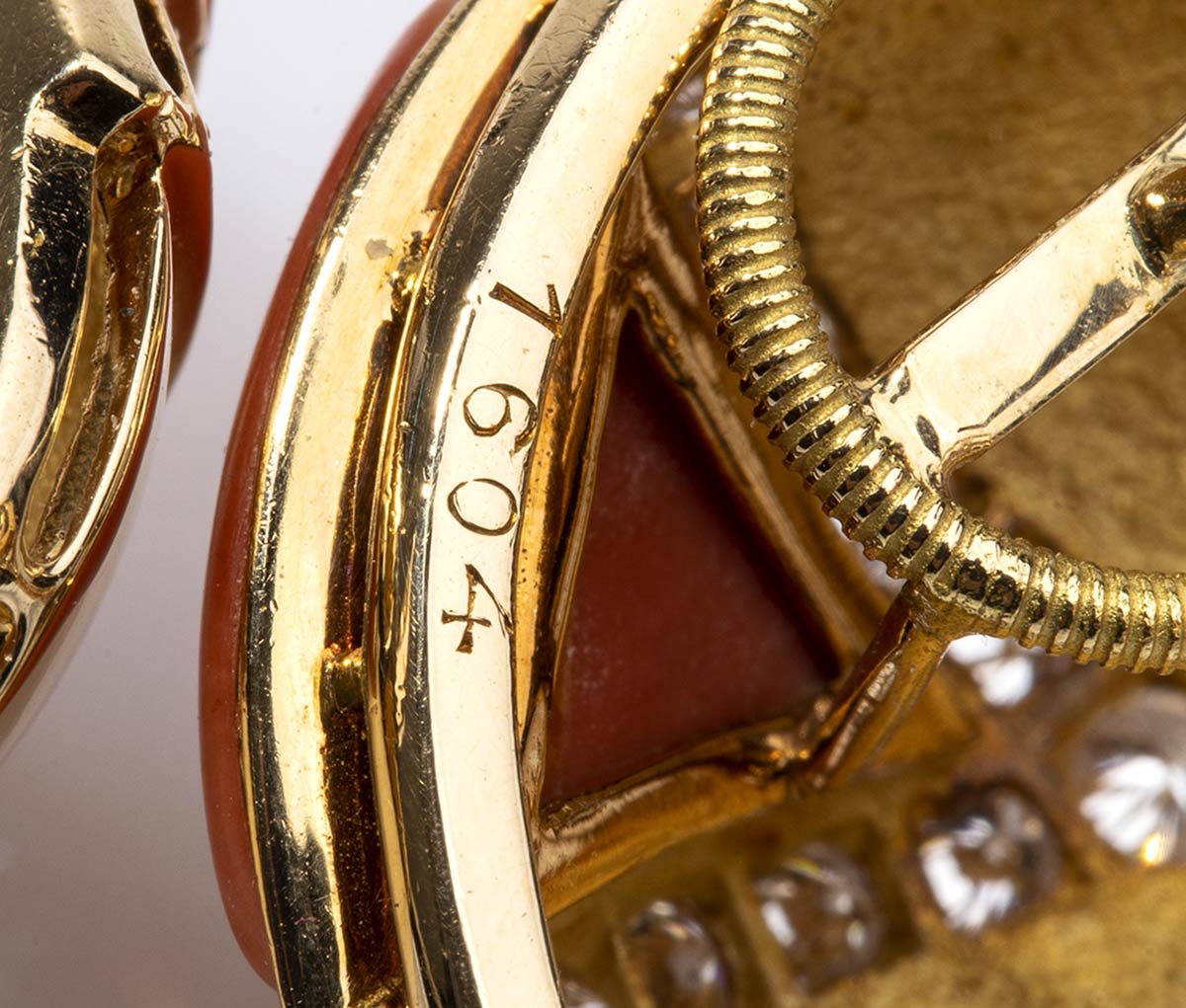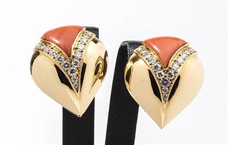oro giallo 18k, incastonati con diamanti taglio brilliante e triangoli di corallo. Punzonati "1604-BVLGARI". Diamanti 1,30 ct, colore G, purezza VVS. Dimensioni corallo 13 x 12 mm. Dimensioni frontali 23 x 26 mm. Peso 19,15 gr. Stato di conservazione: ***** eccellente.