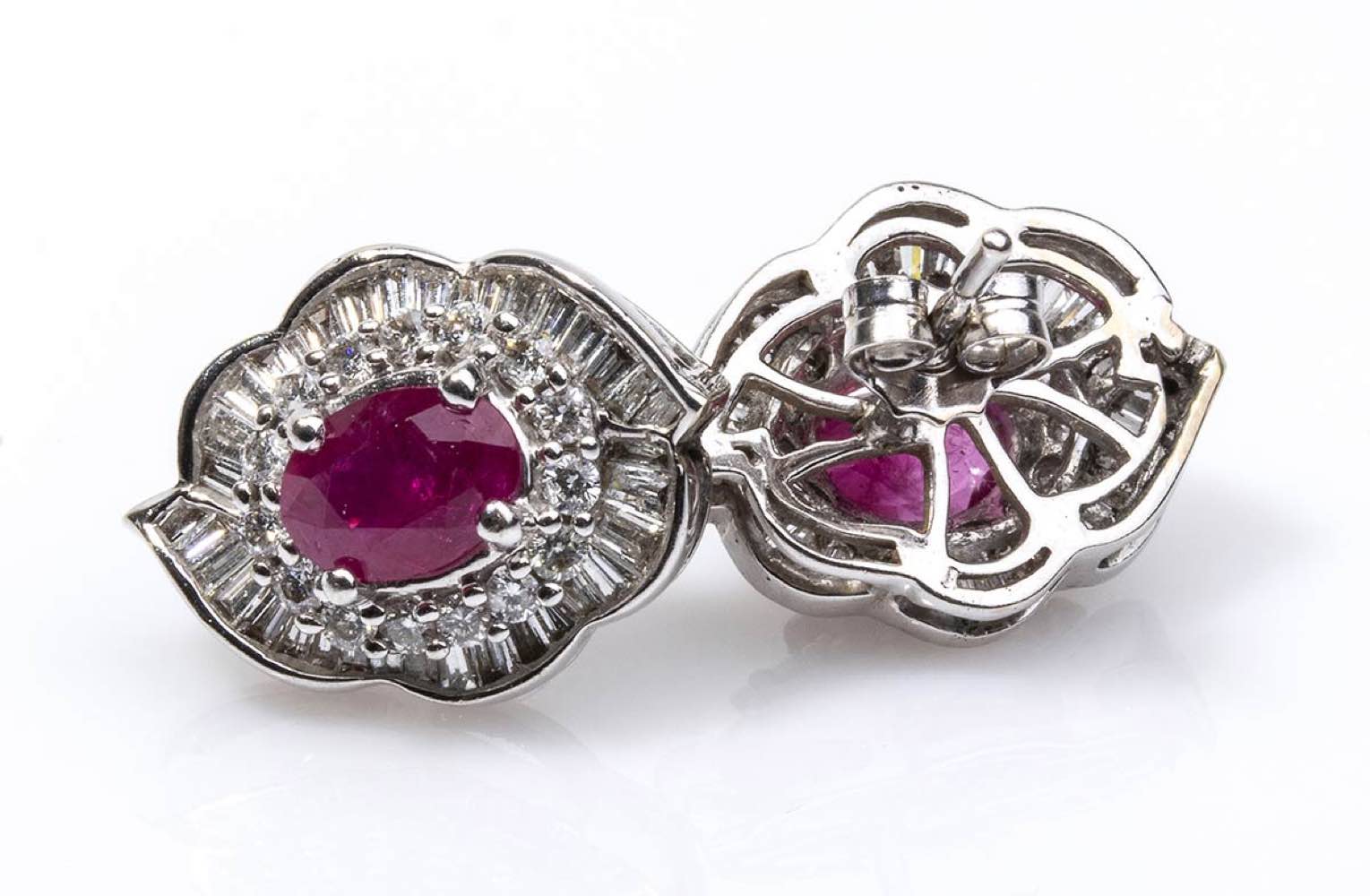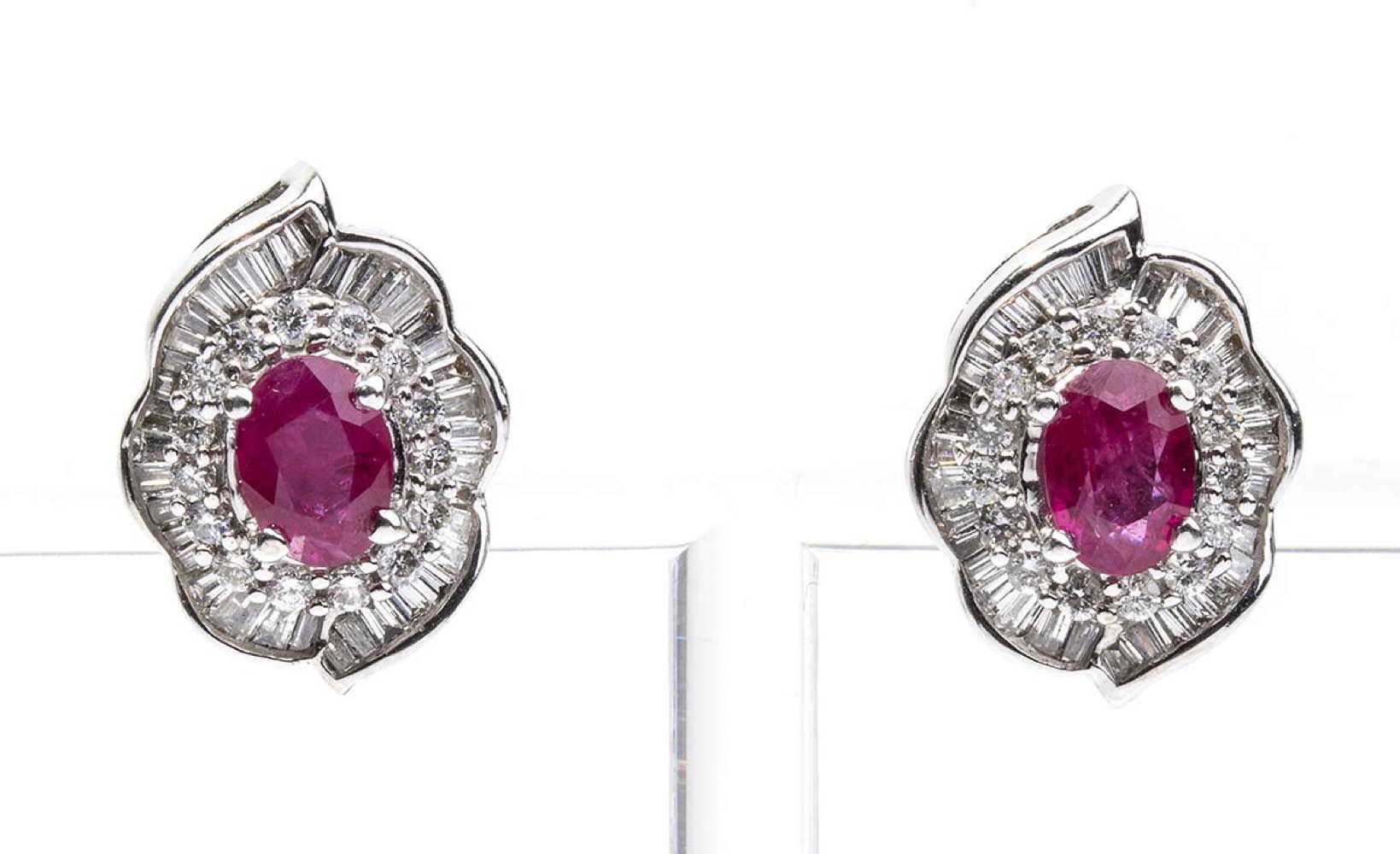 oro bianco 18k, incastonati con diamanti taglio brilliante e tapered e rubini ovali. Diamanti 3,00 ct circa, G-H, VVS-VS. Rubini 2,00 ct circa. Dimensioni 17 x 13 mm. Peso 7,2 gr. Stato di conservazione: ***** eccellente.