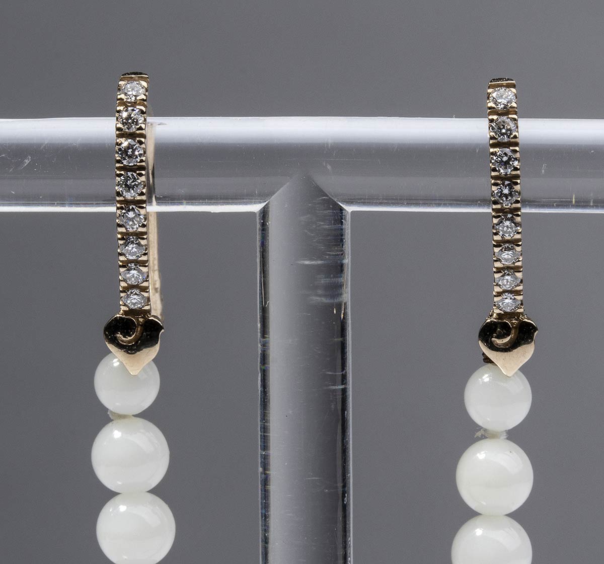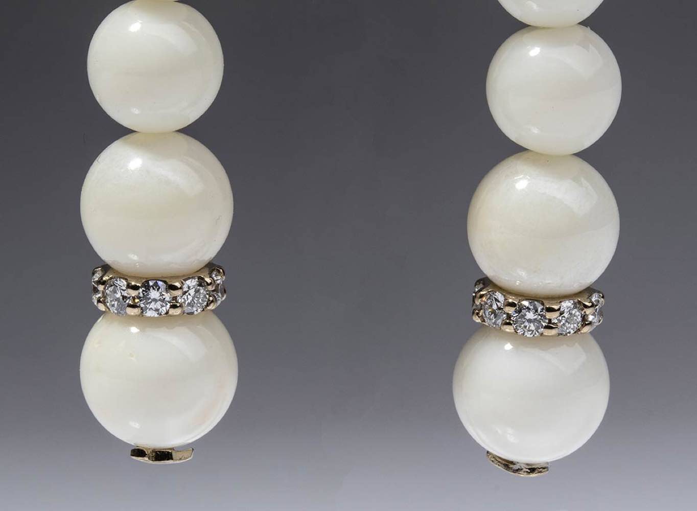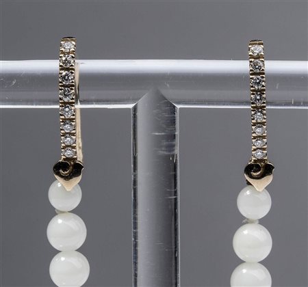 oro rosa 18k, corallo bianco e diamanti realizzati a mano in Italia. Punzonati "750", "Chantecler", "1059 NA". Diamanti taglio brilliante 0,40 ct circa, F-G, VVS. Diametro corallo da 3,5 a 8 mm, lunghezza orecchini 10 cm. Peso 11,2 gr. Stato di conservazione: ***** eccellente.