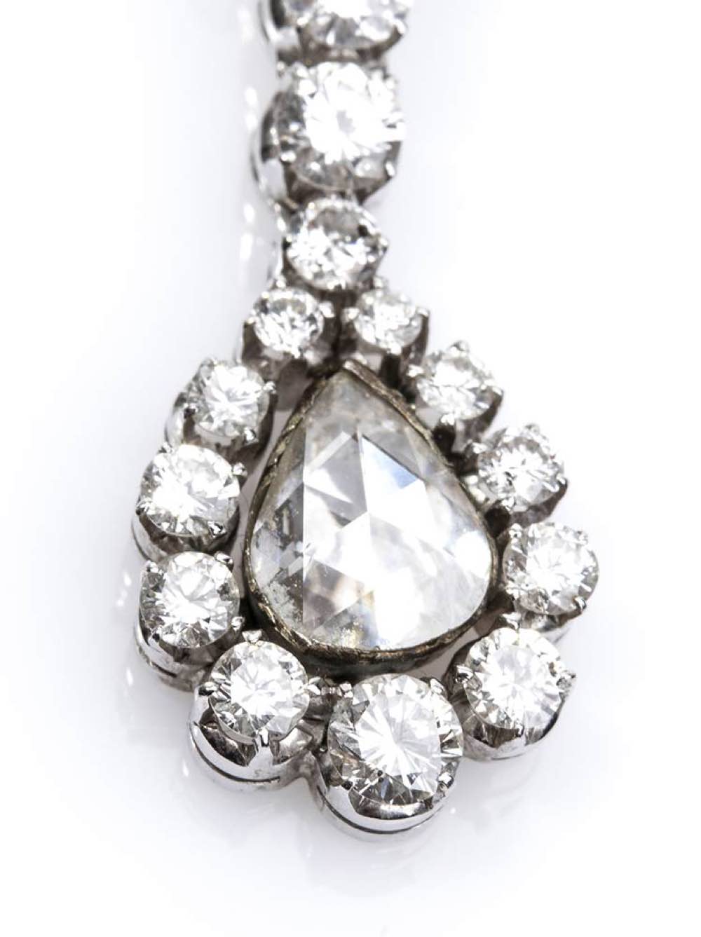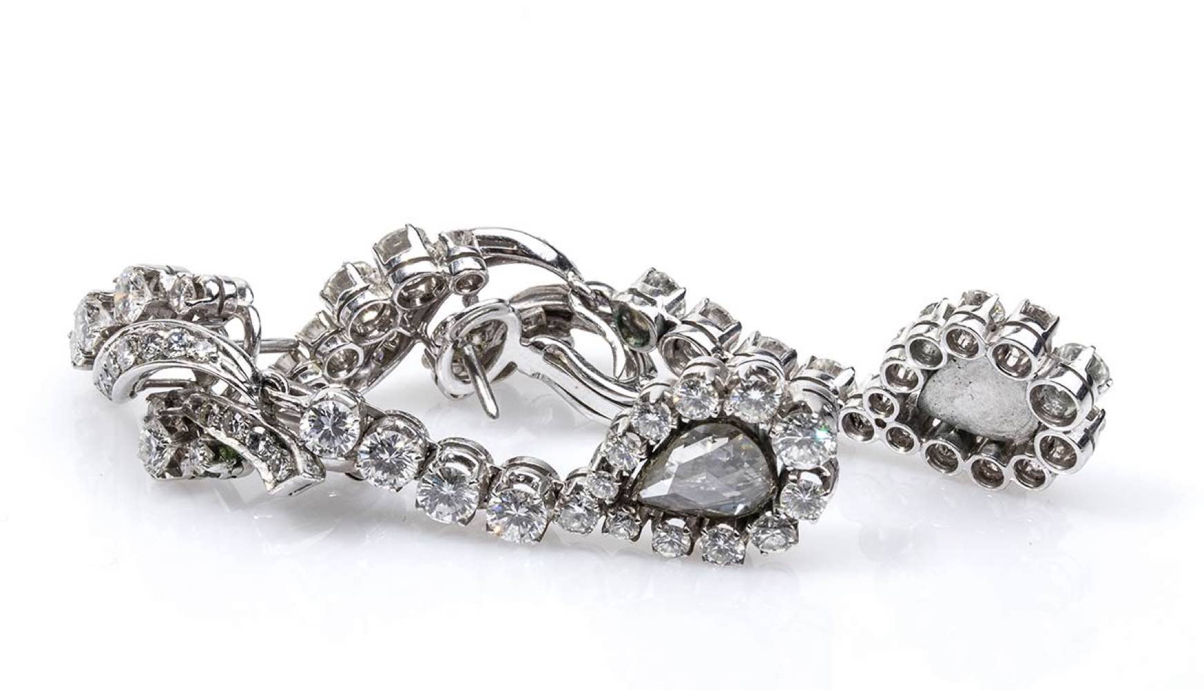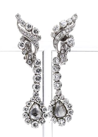 oro bianco 18k con diamanti taglio brilliante e taglio vecchio a goccia, realizzato a mano in Italia. Punzonati "750". Diamanti taglio brilliante 4,50 ct circa, F-G, VVS; diamanti vecchio taglio a goccia 2,20 ct circa, I-K, VS-SI. Dimensioni 58 x 13 mm. Peso 15,8 gr. Stato di conservazione: ***** eccellente.