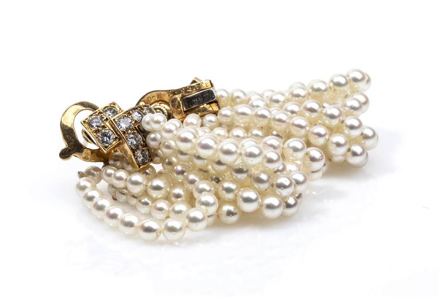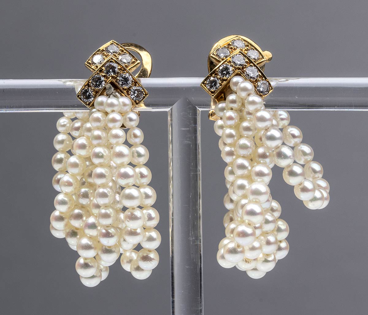 in oro 18k, arricchiti con perle e diamanti taglio brilliante 1,00 ct circa, G, VVS. Punzonati "750", "V C A" e "831524". Diametro perle 3 mm. Dimensioni 4 x 2 cm. Peso 15 gr. Stato di conservazione: ***** eccellente.