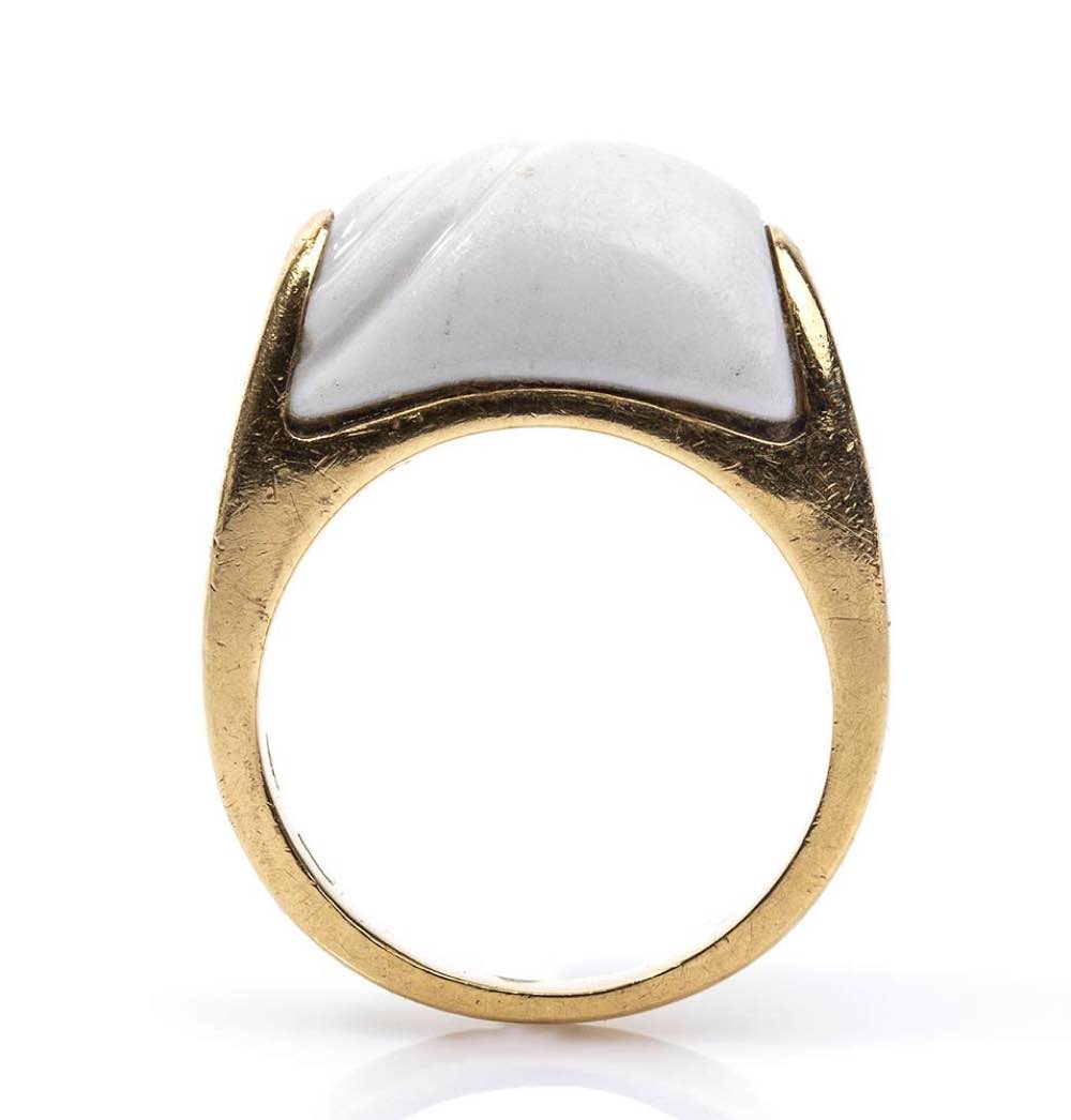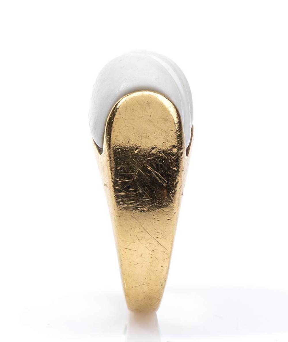 oro giallo 18k, collezione TRONCHETTO con incastonata ceramica bianca. Punzonato "BVLGARI", "750", "Made in Italy" e "1970 AR". Dimensione fronte 20 x 10 mm. Peso 10,2 gr. Stato di conservazione: ***** eccellente.