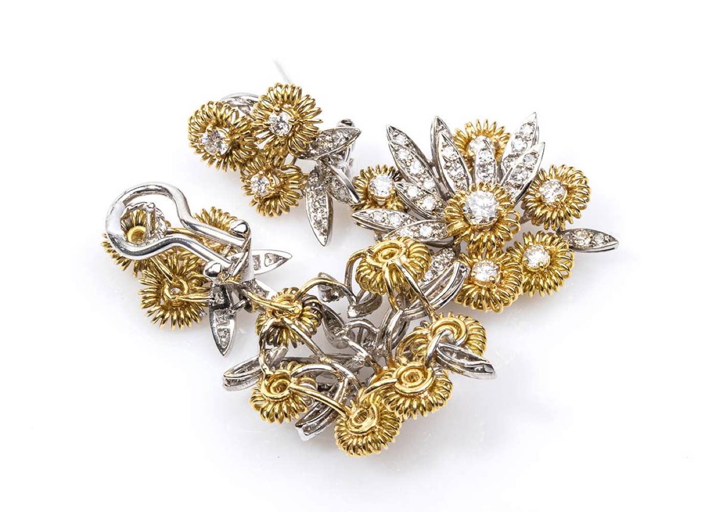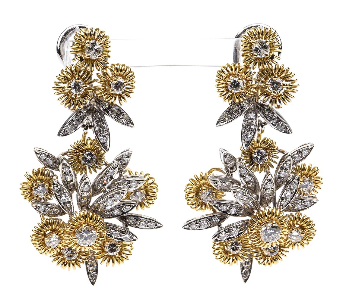 oro giallo e bianco 18K, di forma floreale, realizzati a mano in Italia. Incastonati con diamanti taglio brilliante 3,20 ct circa, G-H, VVS-VS. Dimensioni 5 x 2,5 cm. Peso 21,7 gr. Stato di conservazione: ***** eccellente.