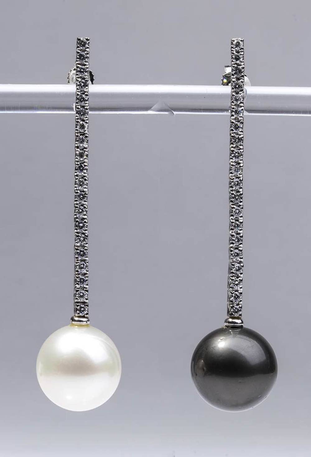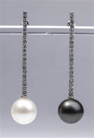 oro bianco 18k, incastonati con diamanti e perle coltivate. Diamanti taglio brilliante 1,40 ct circa, G-H, VVS-SI. Diametro perla australiana e perla Tahiti 15 mm. Punzonati "750", "NF". Lunghezza 65 mm. Peso 16,3 gr. Stato di conservazione: ***** eccellente.