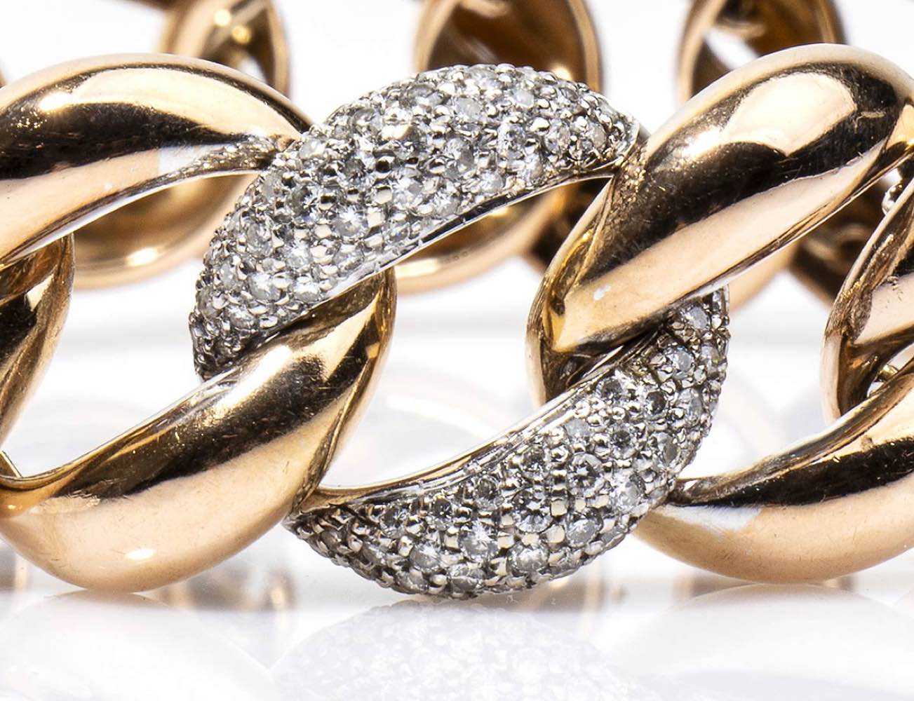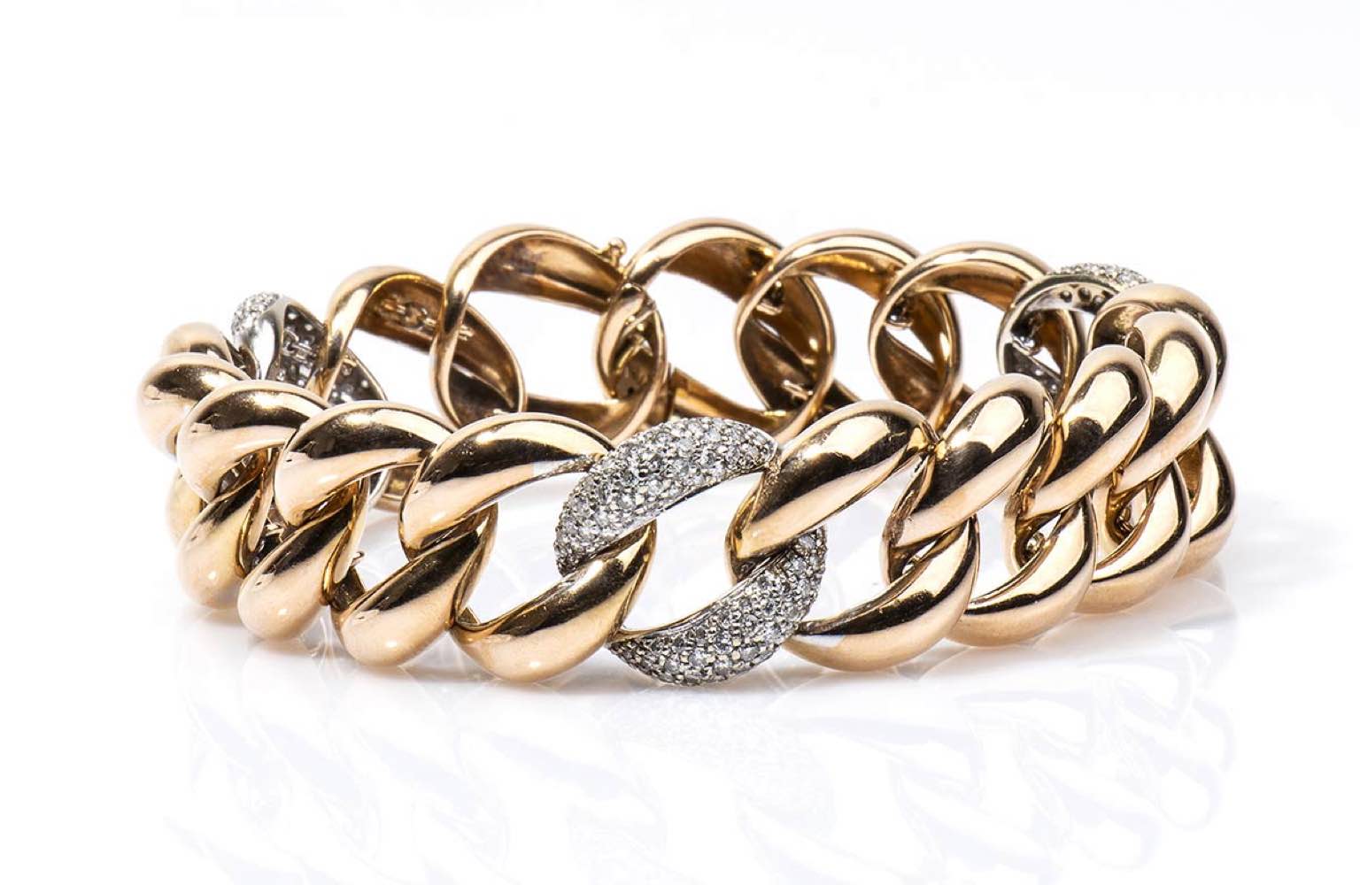 oro rosa e bianco 18k, maglie concatente, parzialmente incastonate con diamanti taglio brilliante 2,00 ct circa, G, VVS. Punzonato "750". Dimensioni 19 x 1,7 cm. Peso 41,4 gr. Stato di conservazione: ***** eccellente.