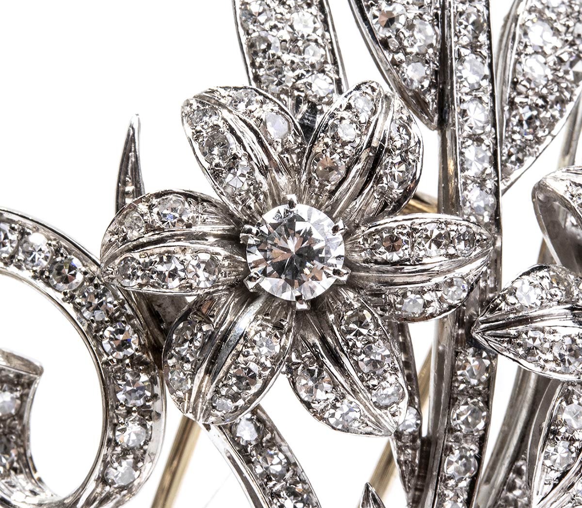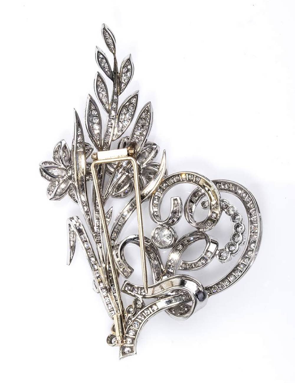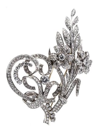 oro bianco 18K, a motivo floreale, incastonata con diamanti taglio brilliante e taglio huit-huit 6,70 ct circa, F-G, VVS. Punzonata "750", "1051 AL". Dimensioni 8 x 5,5 cm. Peso 29,8 gr. Stato di conservazione: ***** eccellente.