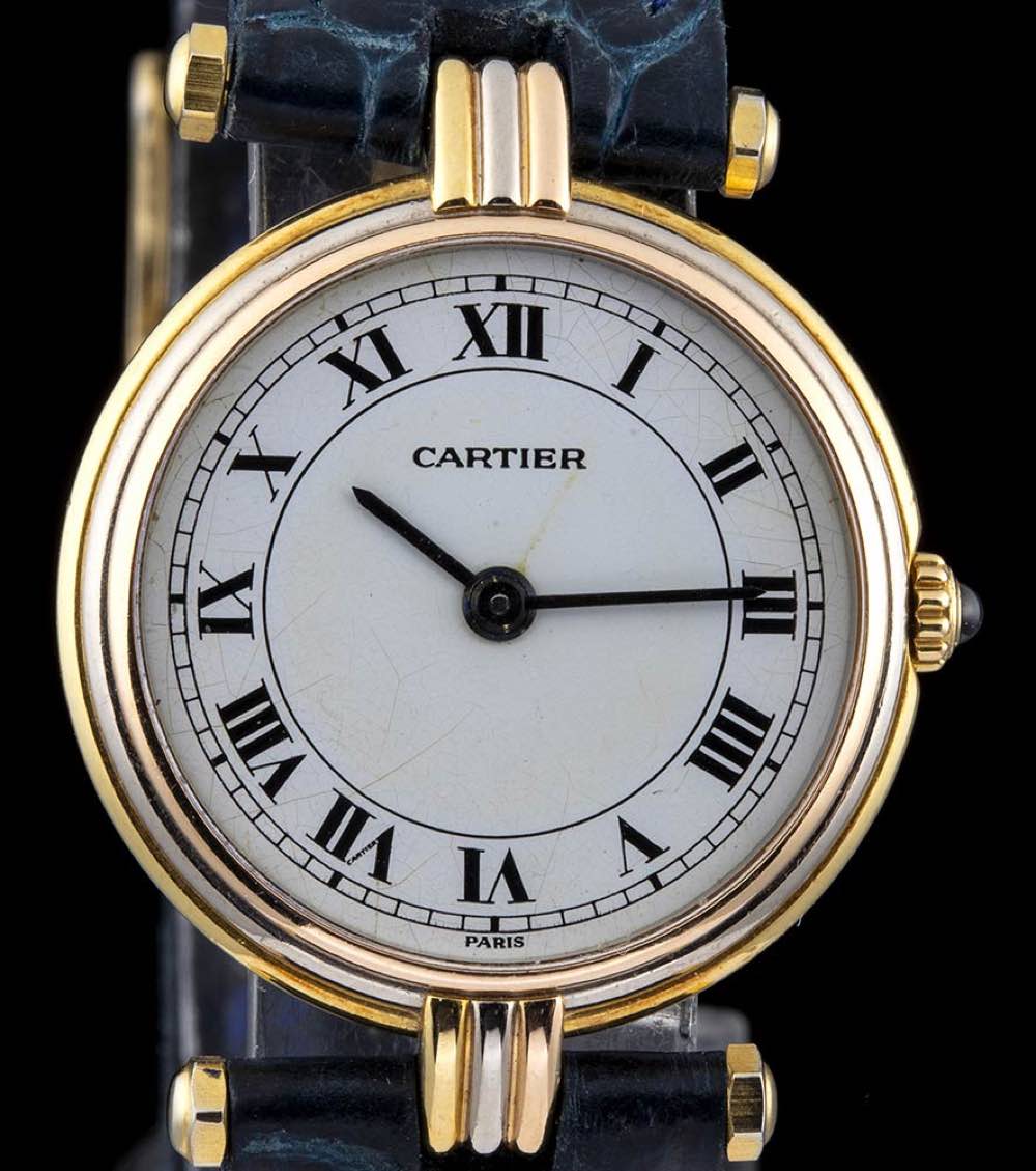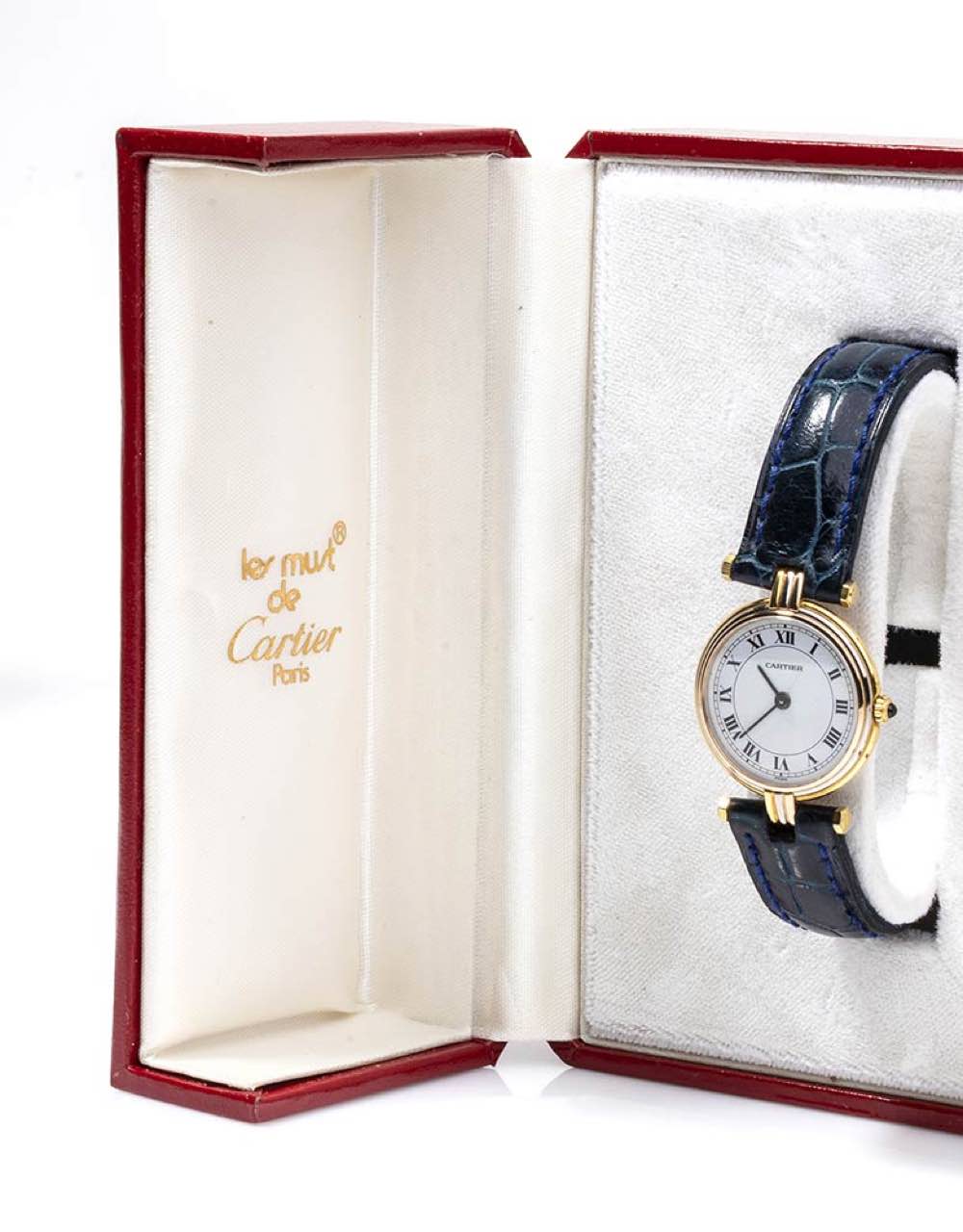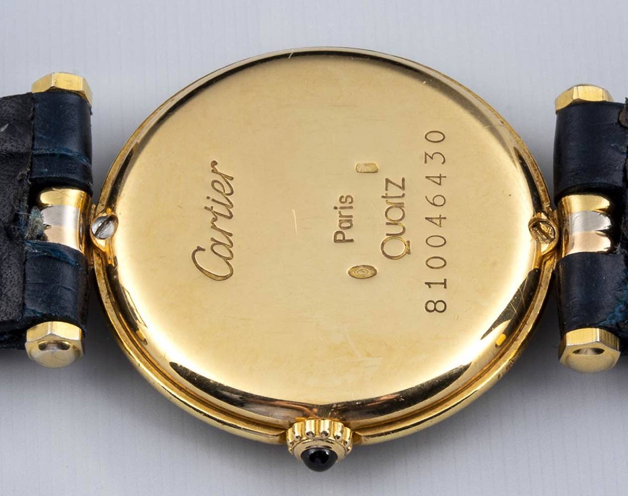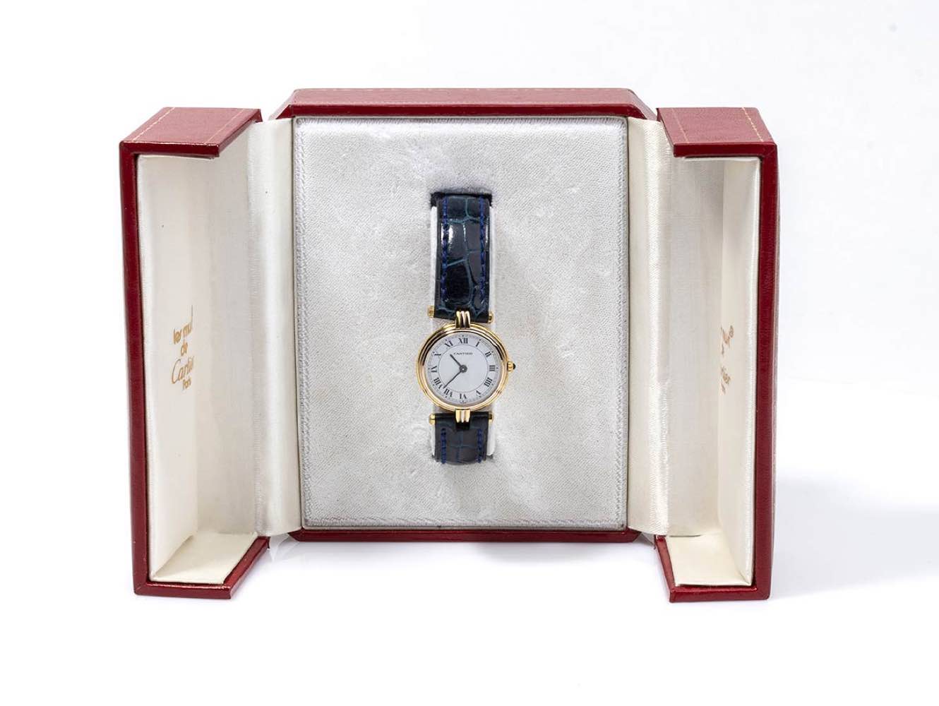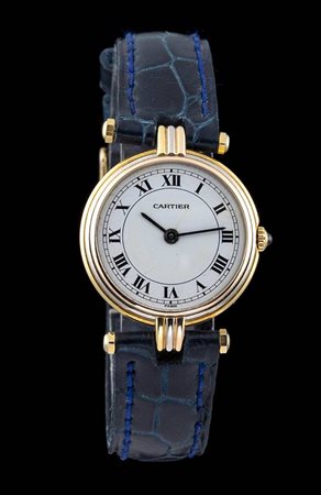 cassa in oro 18k tre colori, quadrante bianco con numeri romani, movimento al quarzo. Diametro cassa 25 mm. Cinturino after market in pelle di colore blu con chiusura ardiglione, lunghezza 18 cm. Scartola originale Cartier. Stato di conservazione: *** discreto (difetti al quadrante).