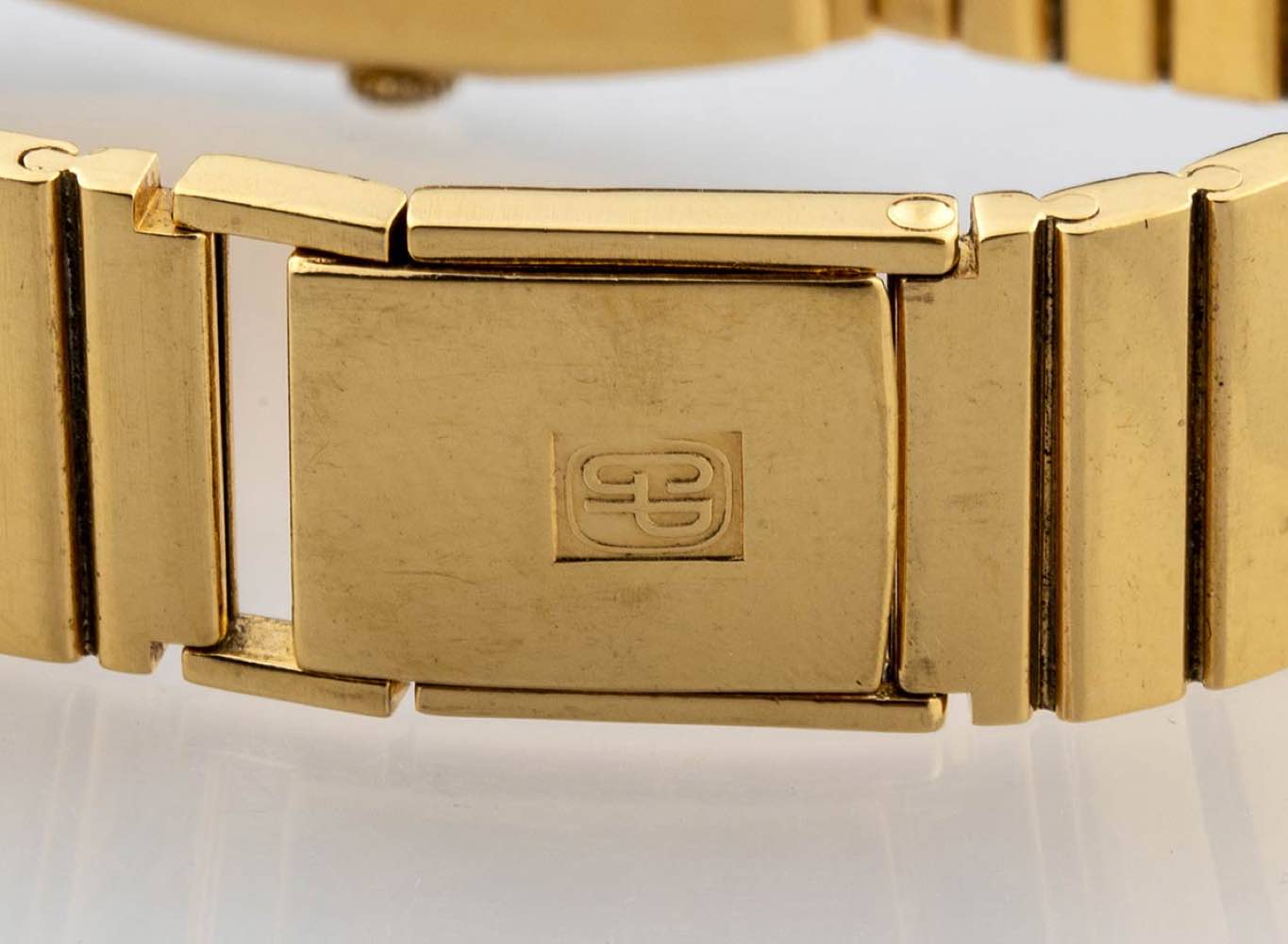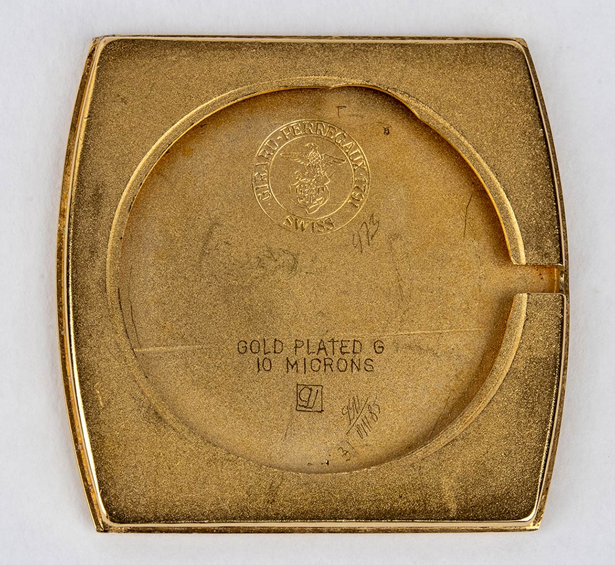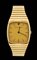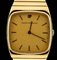 placcato in oro giallo, quadrante color oro con indici a bastone, fondello a scatto. Movimento 17j., carica manuale, referenza 1195 PJ. Dimensioni cassa 35 x 31 mm, lunghezza bracciale 20 cm. Stato di conservazione: **** buono.