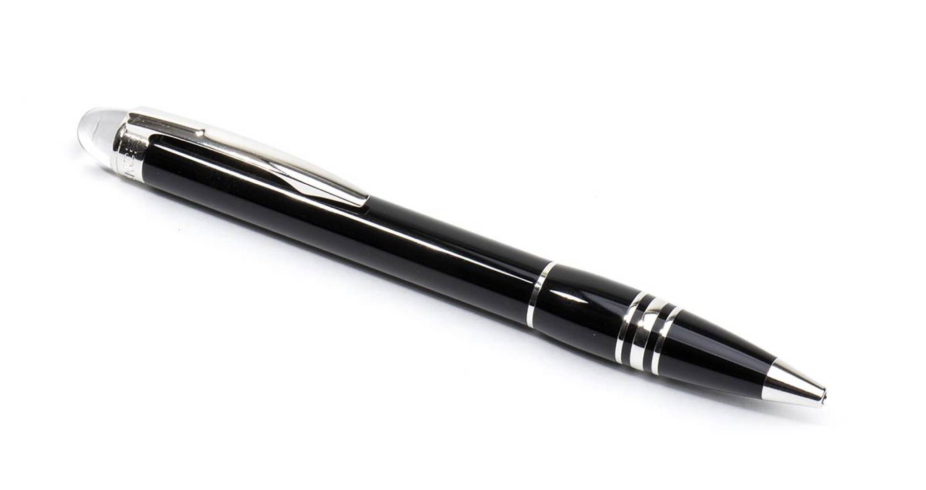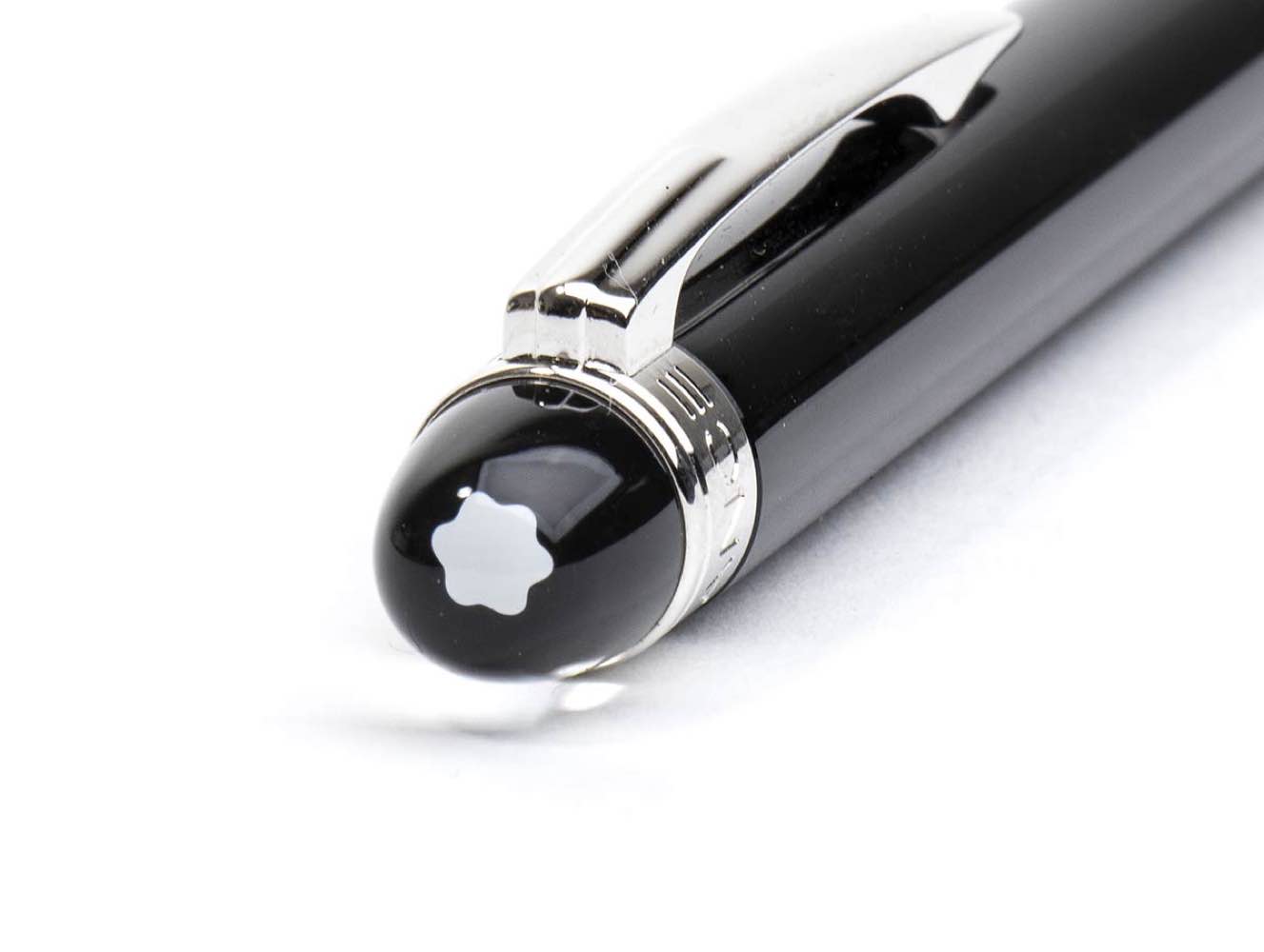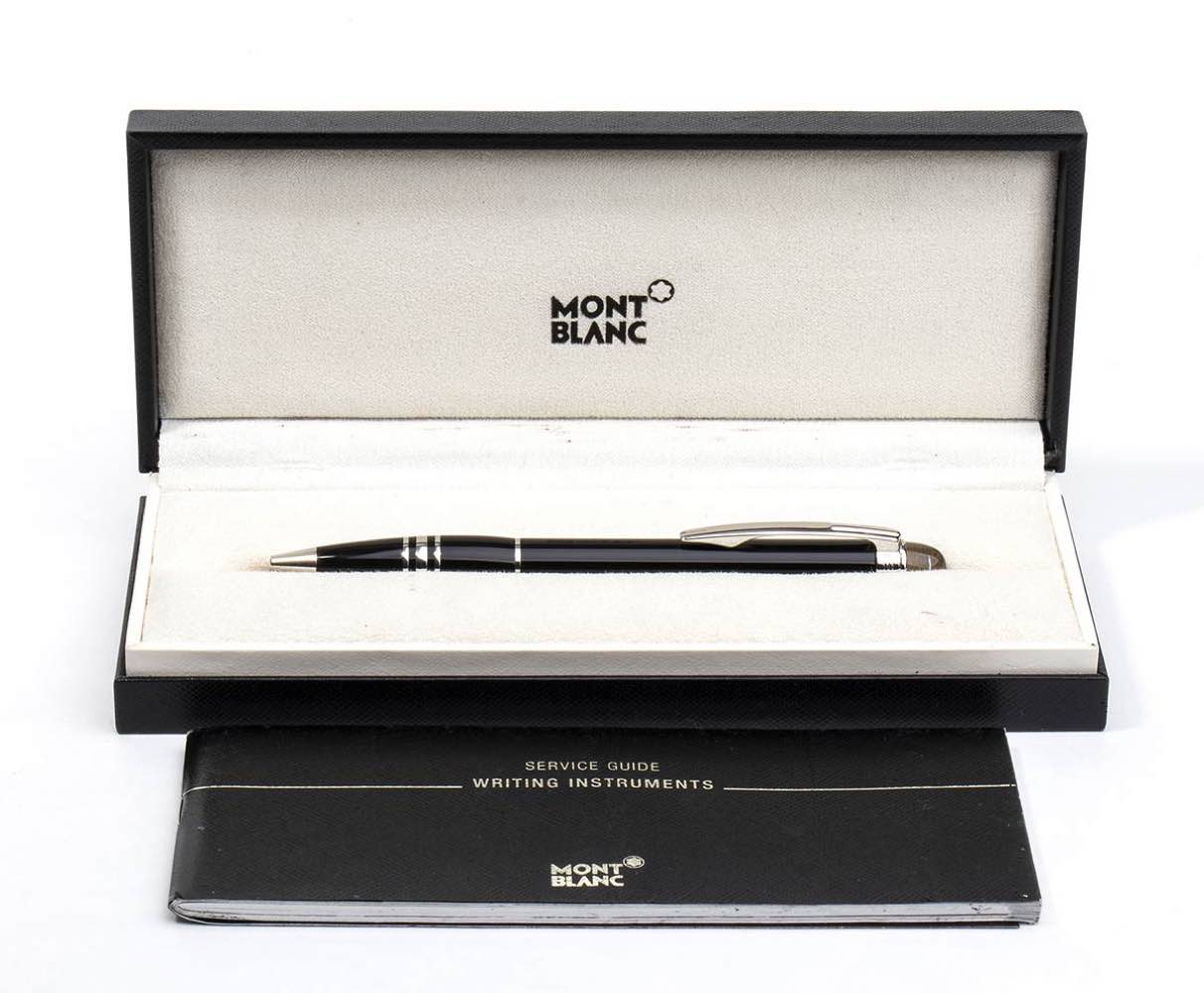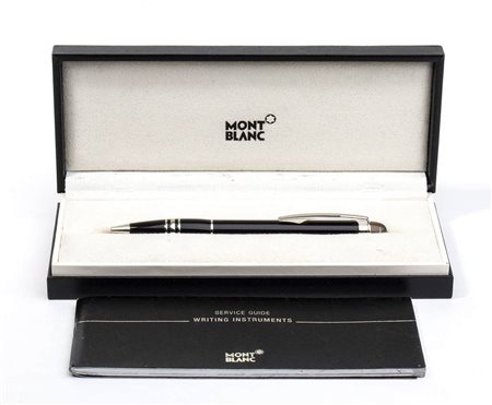 meccanismo a rotazione, fusto e cappuccio in resina nera con finiture placcate in oro. Seriale VL 1929221. Lunghezza 13,5 cm. Stato di conservazione: ***** eccellente. Scatola e controscatola Montblanc con documenti originali. La penna potrebbe necessitare del cambio del refill.