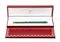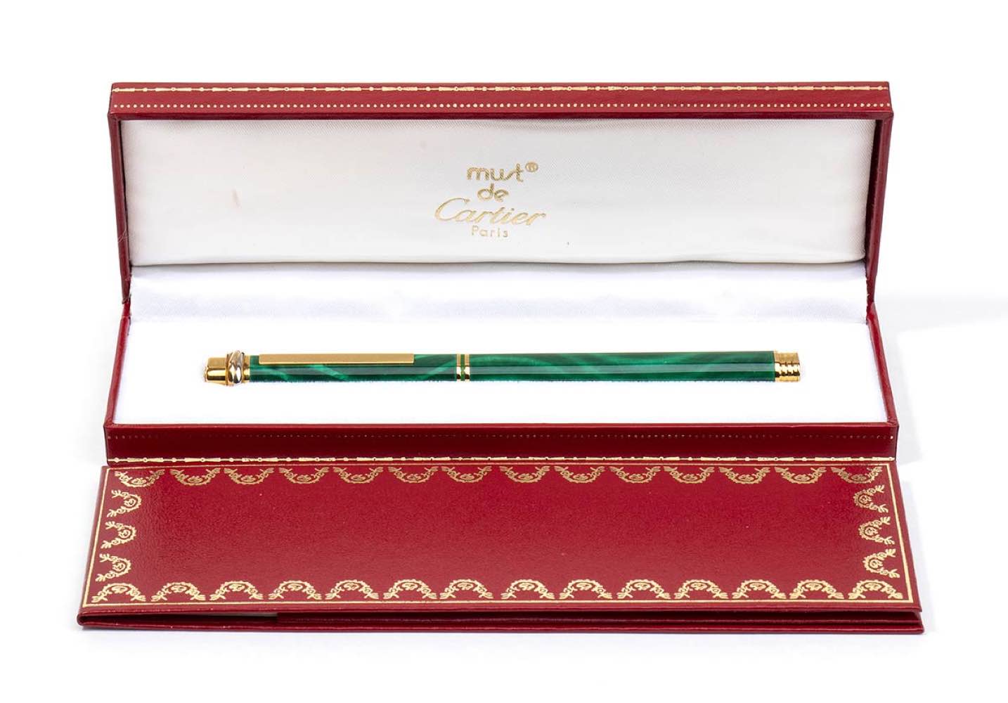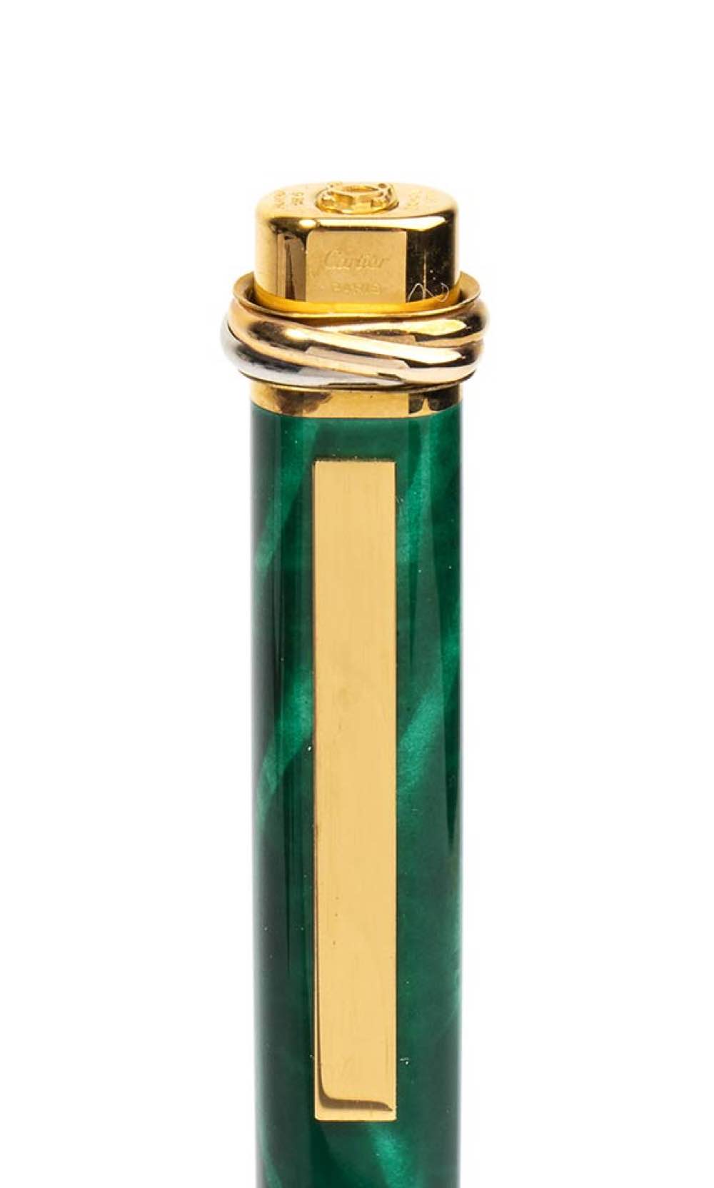 fusto e cappuccio in lacca verde placcati in oro; premendo la parte superiore del cappuccio la clip si apre alla larghezza desiderata e rilasciando la pressione la clip ritorna nella sua posizione originale. Numero di serie 629344. Lunghezza 13,5 cm. Stato di conservazione: **** buono. Scatola e controscatola originali Cartier. La penna potrebbe necessitare del cambio del refill.