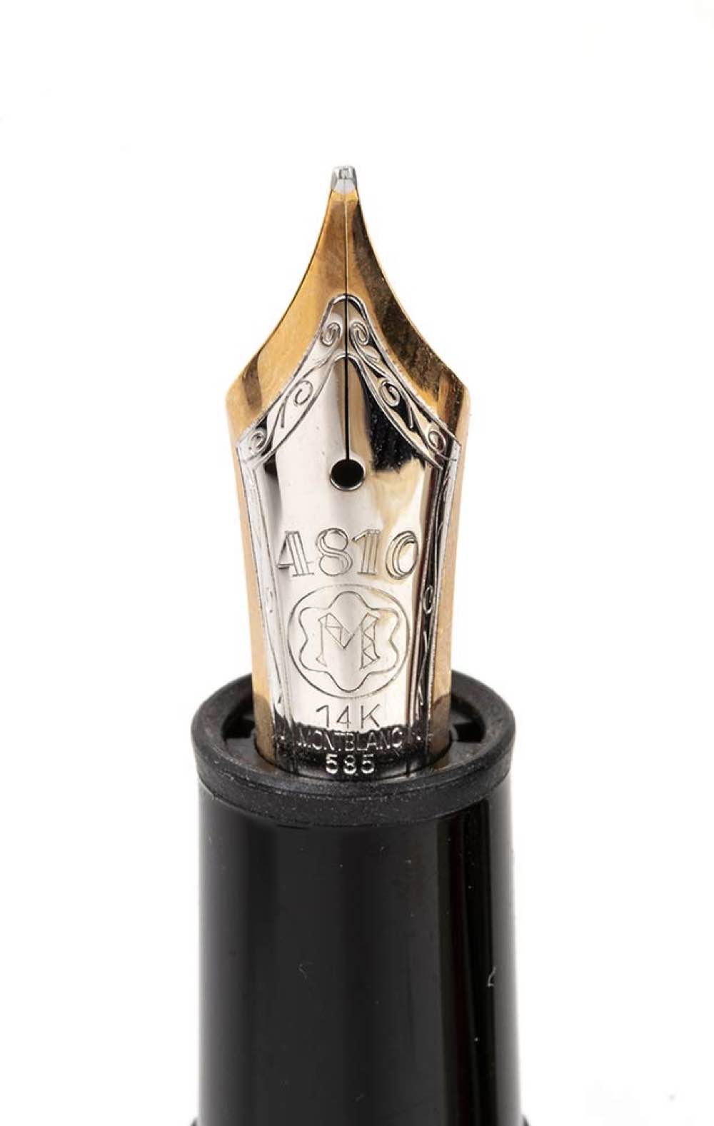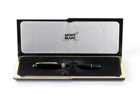 fusto e cappuccio in resina nera con finiture placcate in oro, pennino in oro 14k riportante la dicitura "14k MONTBLANC 4810 585". Seriale PM1143088. Lunghezza 14,5 cm. Stato di conservazione: ***** eccellente, come nuova, mai usata. Scatola originale Montblanc.