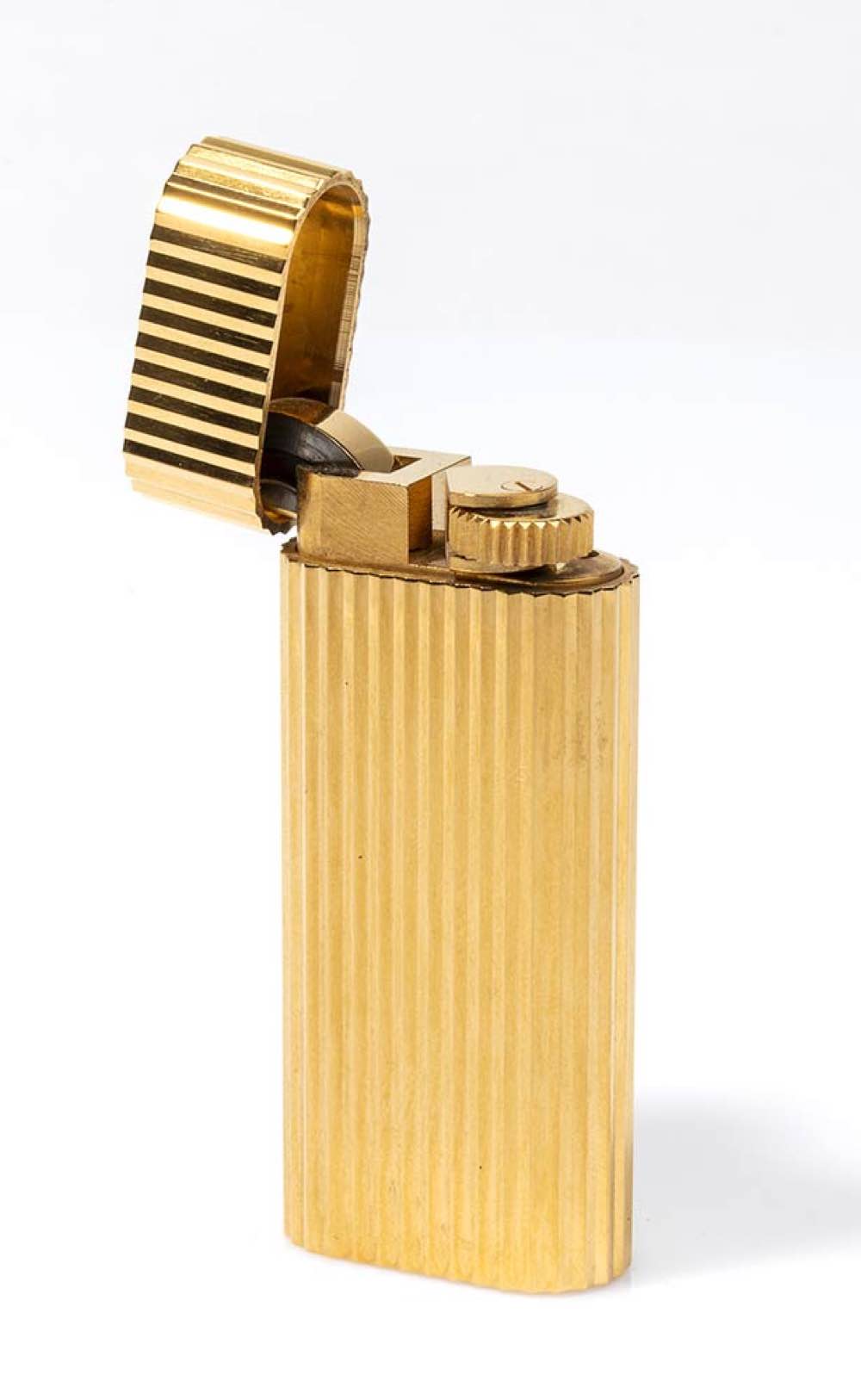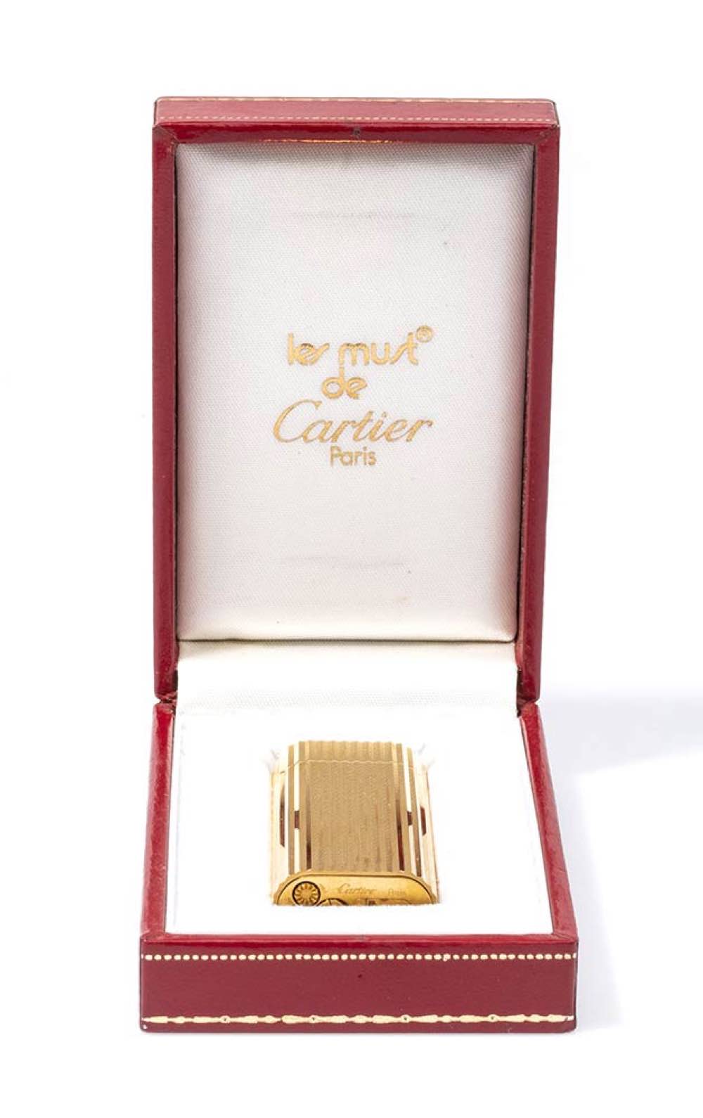 modello Pave, corpo godronato placcato in oro. Seriale 71959X. Dimensioni 6 x 2,5 x 1,2 cm. Scatola originale Cartier. Stato di conservazione: ***** eccellente.