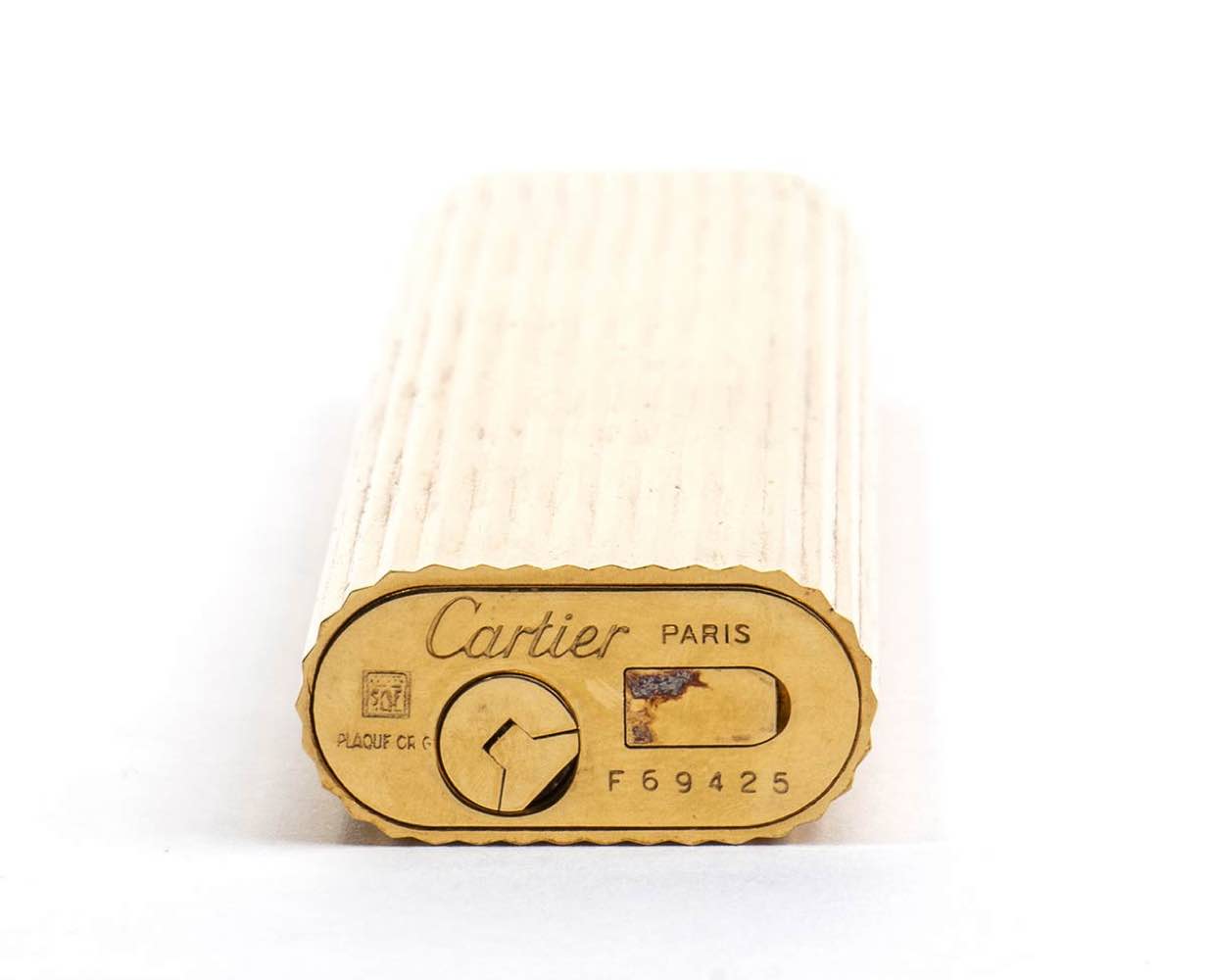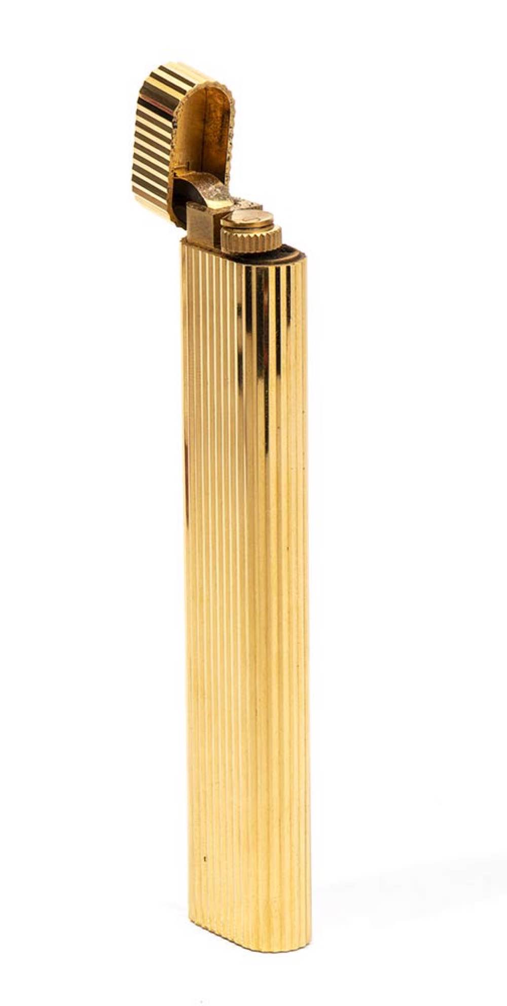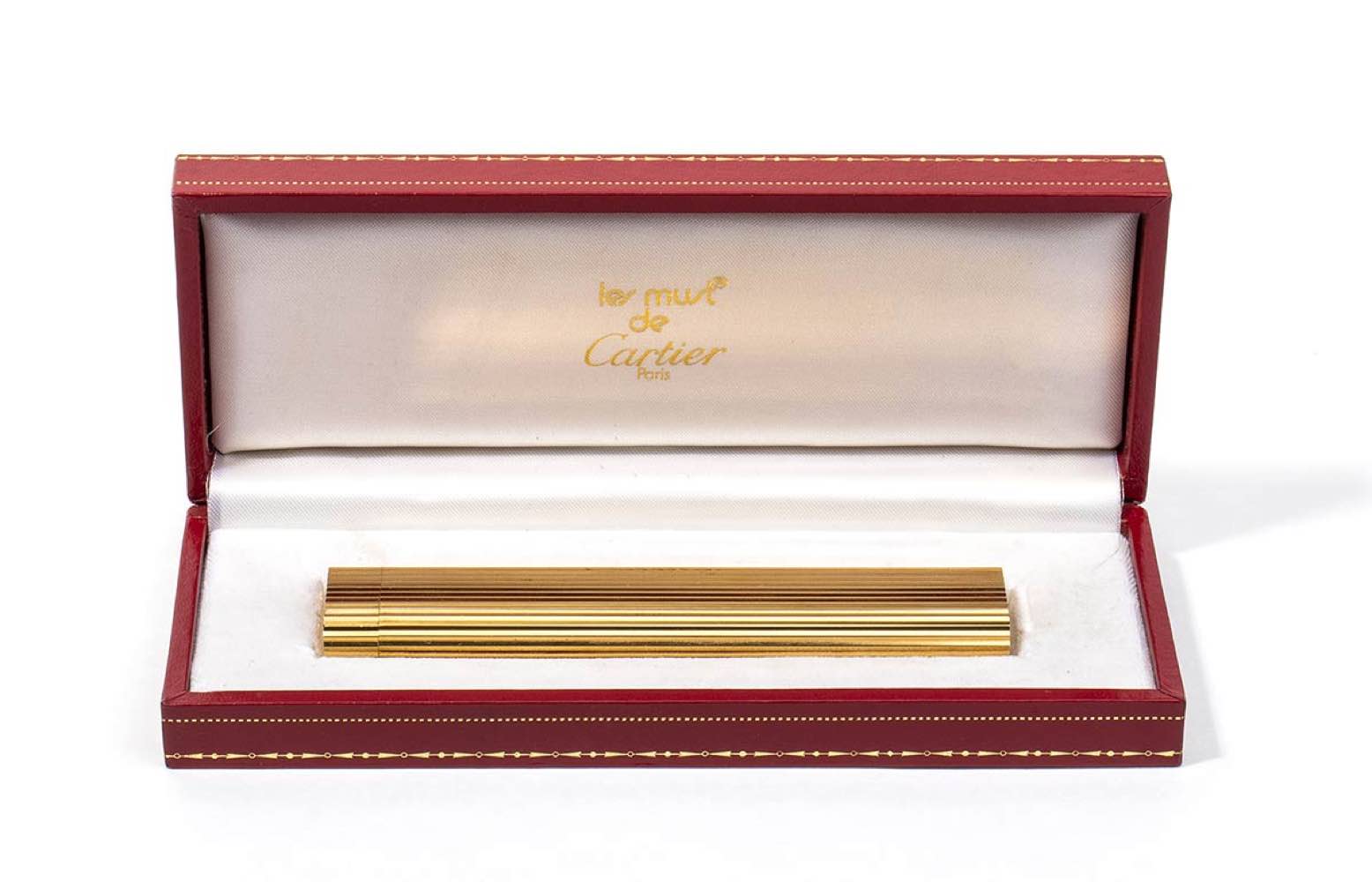 modello Pave, corpo godronato placcato in oro. Numero di serie F69425. Lunghezza 12,3 cm. larghezza 2,5 cm. Stato di conservazione: ***** eccellente. Scatola, controscatola e istruzioni originali Cartier.