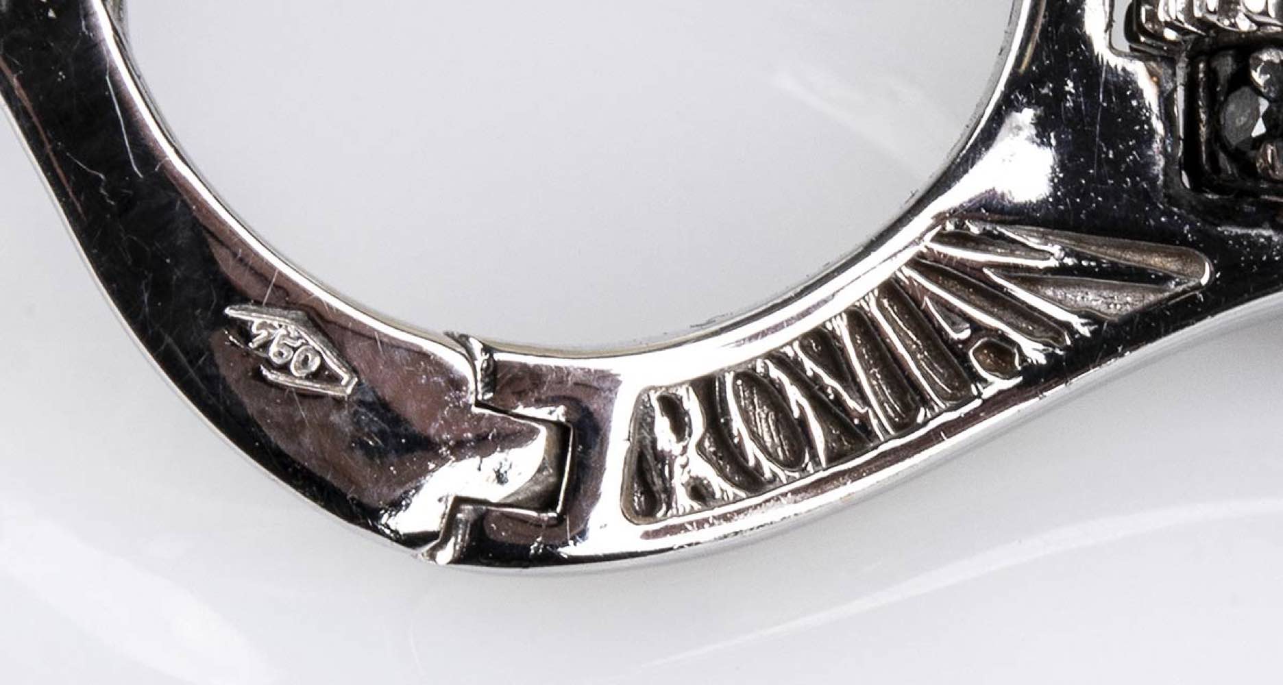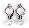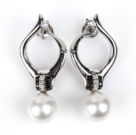in oro bianco 18k, ciascuno con perla coltivata d'acqua dolce e diamanti taglio brillante incolori e neri. Diamanti incolori 0,48 ct circa, G, VVS-VS. Diamanti neri 0,47 ct circa. Diametro perle 13,5 mm. Dimensioni 45 x 20 mm. Peso 27,1 gr. Stato di conservazione: ***** eccellente.