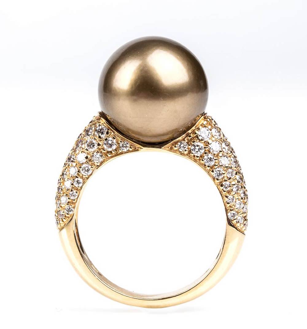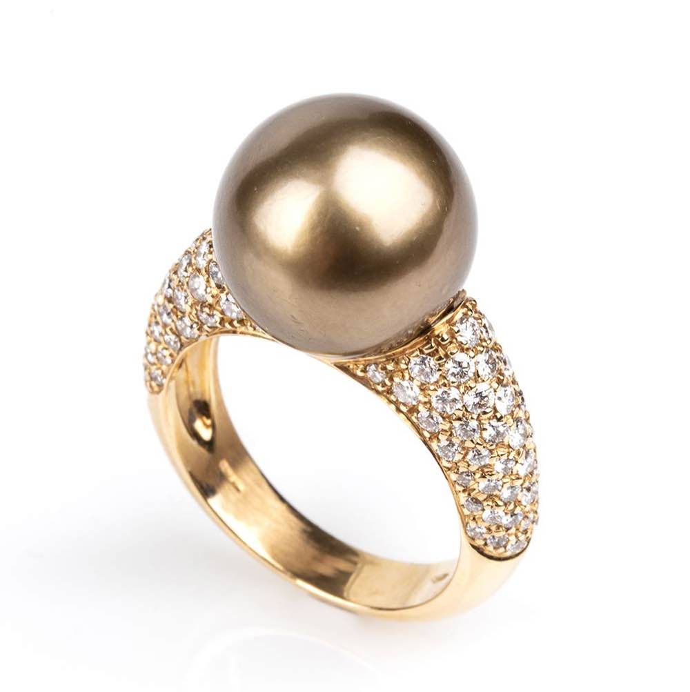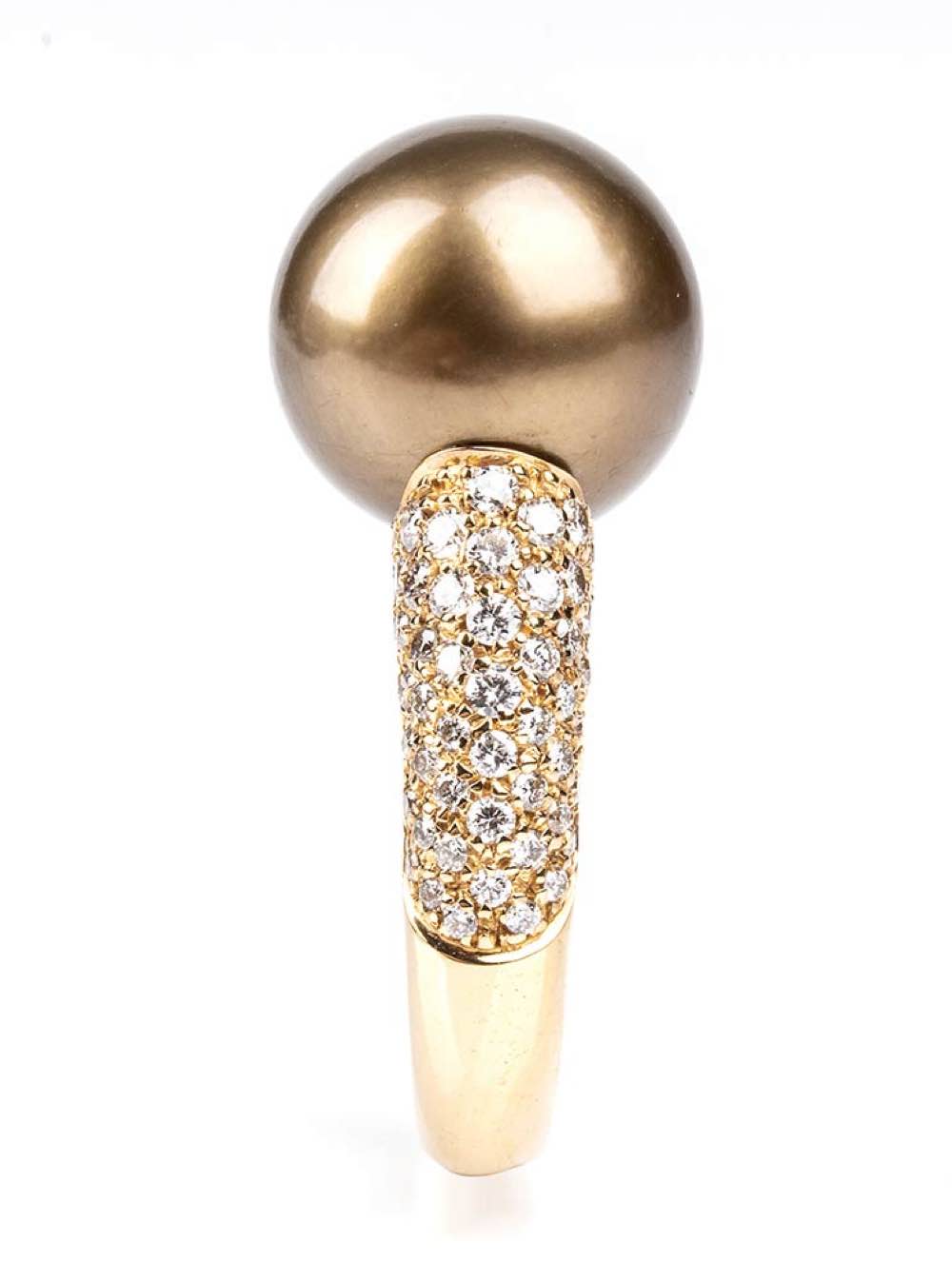 oro giallo 18k, con perla Tahiti affiancata da pavé di diamanti taglio brillante 0,96 ct circa, G, VVS-VS. Diametro perla 12,5-13 mm. Punzonato "750". Peso 10,1 gr. Misura IT 15 - Misura US 7. Stato di conservazione: ***** eccellente.