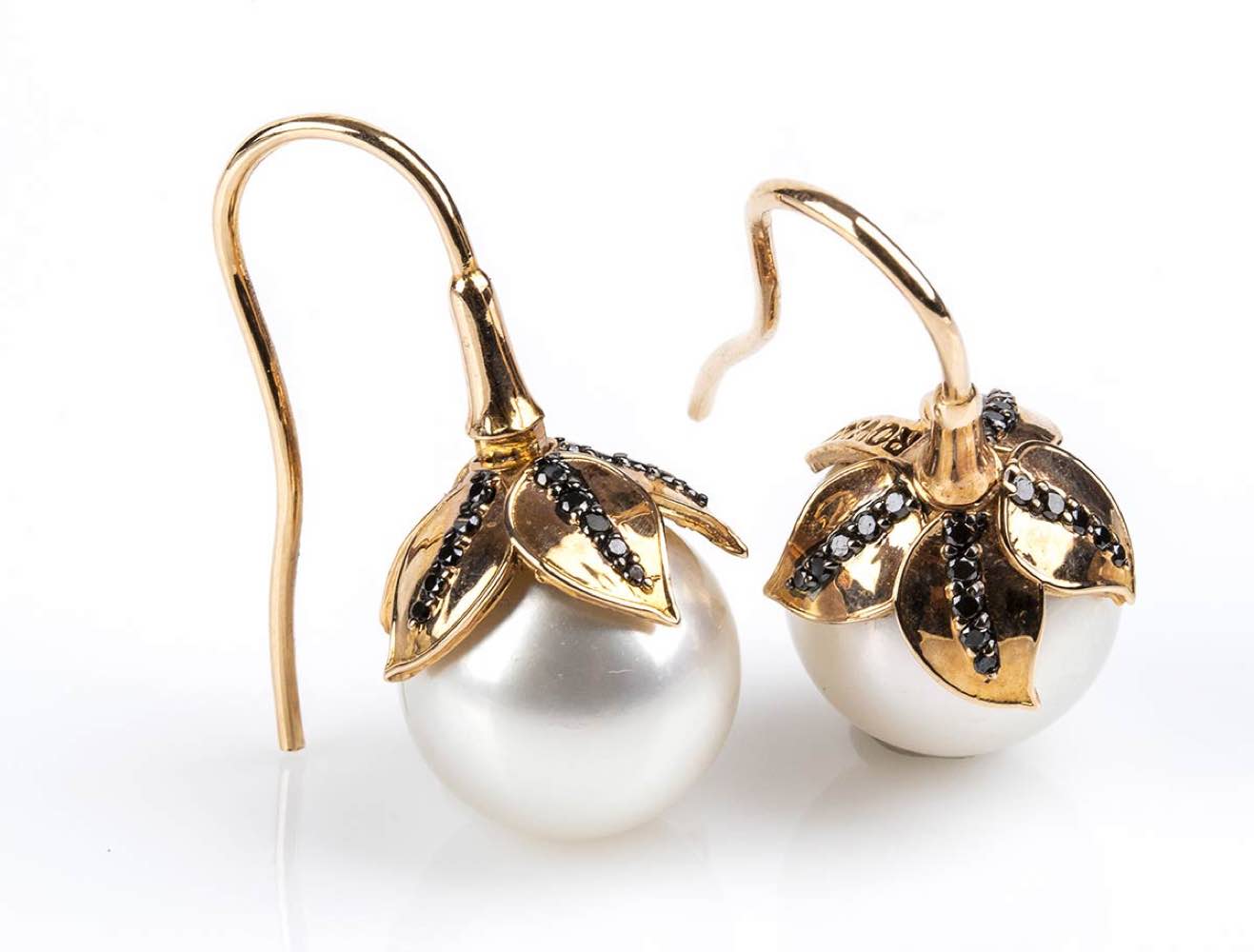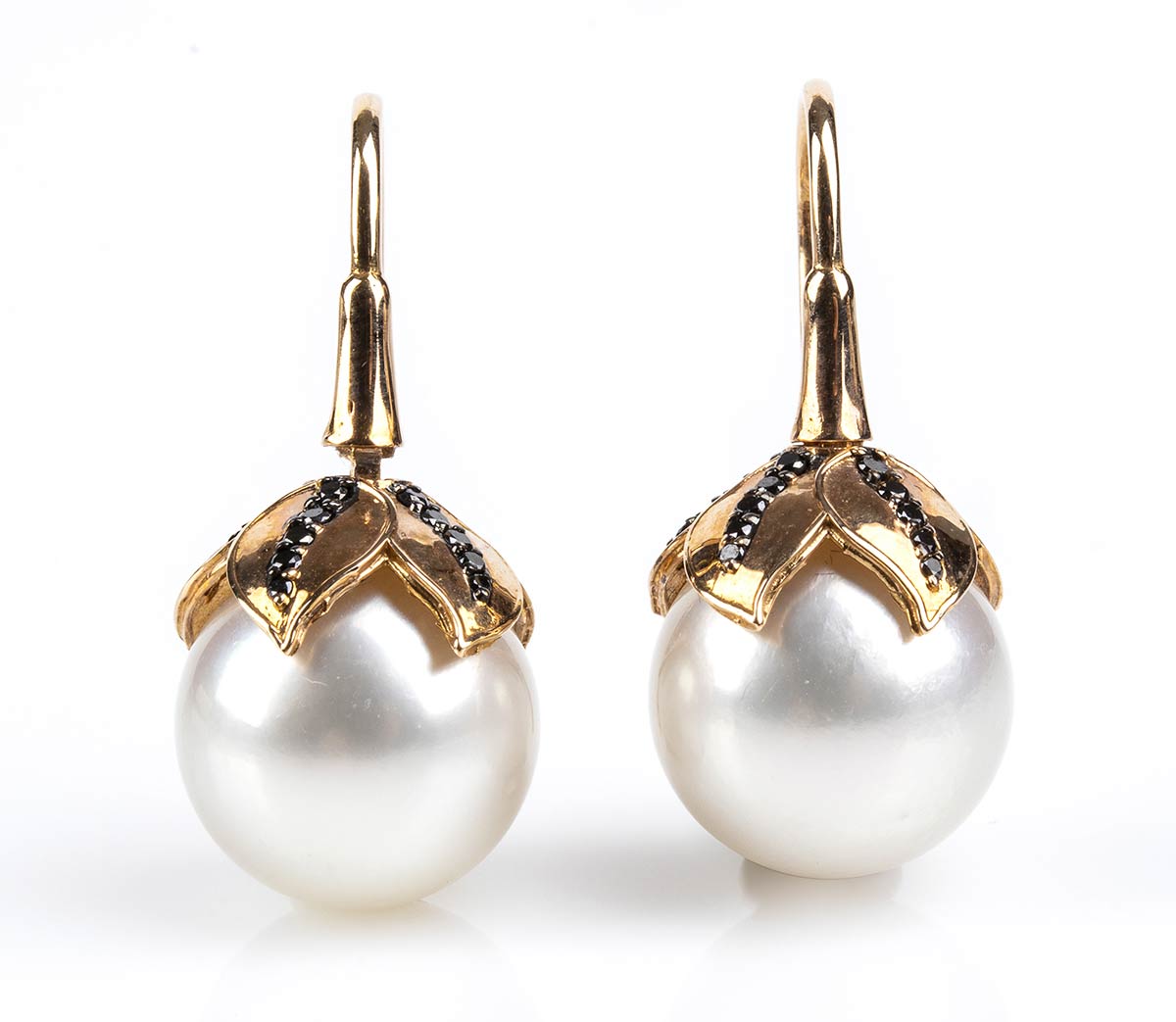 oro giallo 18k, ciascuno con perla Australiana sormontata da foglioline in pavé di diamanti neri 0,26 ct circa totali. Diametro perle 12-12,5 mm. Punzonati "ROVIAN". Lunghezza 27 mm. Peso 10 gr. Stato di conservazione: ***** eccellente.