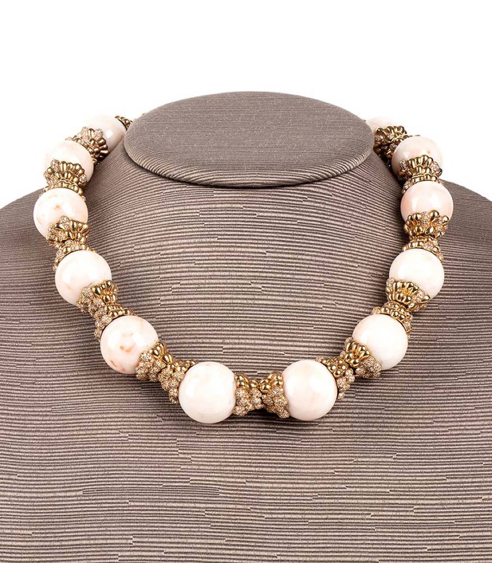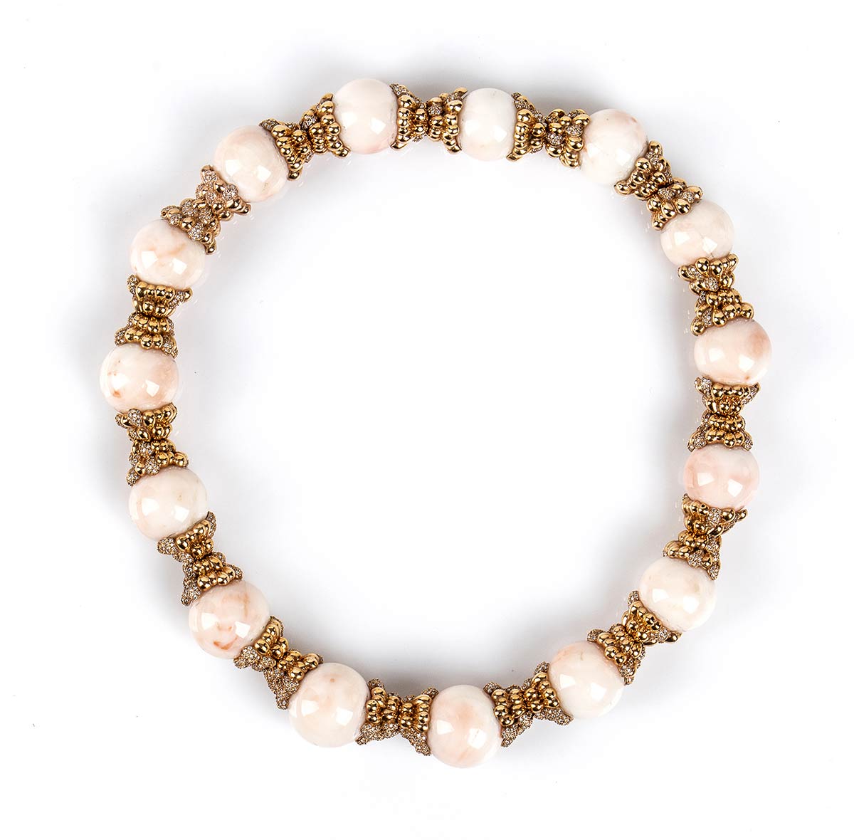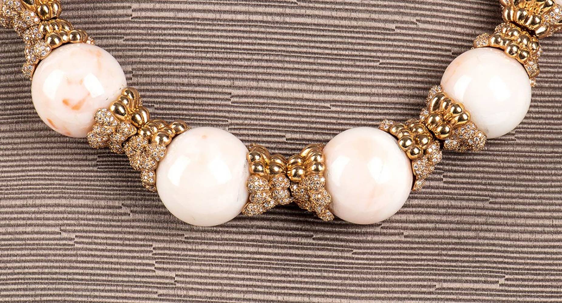 Sfere di corallo rosa (corallium secundum) separate da distanziali milligranati oro giallo 18 k incastonati con diamanti taglio brillante 13,10 ct circa, H, VS-SI. Punzonato "750" e "307 NA". Diametro sfere di corallo 10,5-10-9,3-7,6 mm. Lunghezza 46,5 cm. Peso 314,5 gr. Stato di conservazione: ***** eccellente.