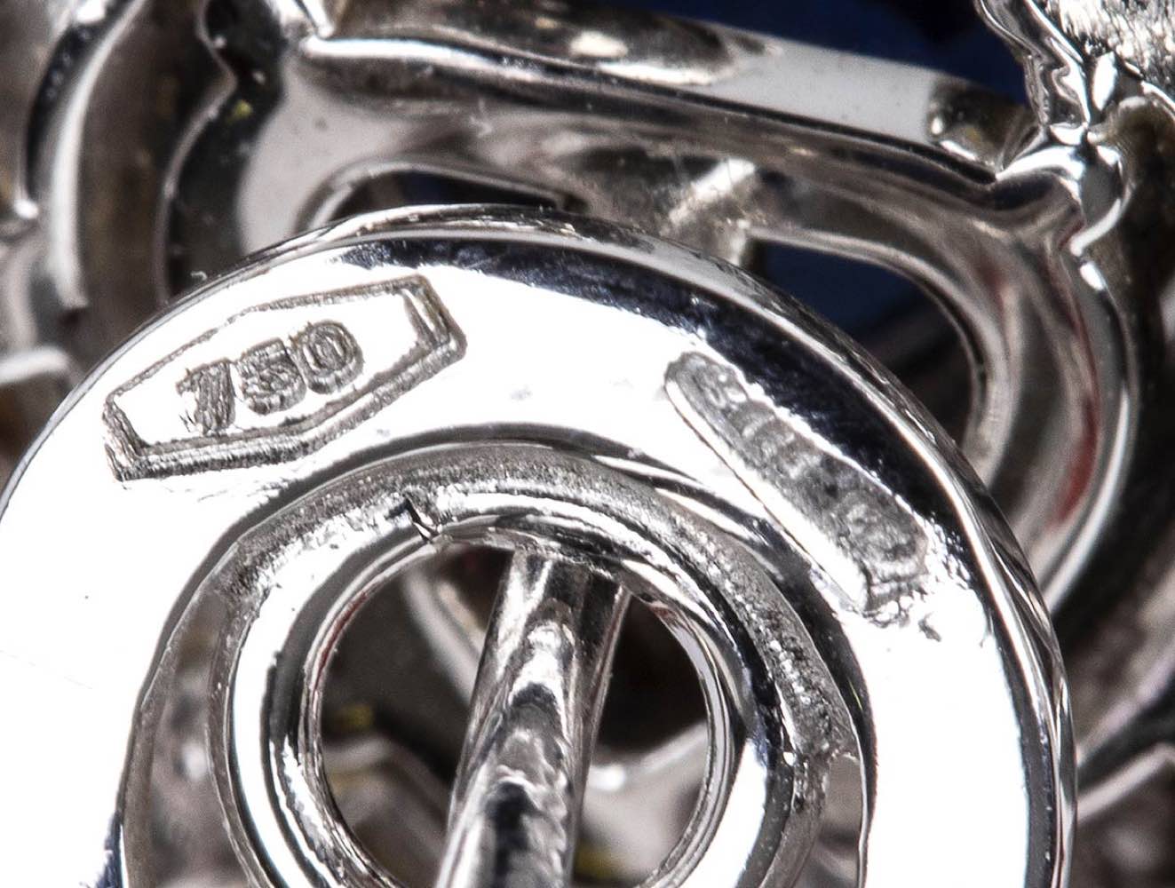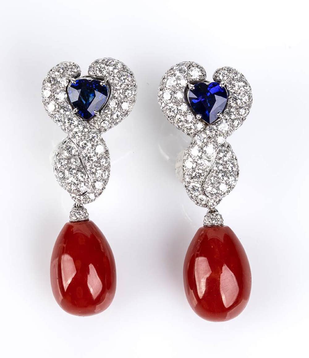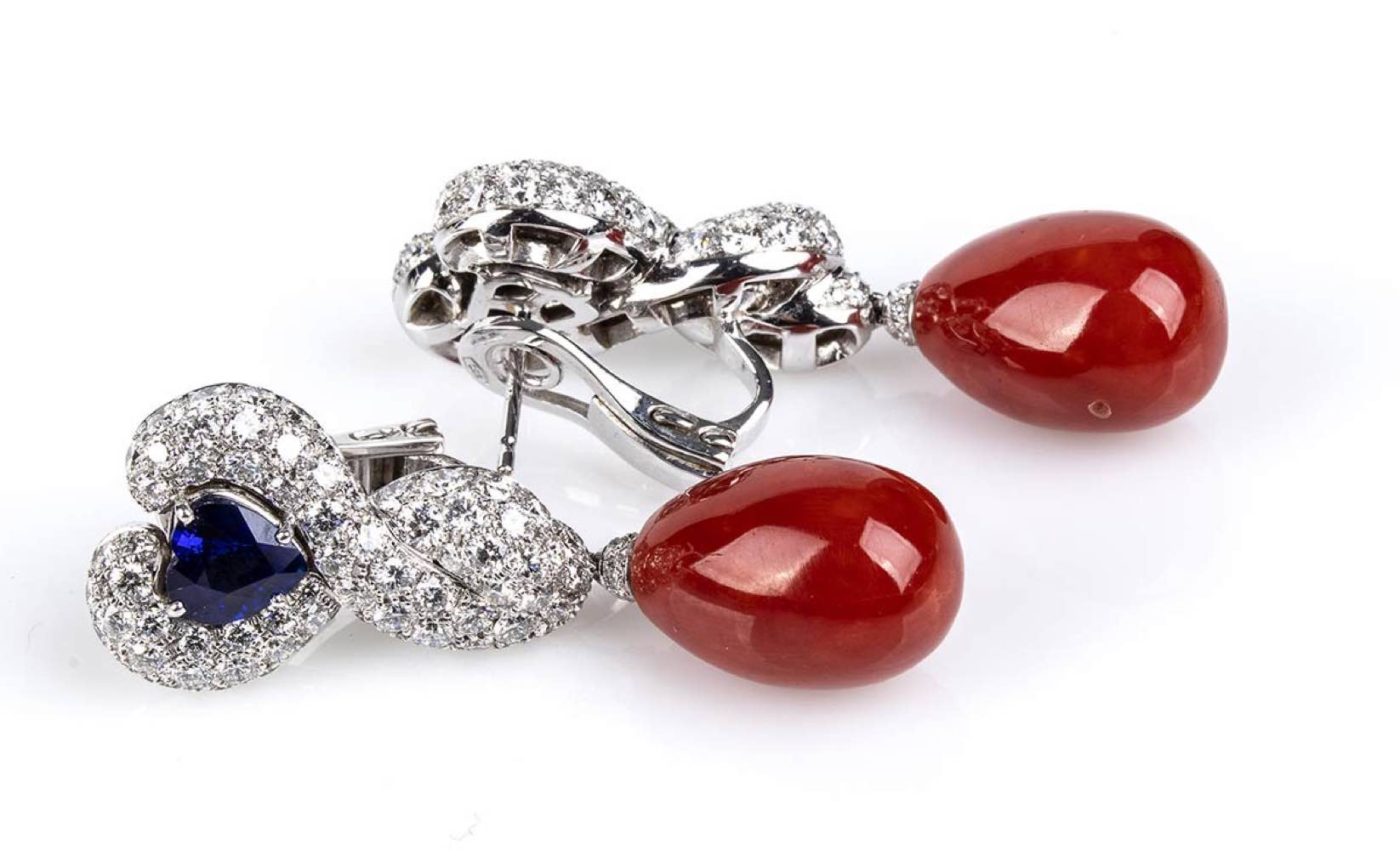oro bianco 18k, ciascuno con goccia di corallo Aka (corallium Japonicum) sormontata da nastro in pavé di diamanti taglio brillante 5,15 ct circa, G-H, VS e zaffiro a cuore per totali 2,47 ct circa. Punzonati "750" e "145 CE". Dimensioni orecchini 40 x 15 mm, dimensione gocce di corallo 15 x 11,7 mm. Peso 20,4 gr. Stato di conservazione: ***** eccellente.