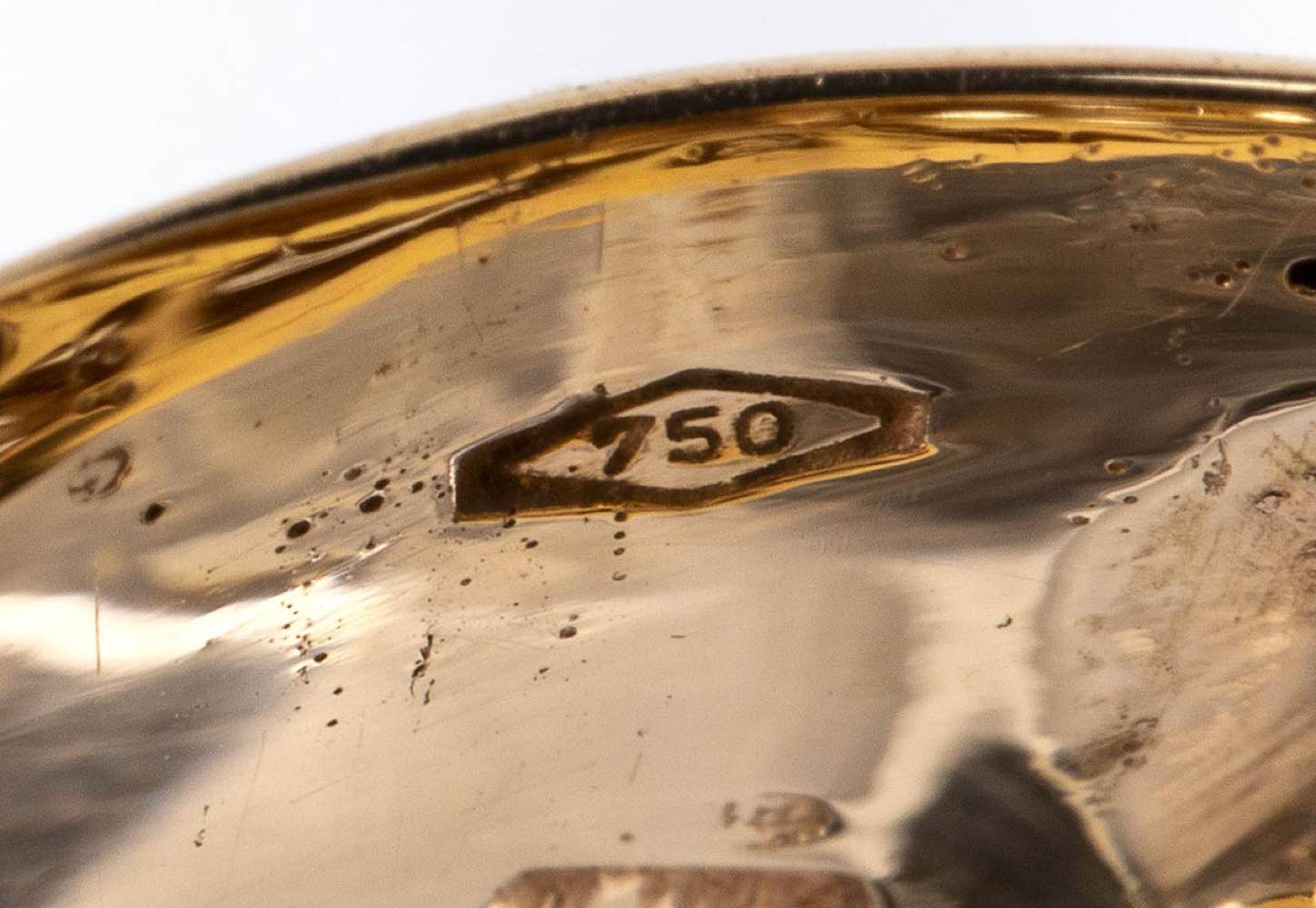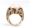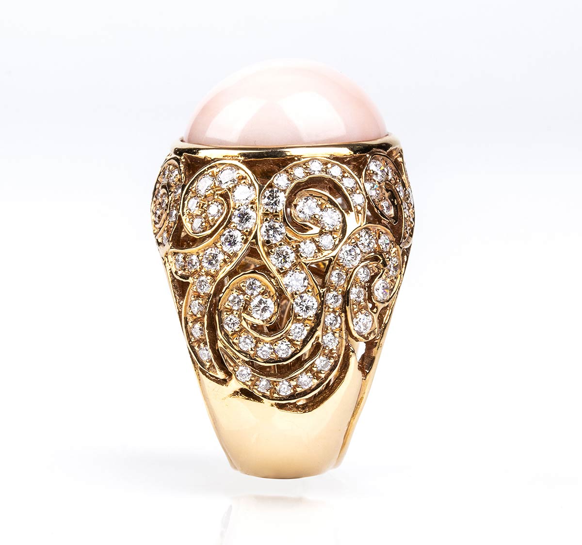 oro giallo 18k, incastonato con cabochon di corallo rosa "pelle d'angelo" (corallium secundum), montatura traforata a motivo di volute in diamanti taglio brillante 2,80 ct circa, G, VVS-VS. Punzonato "750", "ROVIAN" e "307 NA". Peso 22,2 gr. Misura IT 15 - Misura US 7. Stato di conservazione: ***** eccellente.