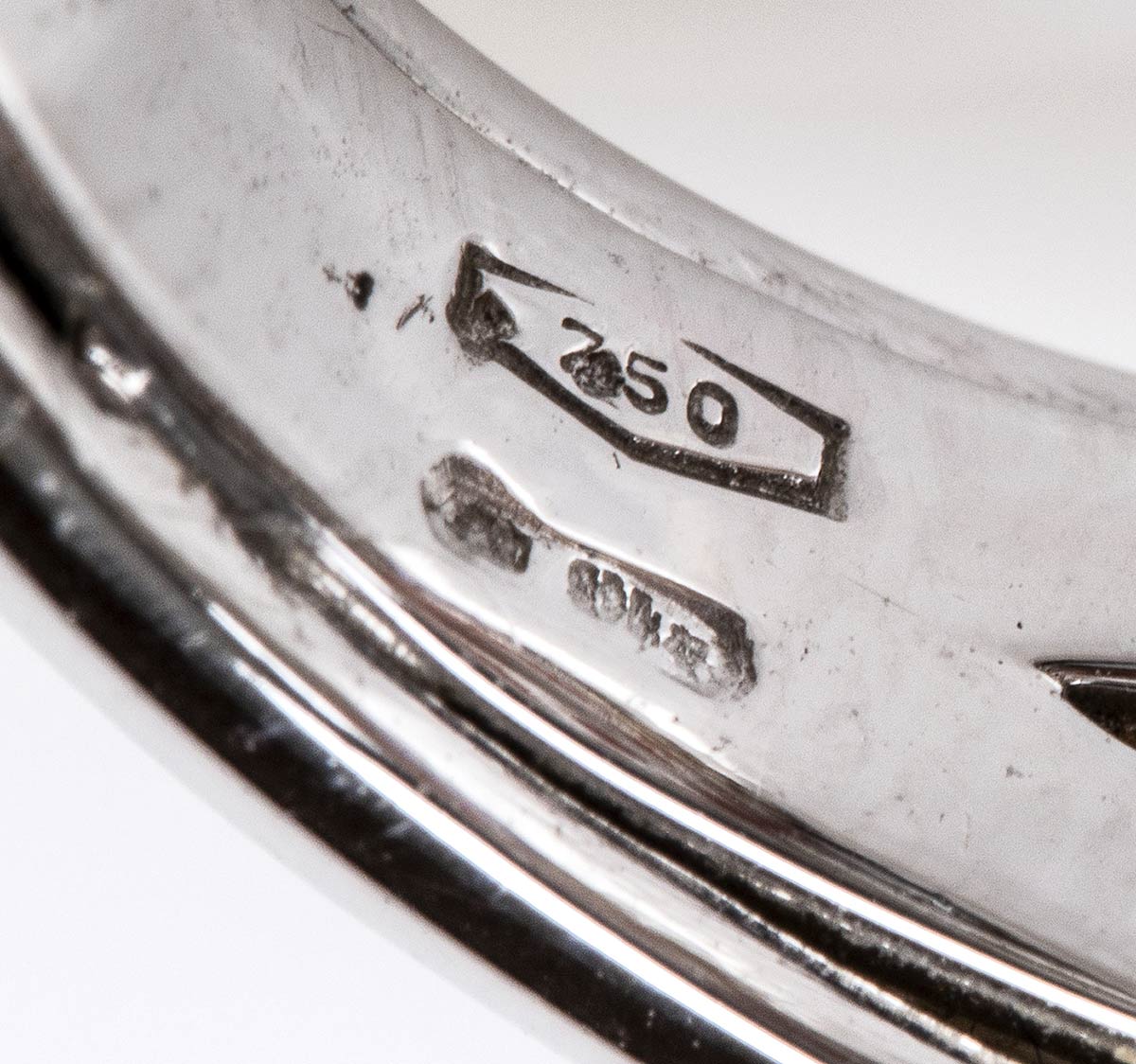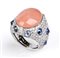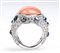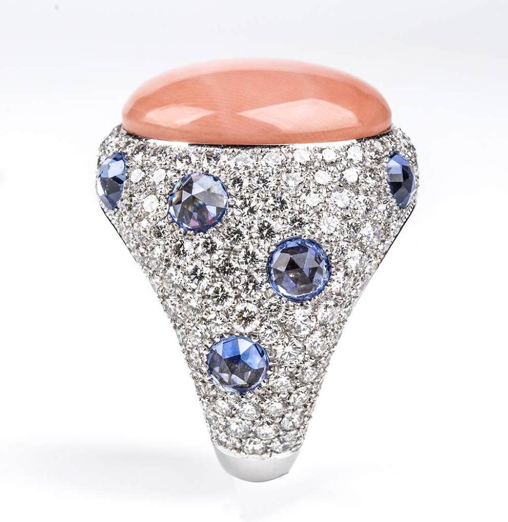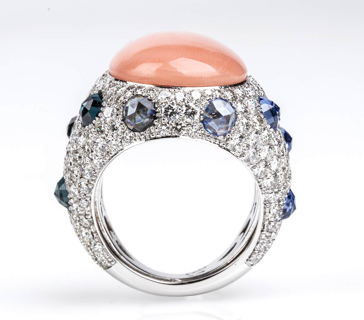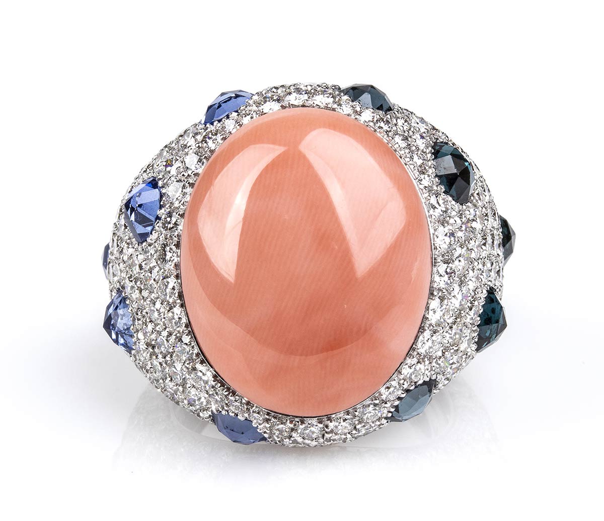 oro bianco 18k, incastonato con cabochon di corallo Cerasuolo (corallium elatius) contornato da pavé di diamanti e zaffiri. Diamanti taglio brillante 4,80 ct circa, G, VVS-VS. Zaffiri 3,75 ct circa. Punzonato "750". Dimensioni fronte 23 x 25 mm. Peso 16,5 gr. Misura IT 15 - Misura US 7,5. Stato di conservazione: ***** eccellente.