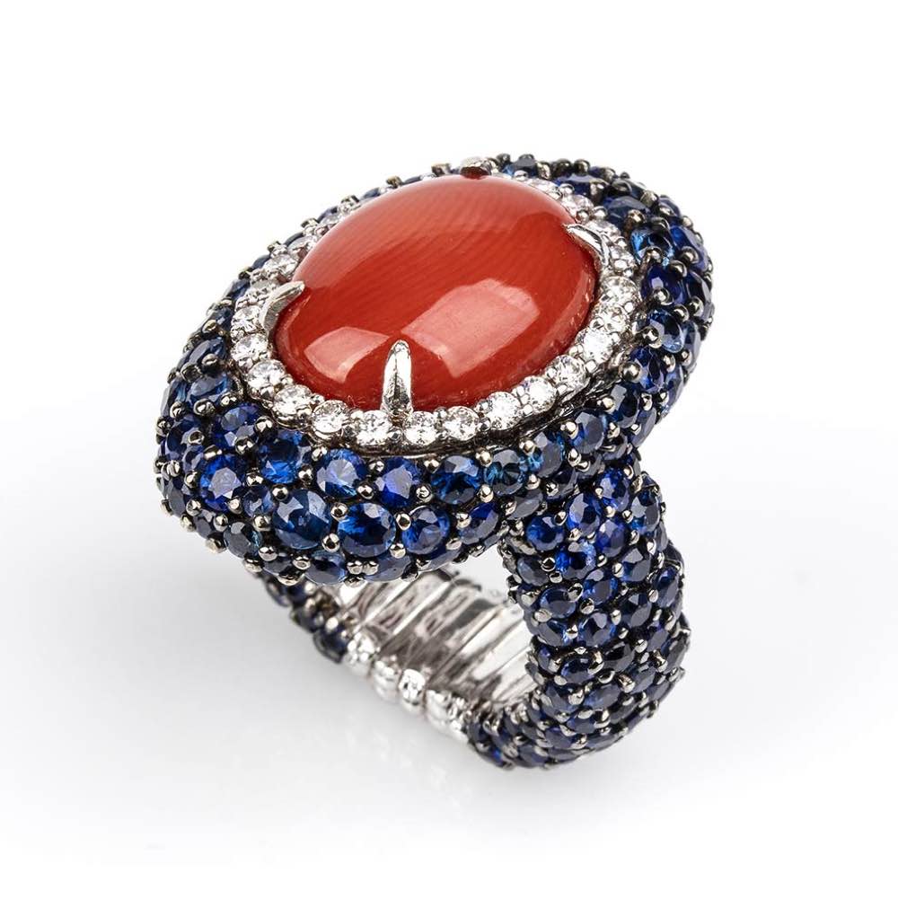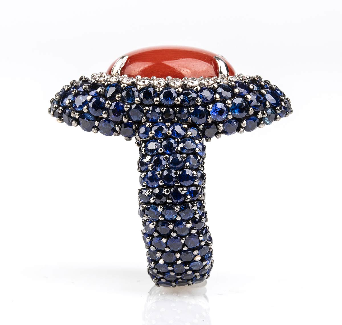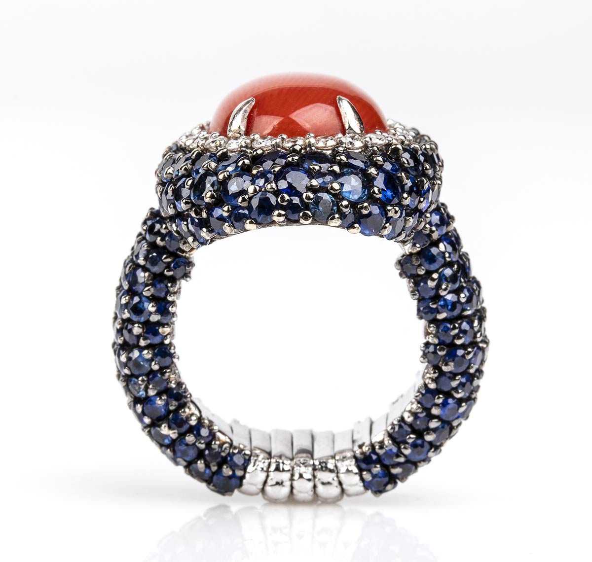 a fascia elastica in oro bianco 18k, incastonato con cabochon di corallo Mediterraneo (corallium rubrum) tra cornice di diamanti taglio brillante 0,48 ct circa, G, VVS-VS e pavé di zaffiri 6,97 ct circa. Dimensioni fronte 30 x 20 mm. Peso 19 gr. Stato di conservazione: ***** eccellente.