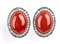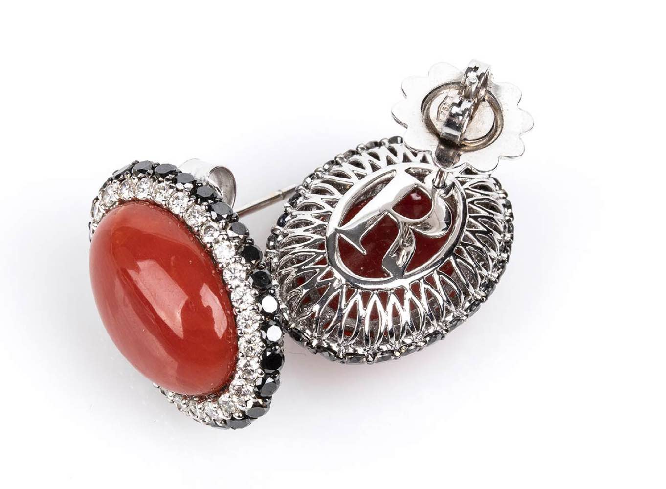in oro bianco 18k, incastonati con cabochon ovale di corallo Cerasuolo (corallium elatius) incorniciato da diamanti incolori e diamanti neri. Diamanti incolori taglio brillante 0,88 ct circa, G, VVS-VS. Diamanti neri taglio brillante 1,51 ct circa. Punzonato "750". Dimensioni 20 x 15 mm. Peso 8,6 gr. Stato di conservazione: ***** eccellente.