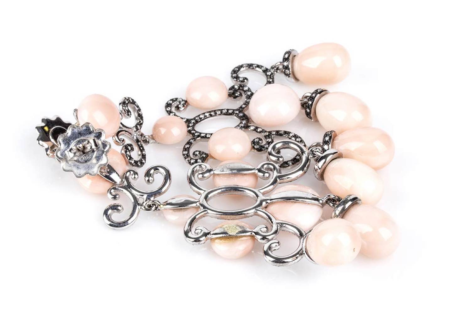 oro bianco 18k, motivo "chandelier" con gocce di corallo rosa (corallium secundum) e nastri in diamanti taglio brillante 1,80 ct circa totali, H, VS. Punzonati "750". Dimensioni 70 x 35 mm. Peso 35 gr. Stato di conservazione: ***** eccellente.