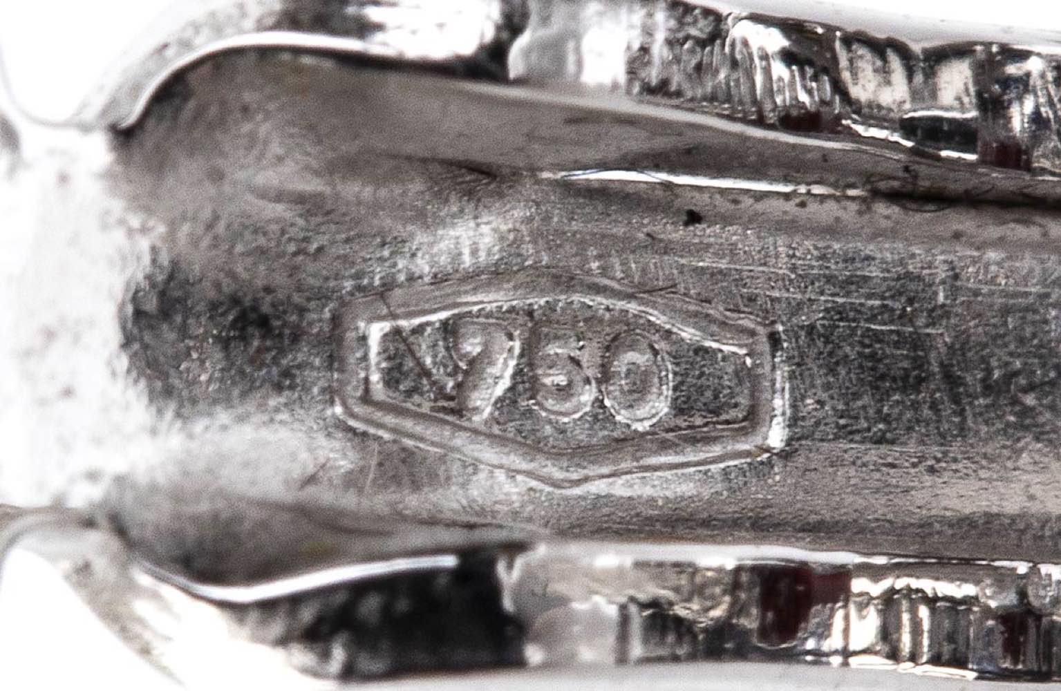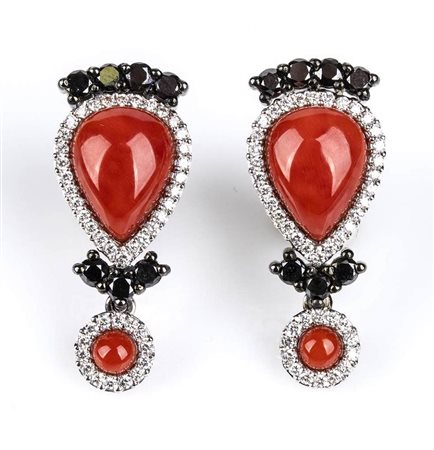 oro bianco 18k, ciascuno incastonato con cabochon di corallo Mediterraneo (corallium rubrum), contornato da diamanti bianchi 0,85 ct circa totali, G, VVS-VS e diamanti neri 1,27 ct circa. Punzonati "750". Dimensioni 30 x 12 mm. Peso 18,5 gr. Stato di conservazione: ***** eccellente.