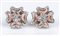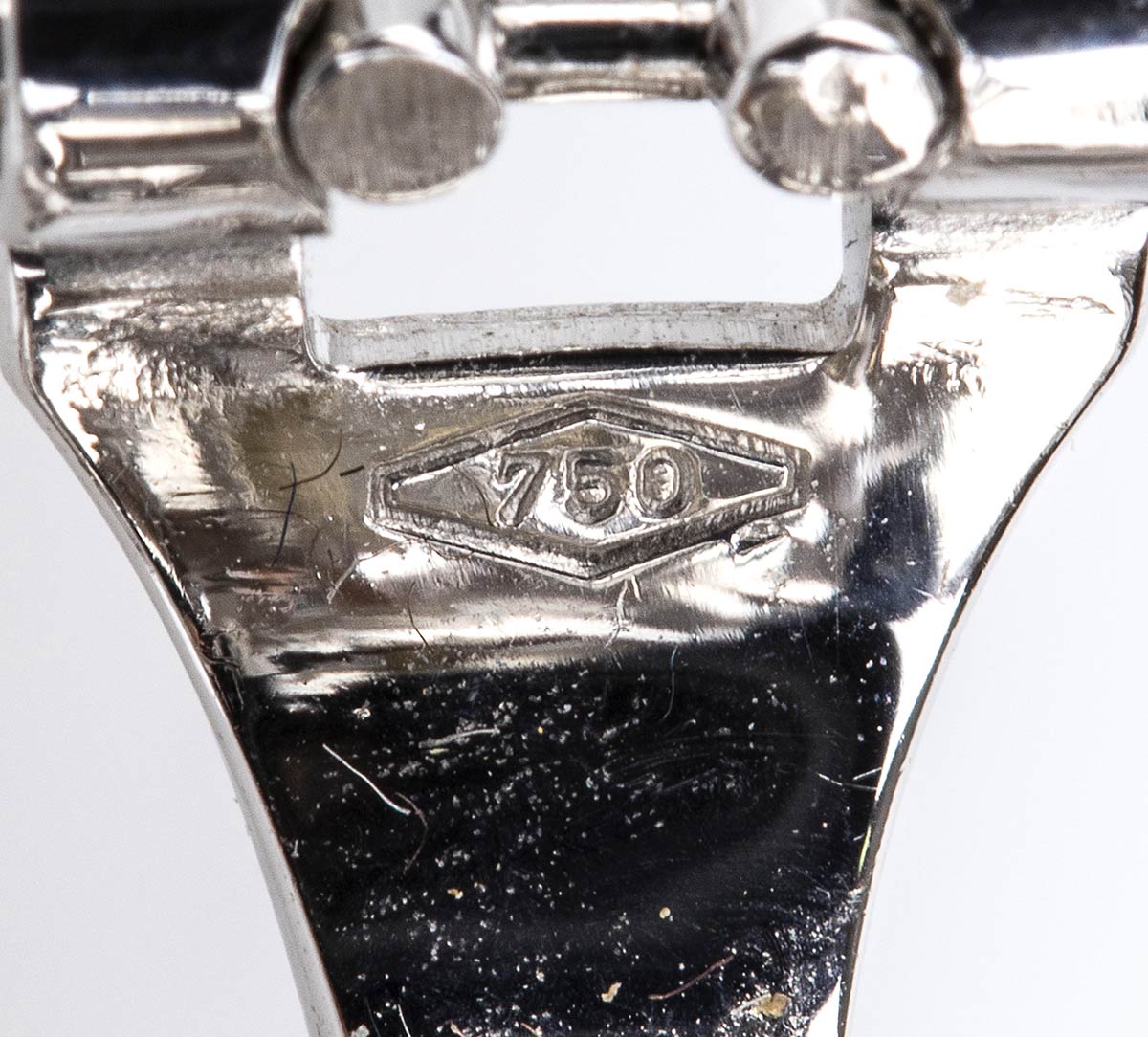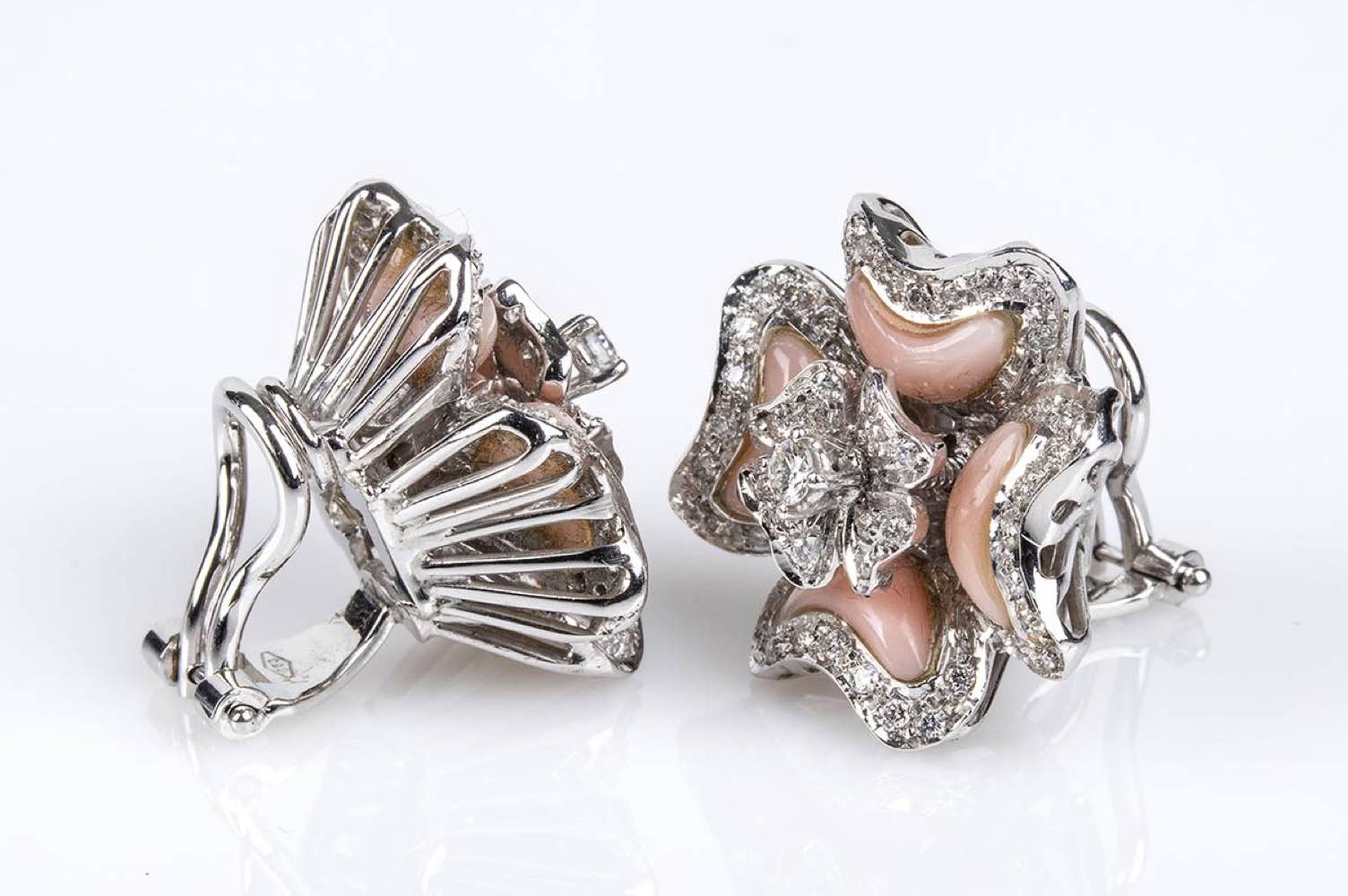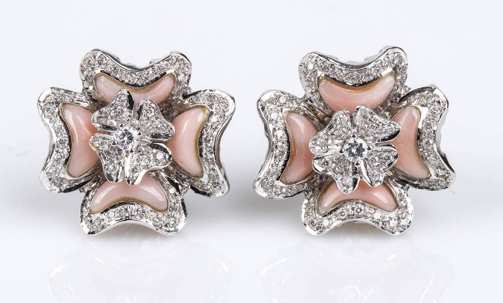 oro bianco 18k, motivo a fiore con inserti di corallo rosa (corallium regale) e dettagli in diamanti taglio brillante 0,60 ct circa, G, VS. Punzonati "750". Dimensioni 18 x 18 mm. Peso 14,5 gr. Stato di conservazione: ***** eccellente.