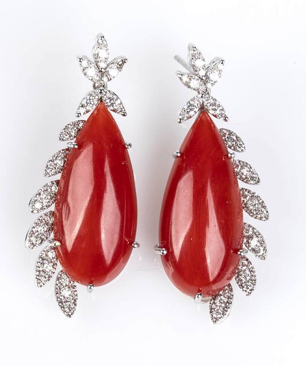 oro bianco 18k, ciascuno con goccia di corallo Mediterraneo (corallium rubrum) contornata da foglioline in diamanti taglio a navetta 0,68 ct circa totali, G, VVS-VS. Punzonati "750". Dimensioni 35 x 15 mm. Peso 24,3 gr. Stato di conservazione: ***** eccellente.