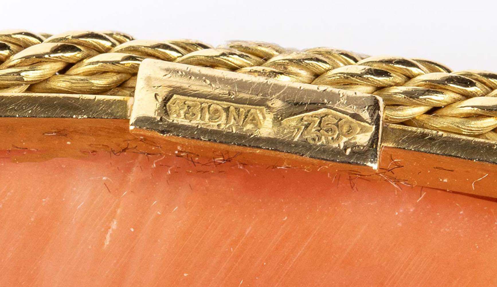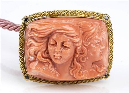 oro giallo 18k, di forma ovale, incastonata con cammeo scolpito in corallo Cerasuolo (corallium elatius) raffigurante un profilo femminile con capelli mossi; incastonata con diamanti neri 0,15 ct circa. Punzonato "750", "319 NA". Dimensioni 40 x 35 mm. Peso 33,7 gr. Stato di conservazione: ***** eccellente.